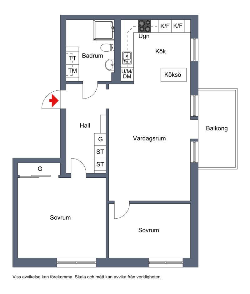 Ekparkett och ljusa väggar. Plats för soffa, mediamöbel, TV, matbord eller annat önskat möblemang. Ljusinsläpp via fönsterpartier samt utgång till bostadens balkong.