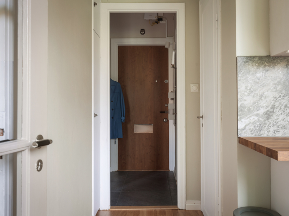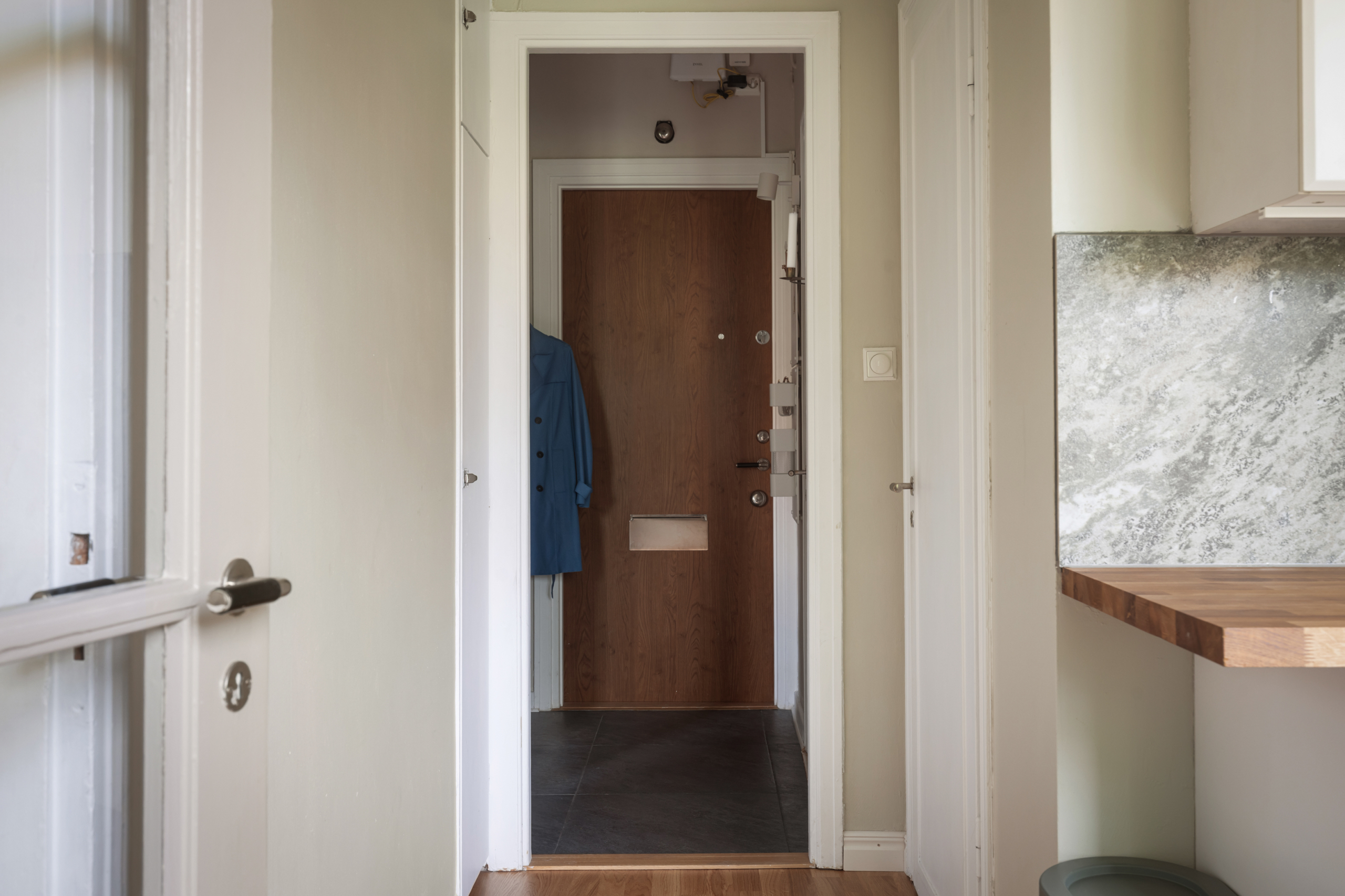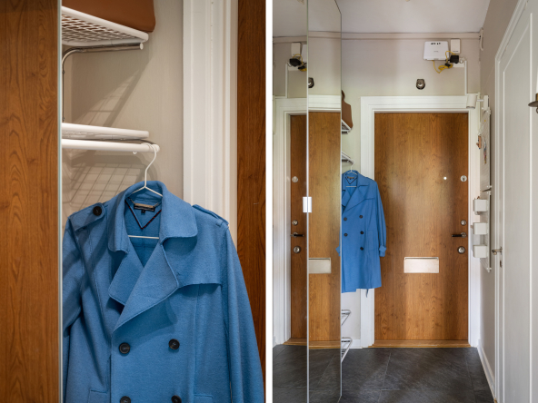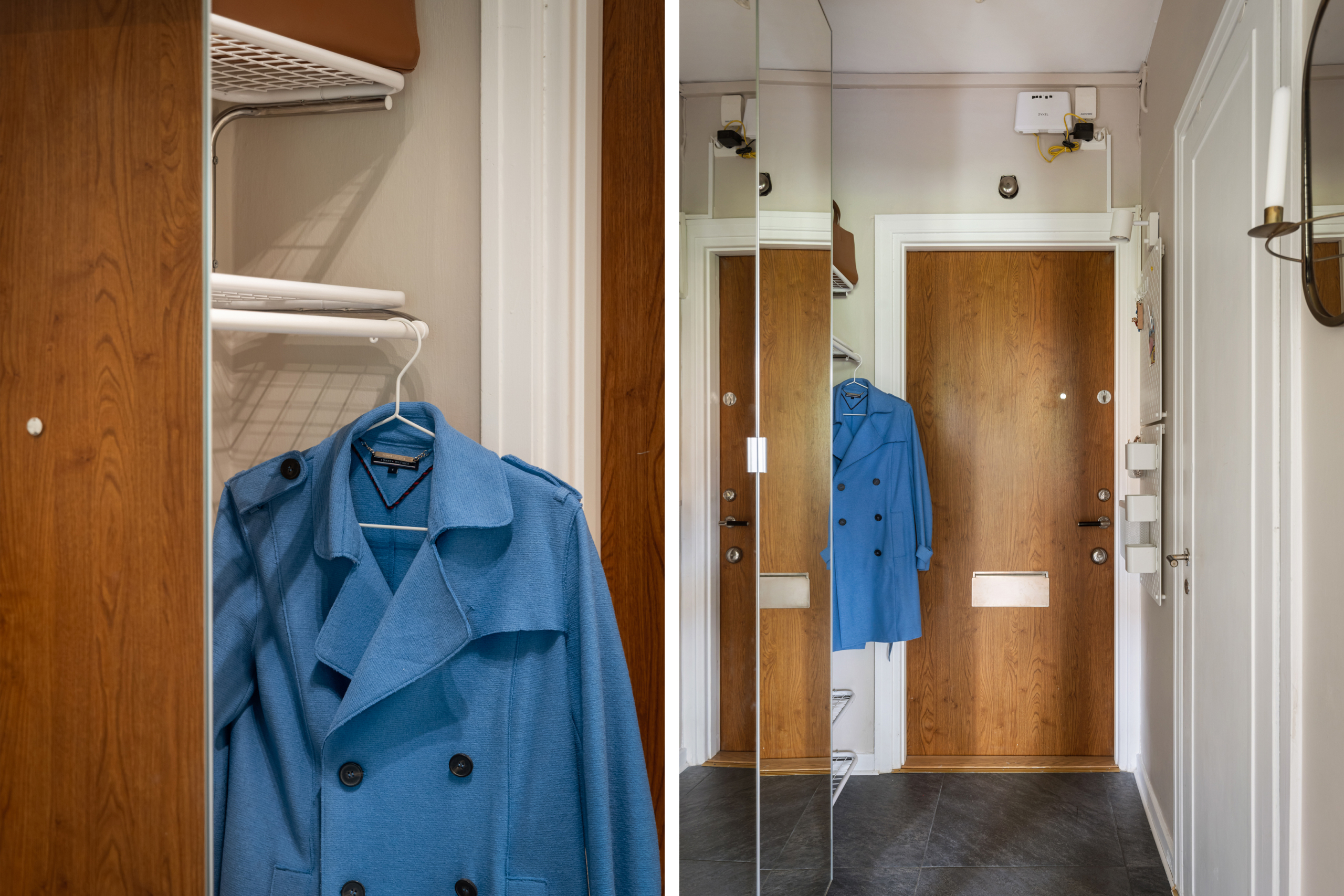 Ljusa väggar och mörkt klinkergolv. Plats för avhängning av kläder och förvaring i garderob.
