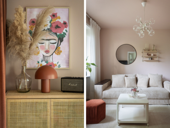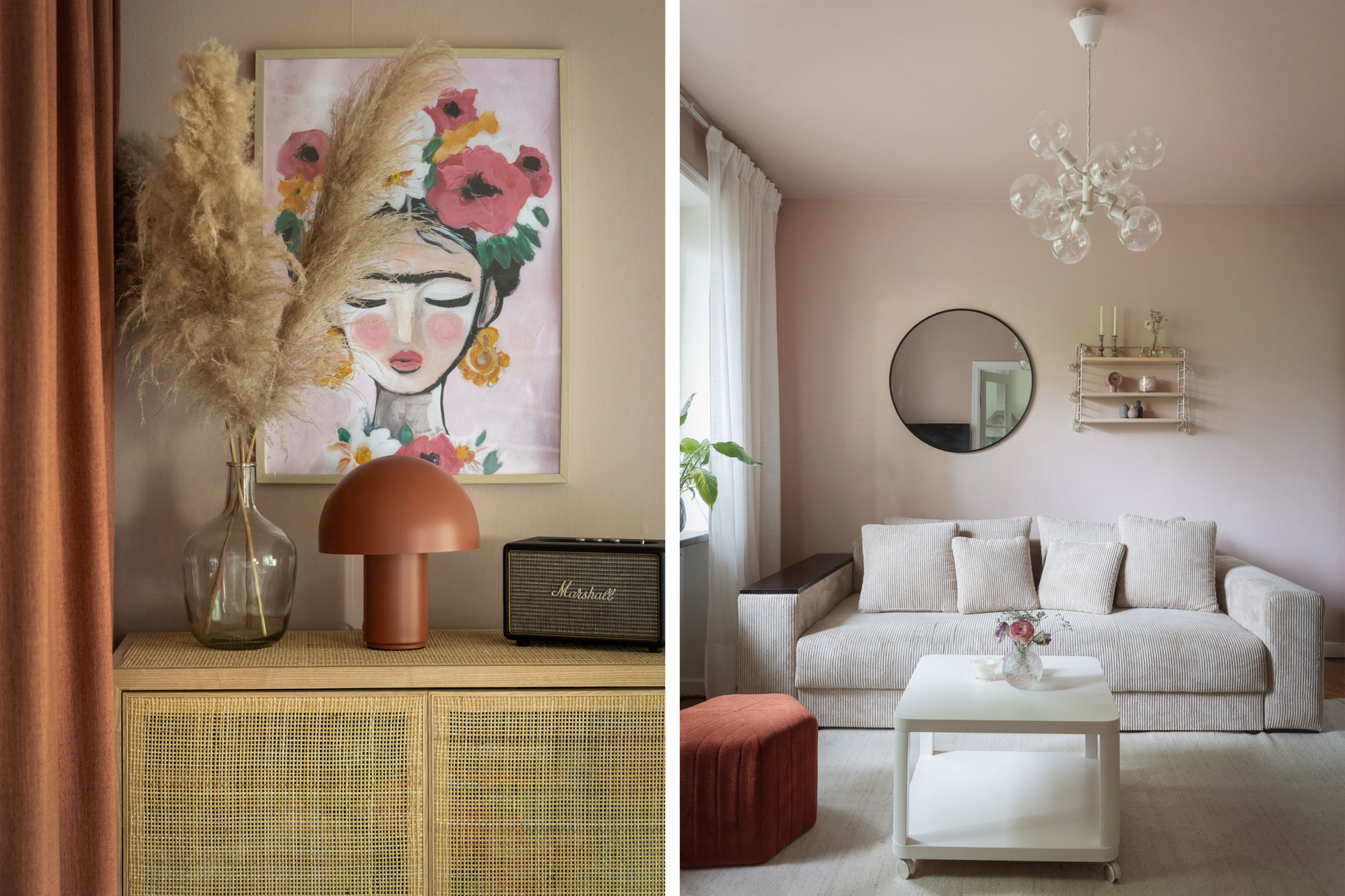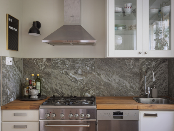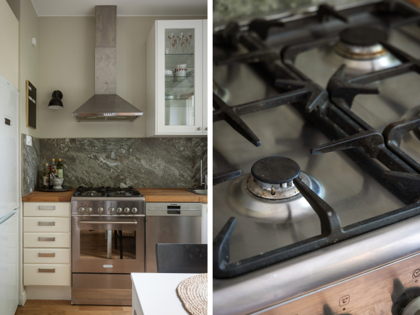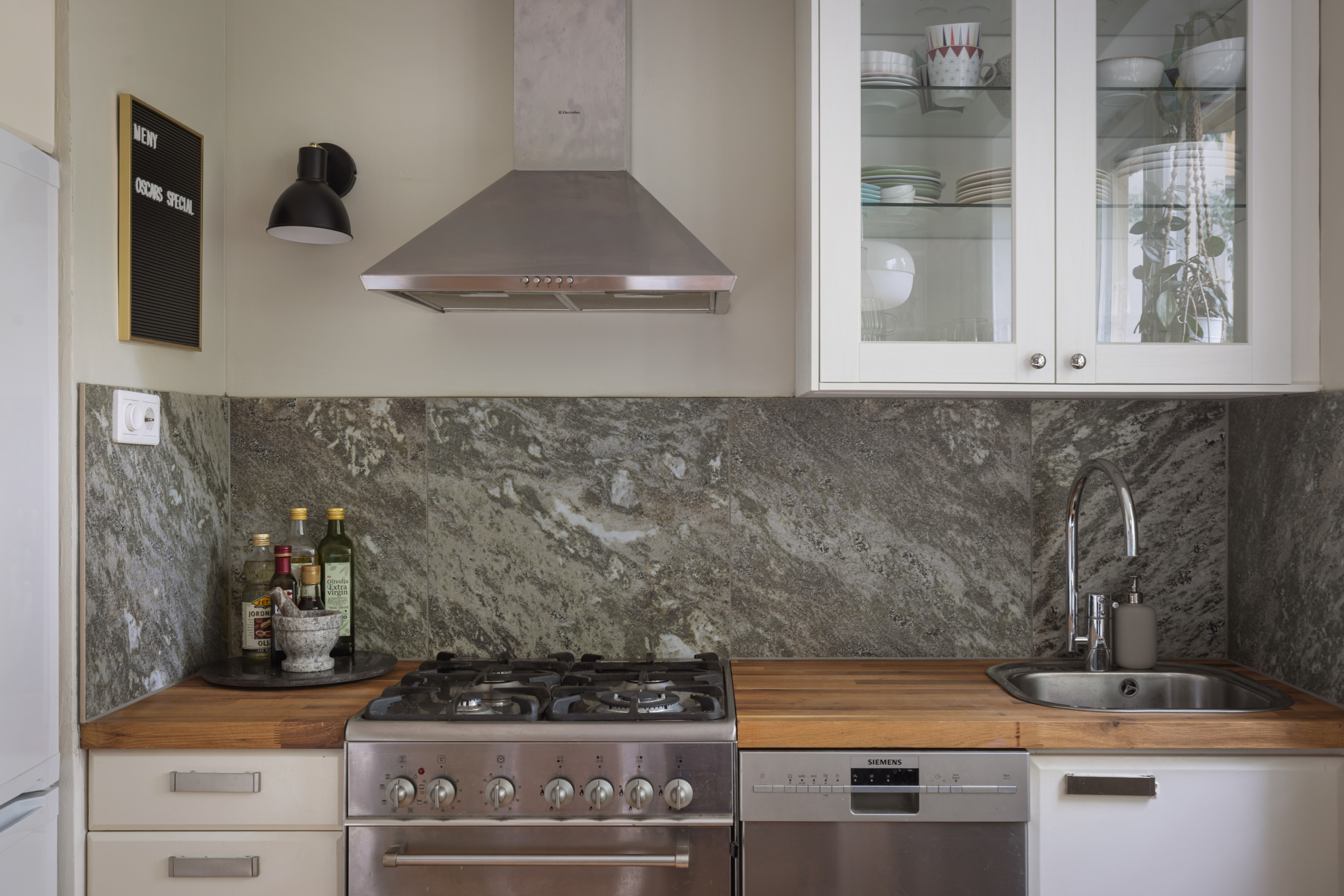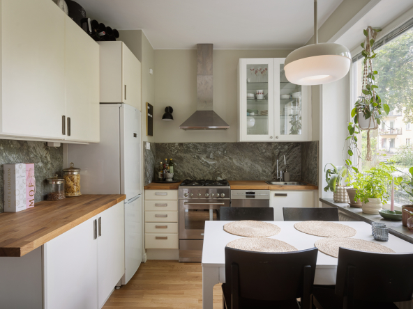 • I köket är golv, bänkskiva och stänkskydd från 2024
