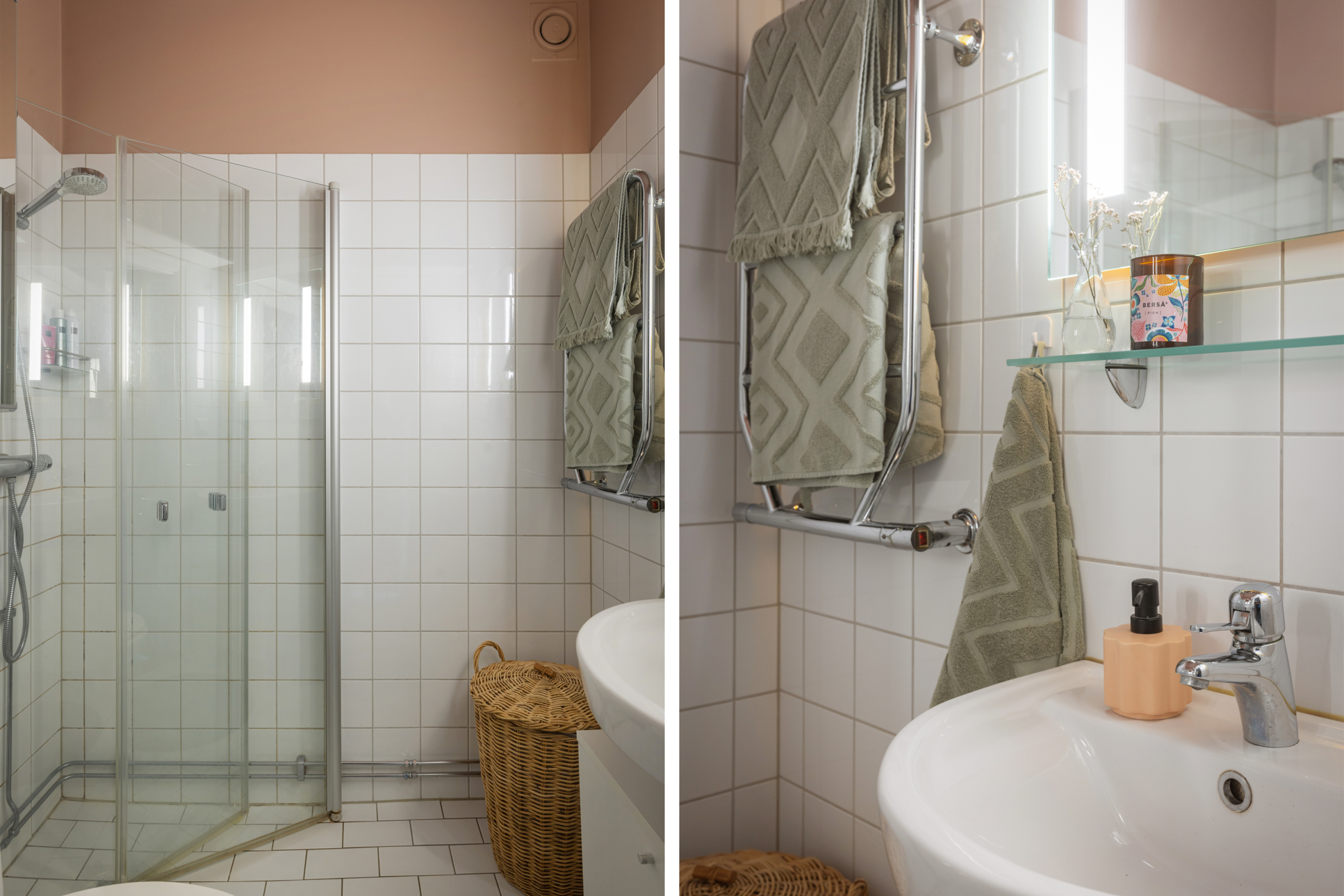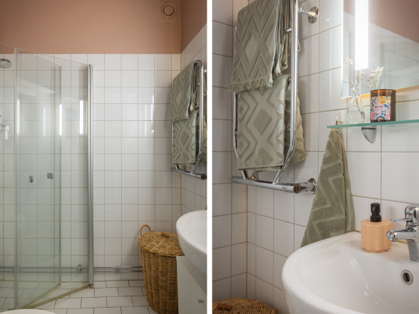 Ljust kaklade väggar och ljust klinkergolv. Utrustat med WC, dusch, handdukstork, handfat med kommod och spegel.