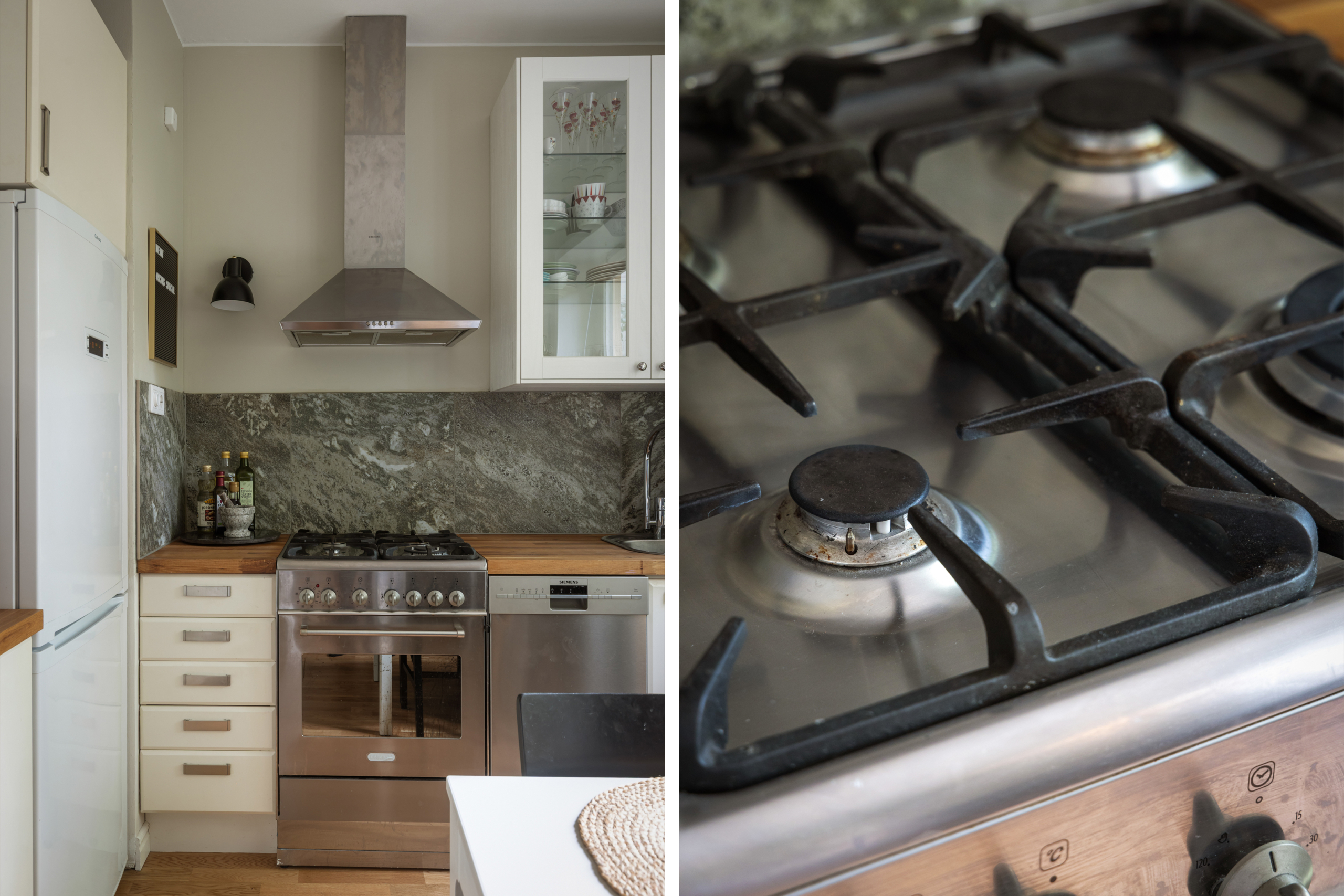 Parkettgolv och ljusa väggar. Förvaring i ljusa över och underskåp. Bänkskiva i trä och stänkskydd i granitkeramik. Utrustat med kyl & frys, ugn, gasspis, fläkt och diskmaskin. Plats för matbord och stolar. Ljusinsläpp via fönsterpartier.