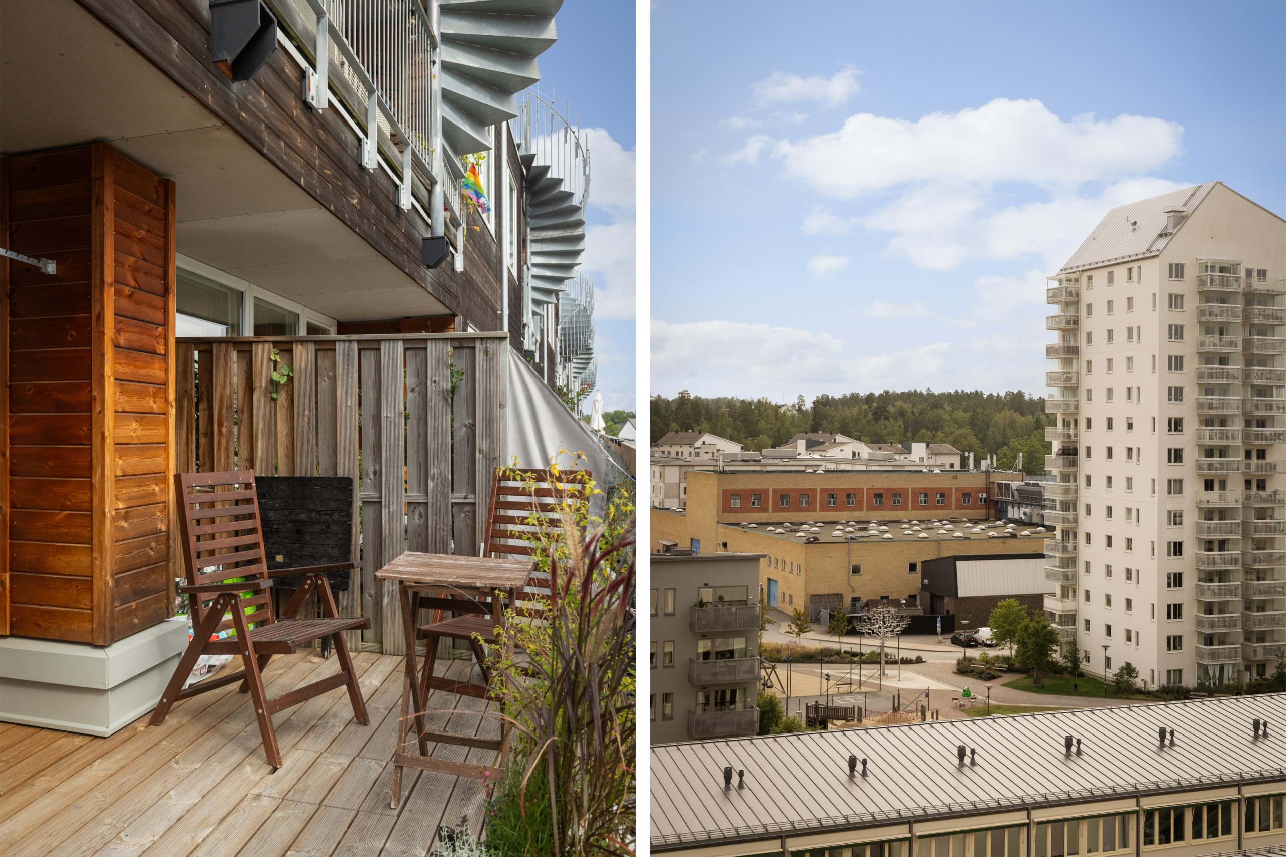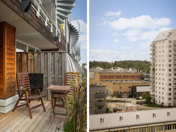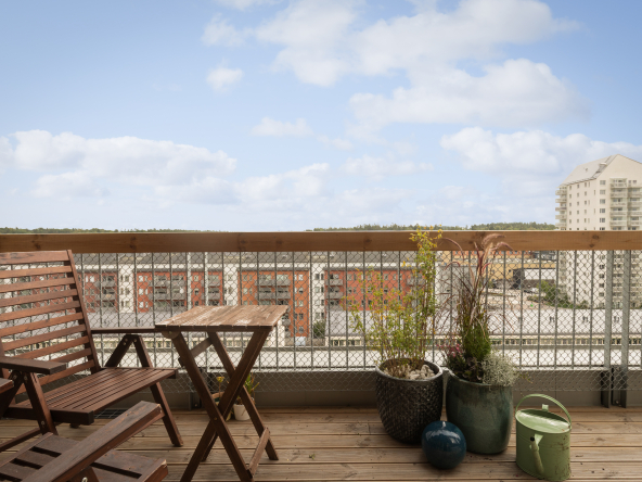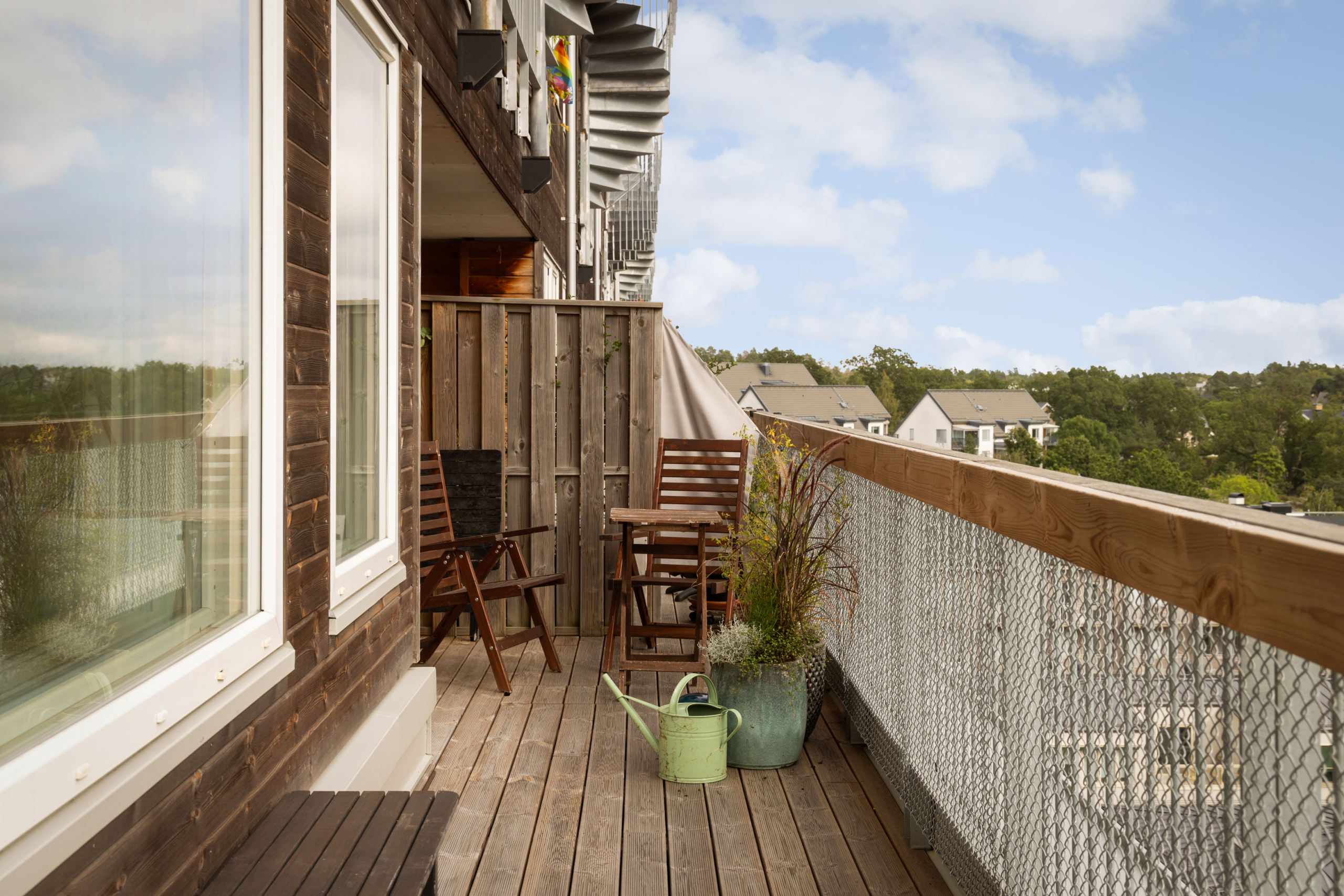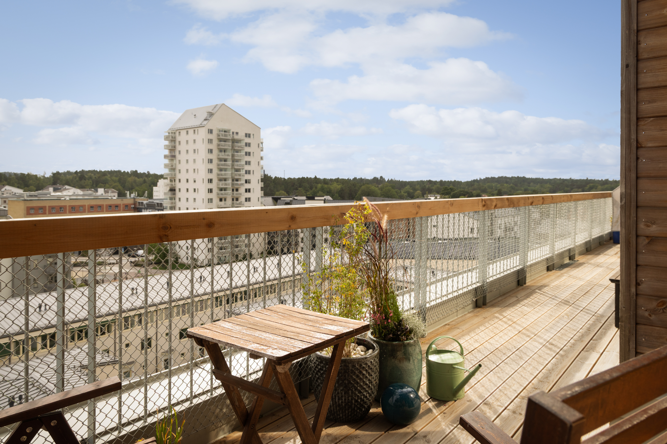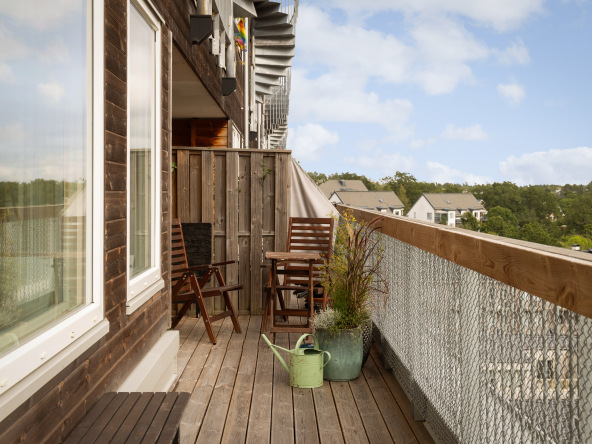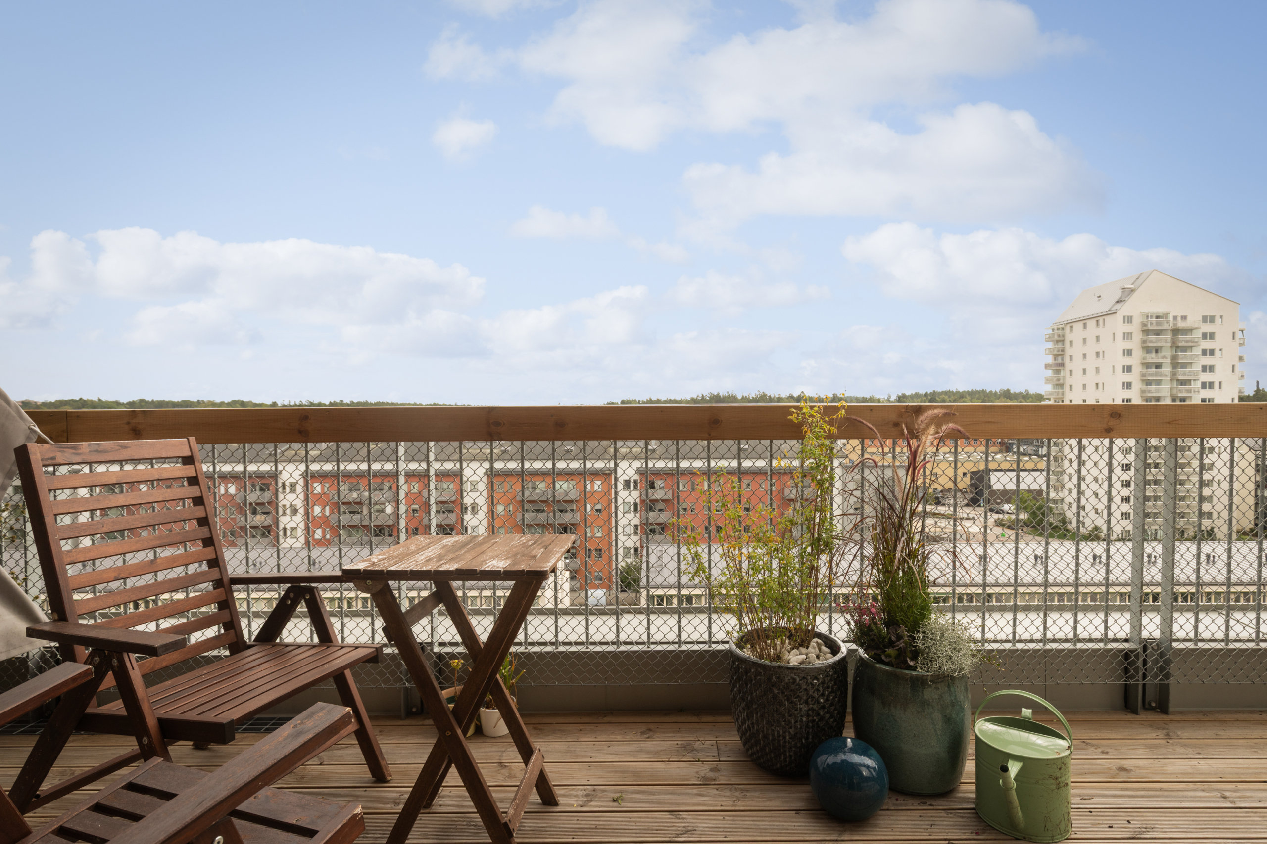Wow är känslan som infinner sig när man kliver in i lägenheten – och framförallt när man stiger ut på den 13 meter långa terrassen i bästa söderläge. Här finns plats för både sociala stunder, odlingar och lugna stunder i solen med grönskan som fond. Med sina ca 20 kvm blir terrassen ett självklart extrarum under sommarhalvåret.