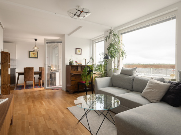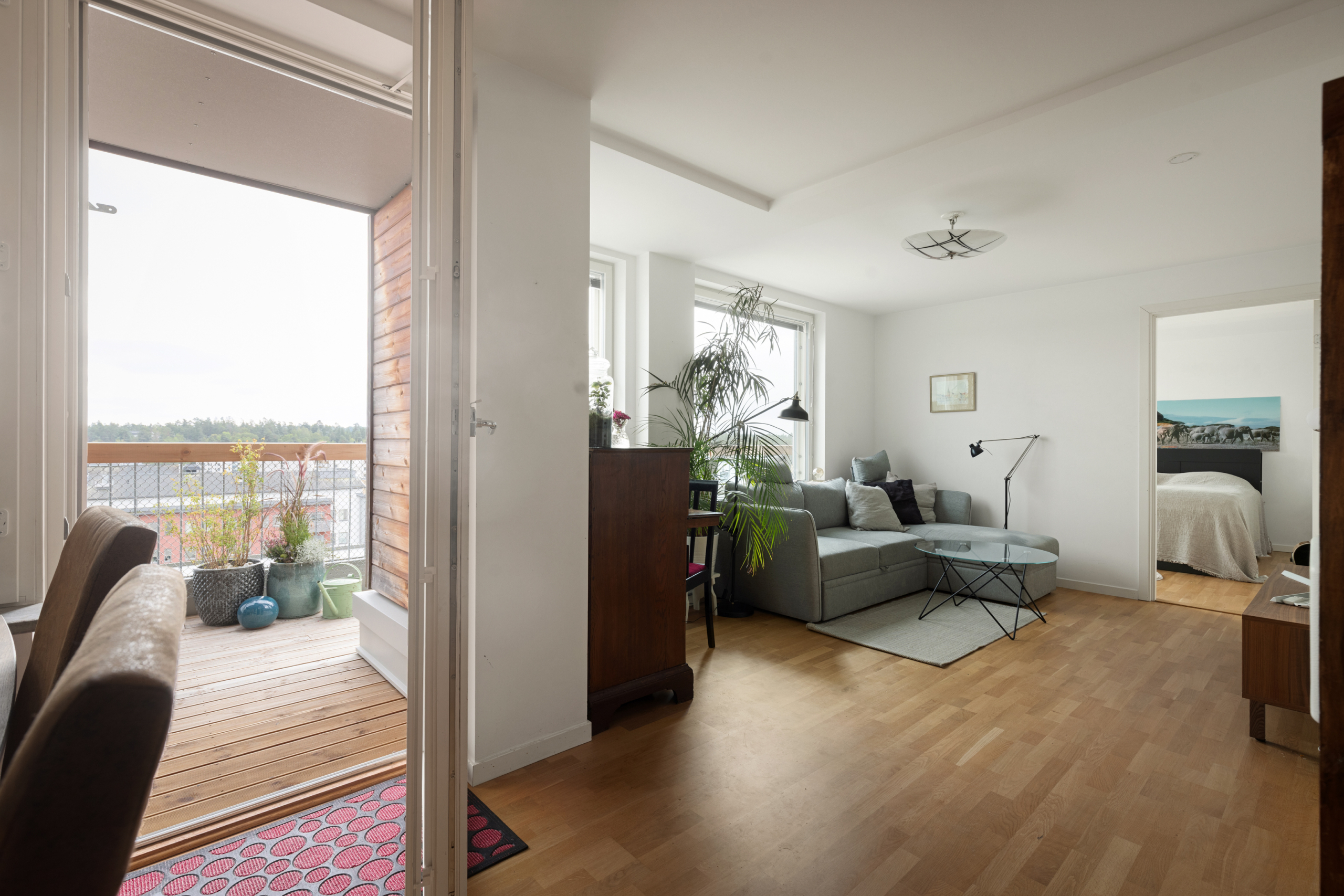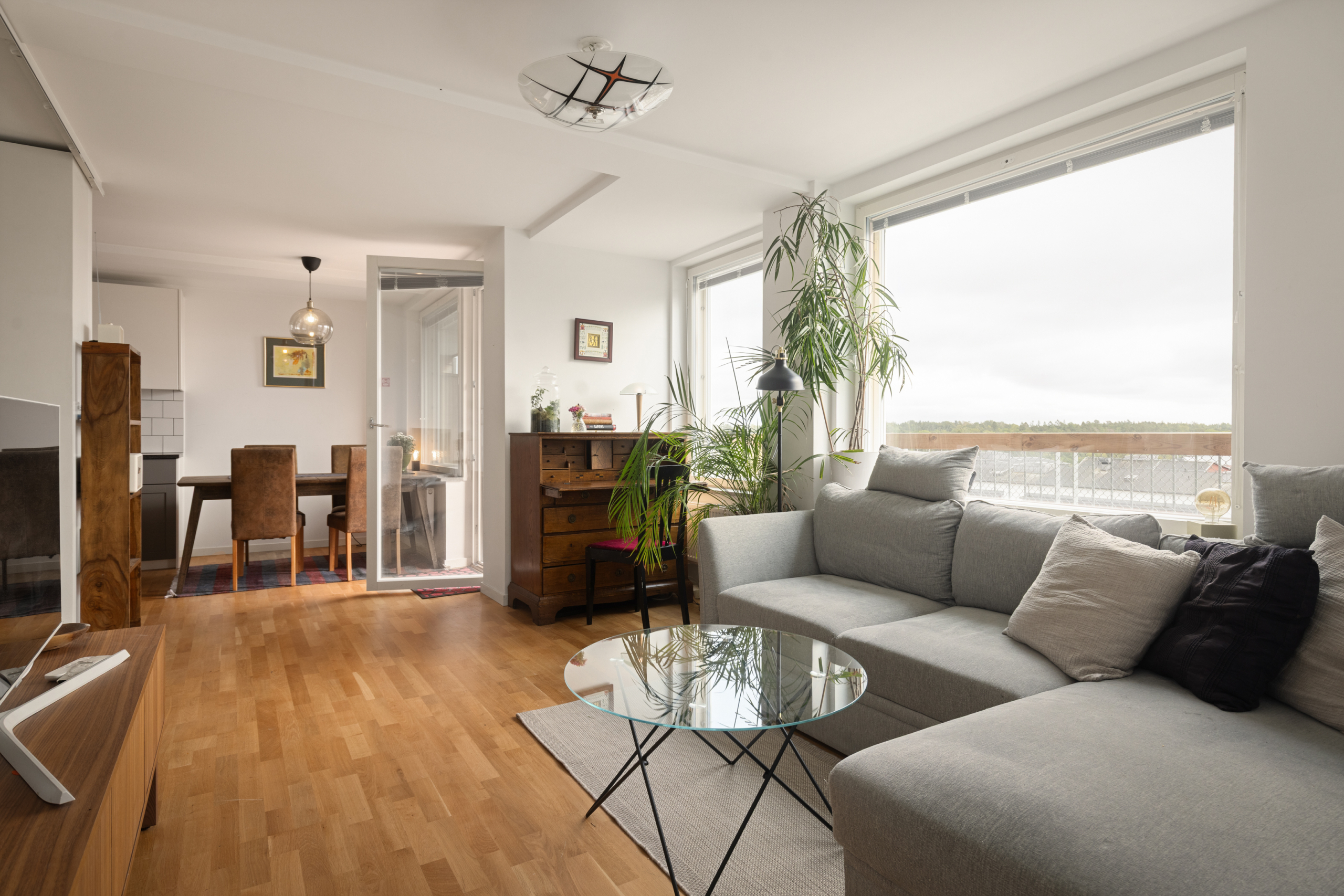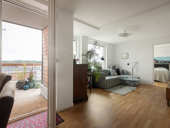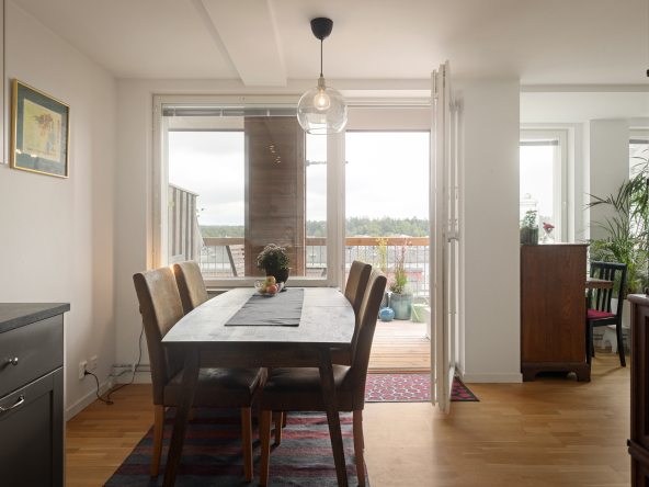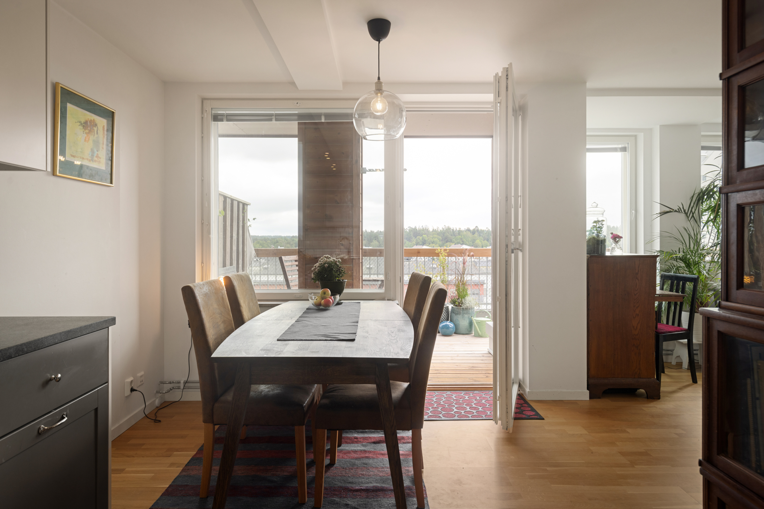 Wow är känslan som infinner sig när man kliver in i lägenheten – och framförallt när man stiger ut på den 13 meter långa terrassen i bästa söderläge. Här finns plats för både sociala stunder, odlingar och lugna stunder i solen med grönskan som fond. Med sina ca 20 kvm blir terrassen ett självklart extrarum under sommarhalvåret.