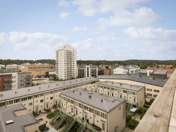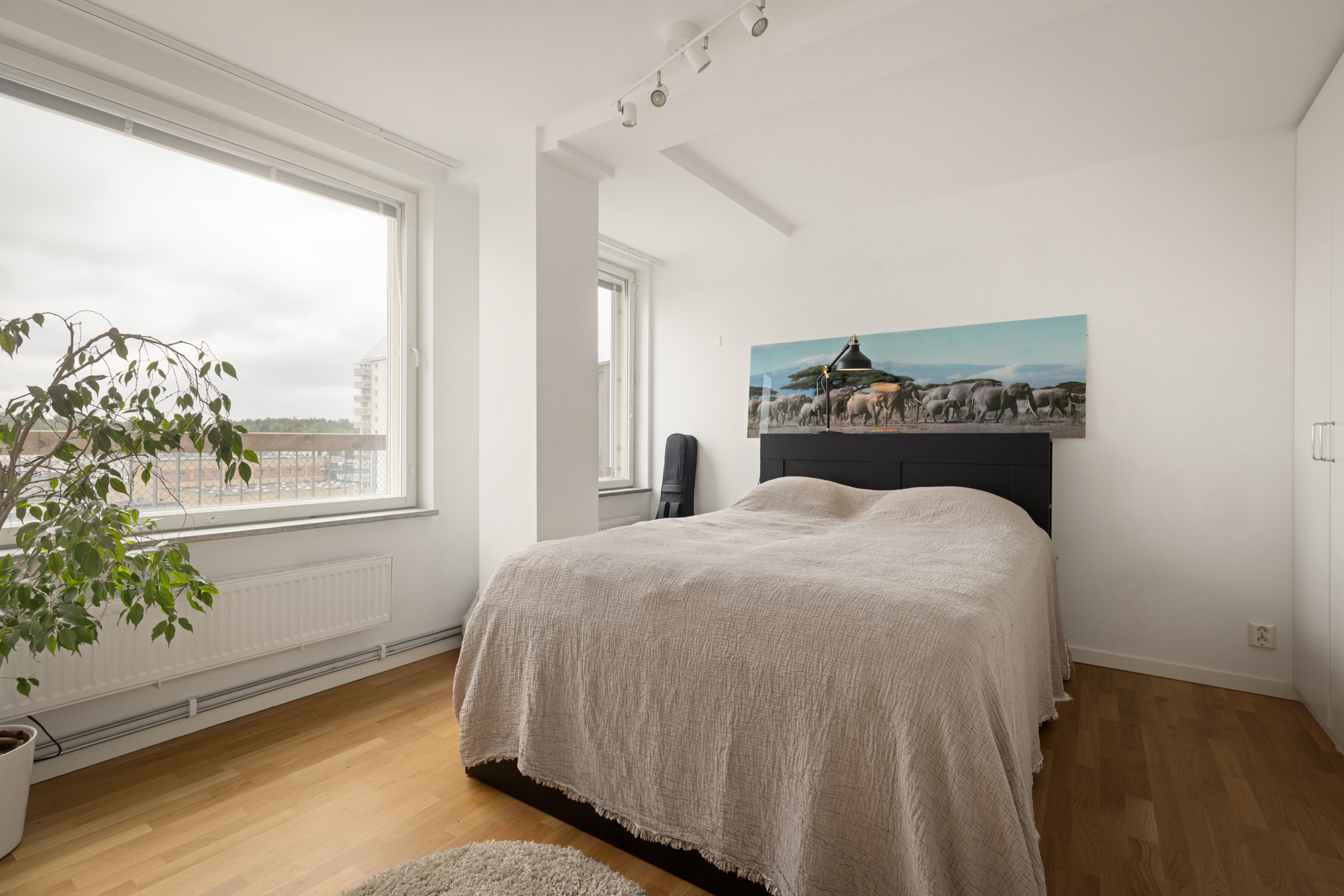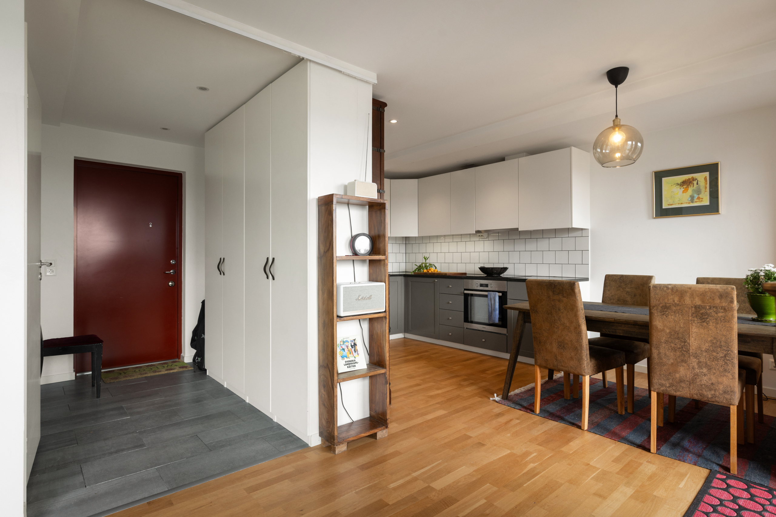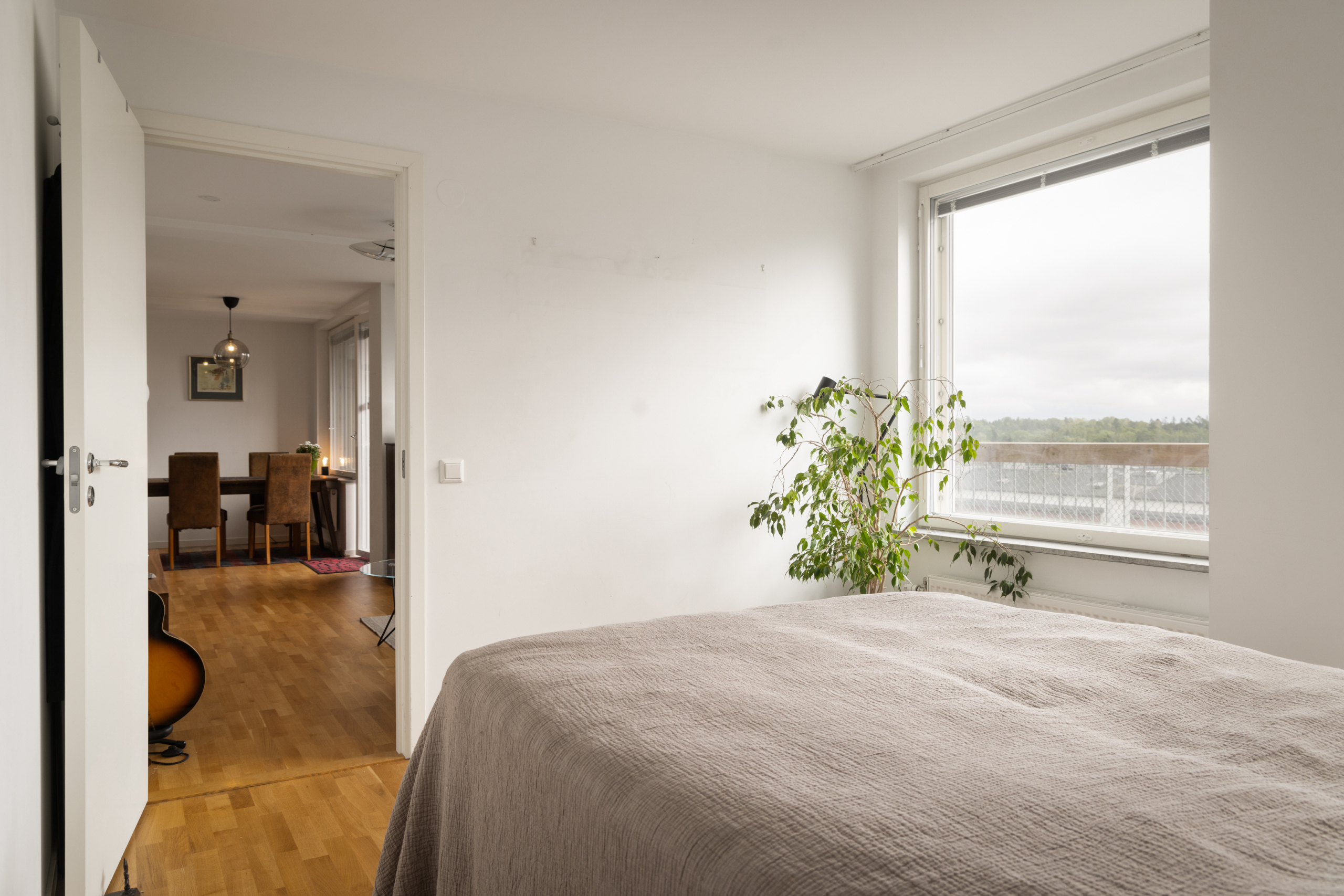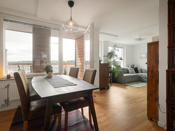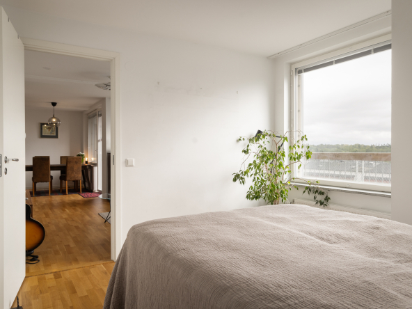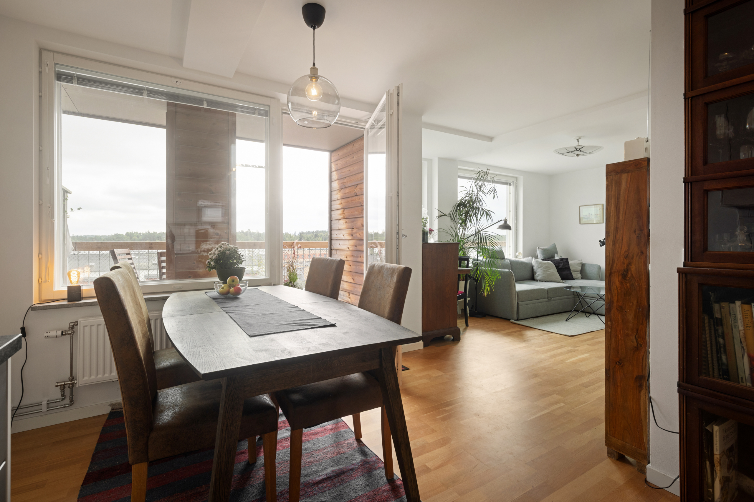 Wow är känslan som infinner sig när man kliver in i lägenheten – och framförallt när man stiger ut på den 13 meter långa terrassen i bästa söderläge. Här finns plats för både sociala stunder, odlingar och lugna stunder i solen med grönskan som fond. Med sina ca 20 kvm blir terrassen ett självklart extrarum under sommarhalvåret.