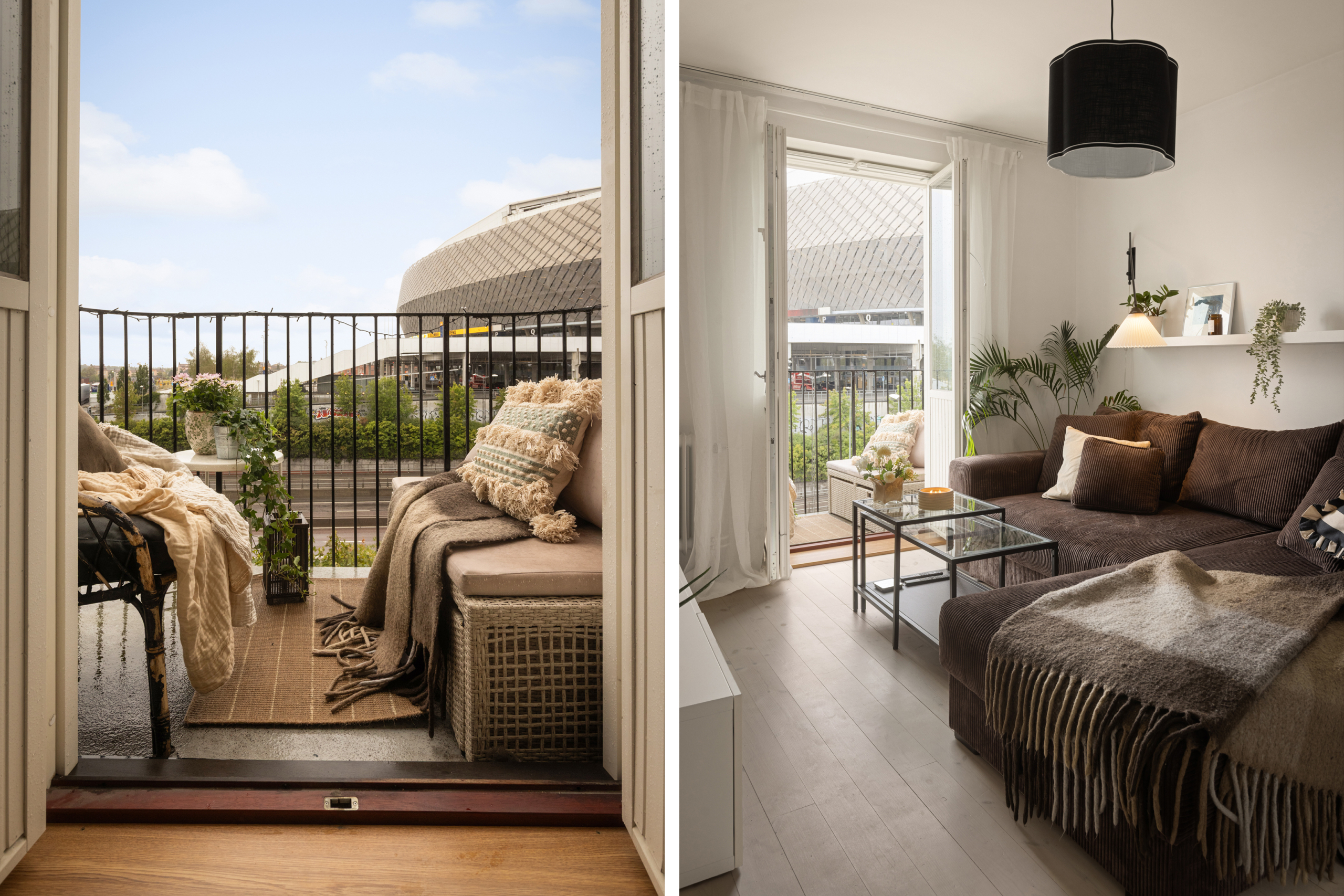 Från köket blickar du ut mot lugna Pastellvägen, medan balkongen bjuder på härlig puls med utsikt mot Nynäsvägen och arenorna i Globenområdet.