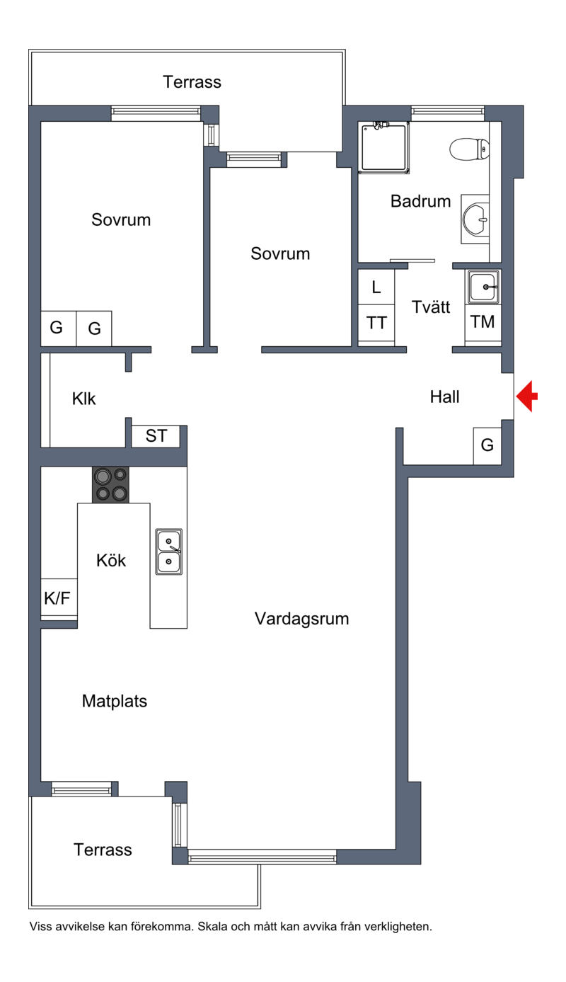 • Badrum med WC och dusch samt en mycket praktisk tvättavdelning utrustad med tvättmaskin, torktumlare, skåp och arbetsbänk