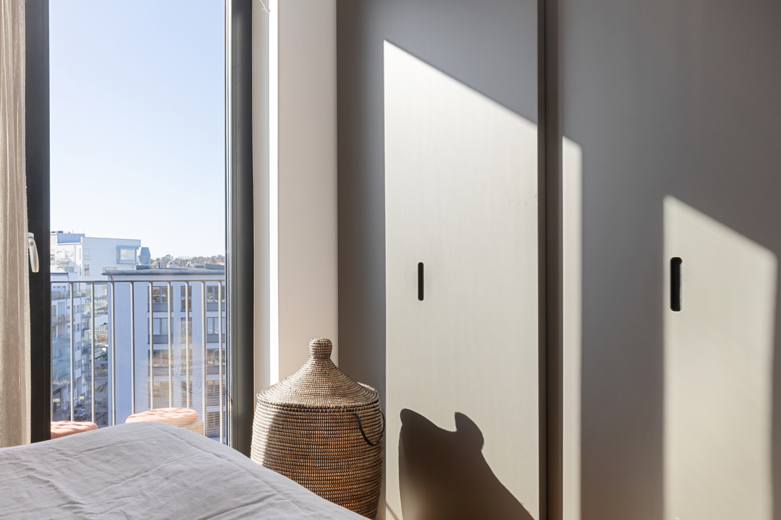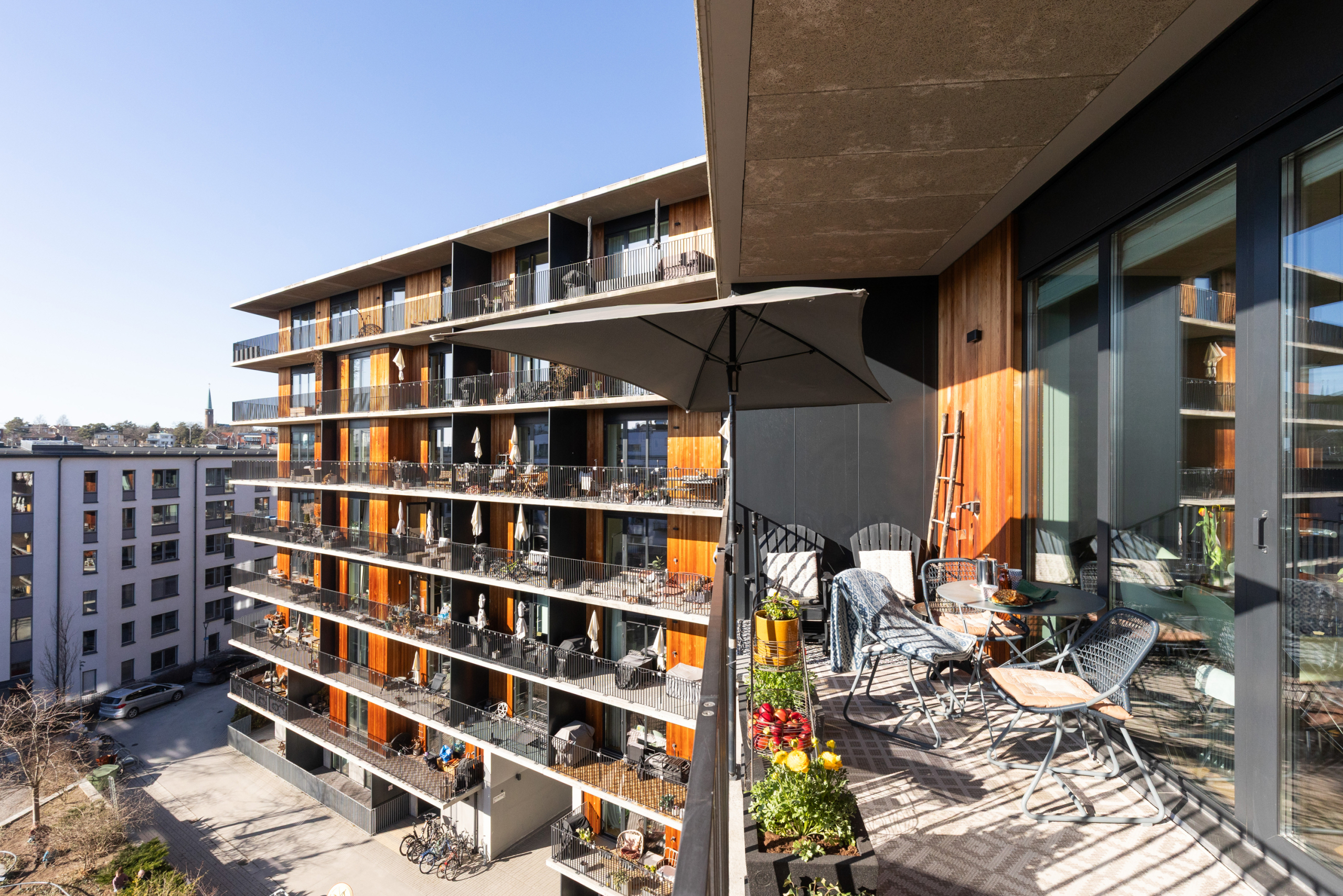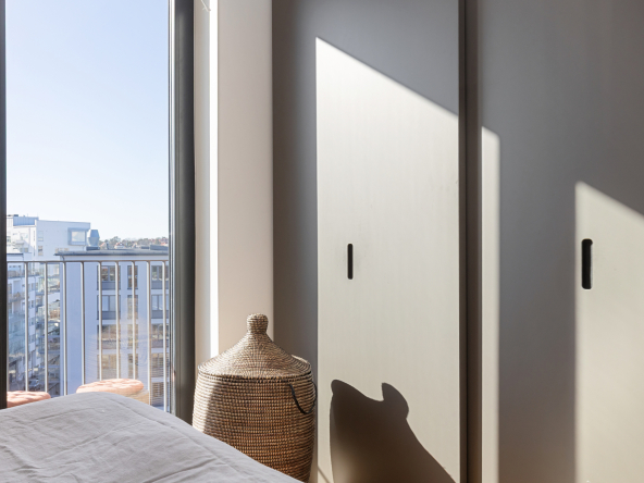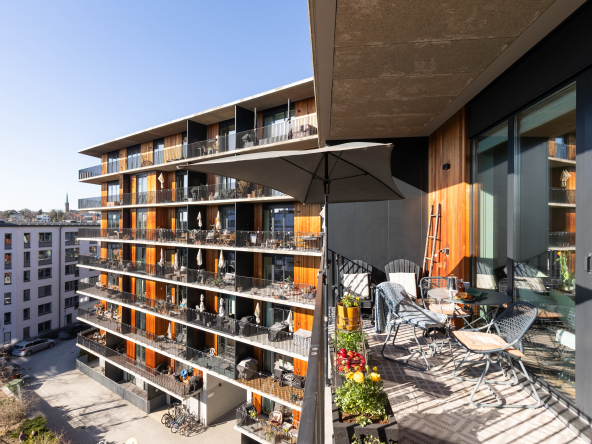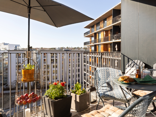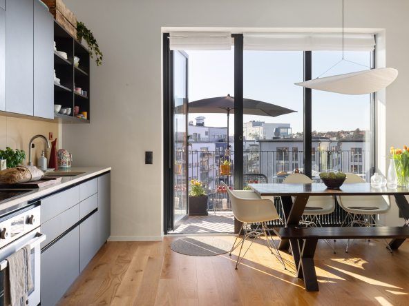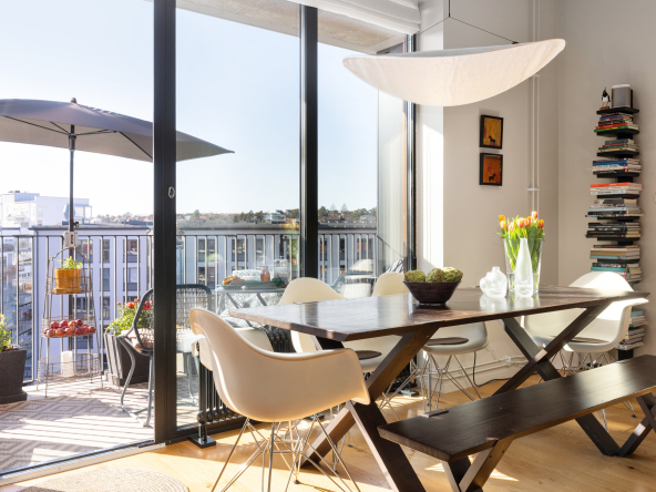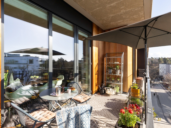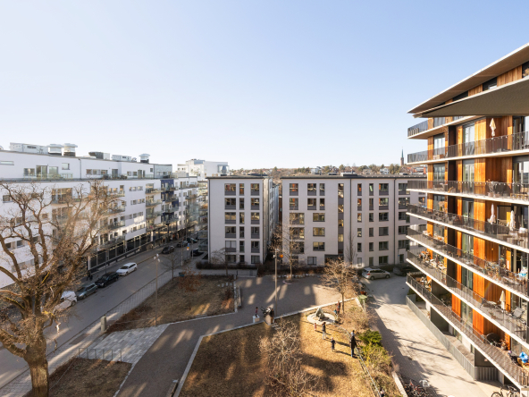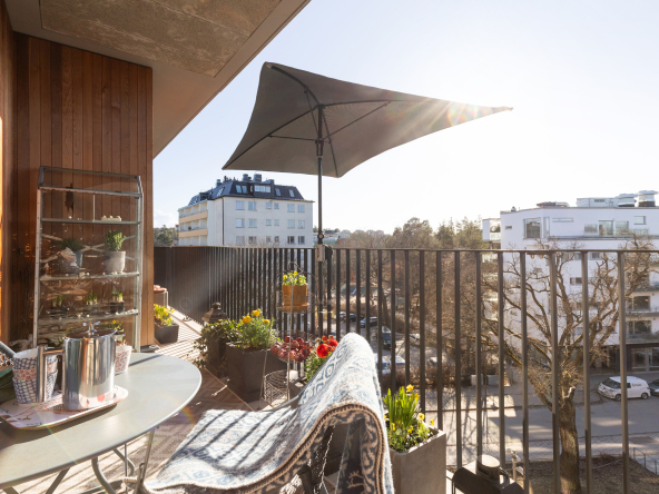 Arkitektritat av prisbelönta Andreas Martin-Löf, så är detta hem unik i sitt slag där året förlängs med den stora insynsskyddade terrassen i västläge som sträcker sig längs med hela lägenheten. Och du har en av få 2:or i hela huset som har 3 meter i takhöjd och den fria och underbara utsikten.