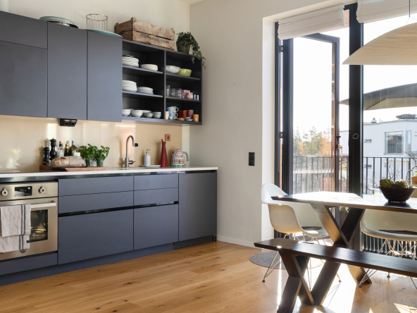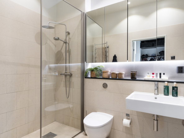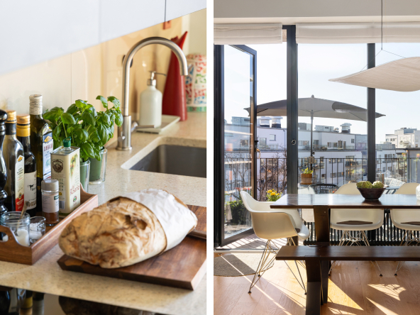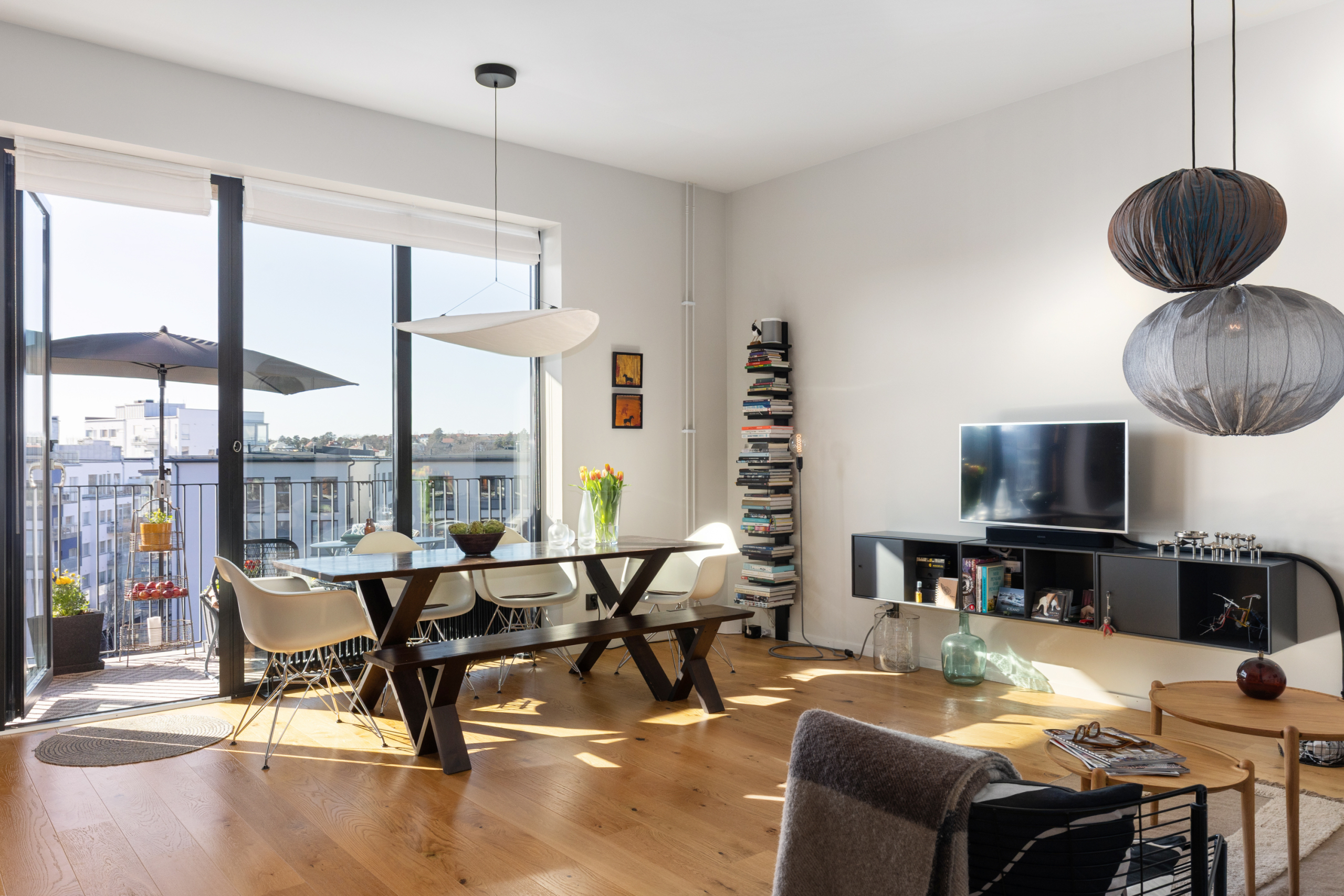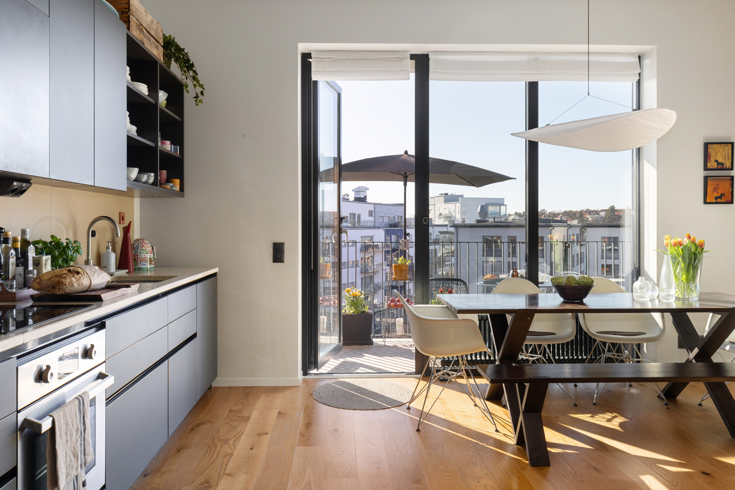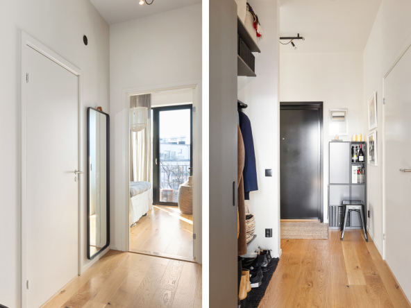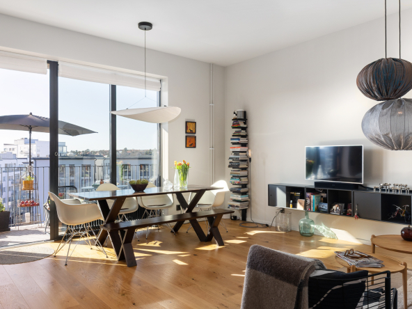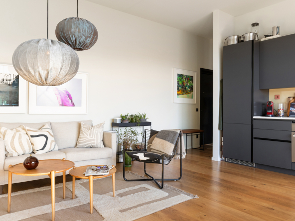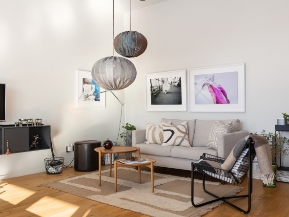 Den öppna planlösningen mellan kök och vardagsrum gör att bostaden är perfekt för att spendera de fina stunderna i vardagen med nära och kära samt att takhöjden får hemmet att kännas rymligare. Hela hemmet andas lyx med genomgående enstavsparkett, påkostat specialritat kök med bänkskiva i vit terrazzo och vitvaror från Bertazzoni, exklusivt badrum med generös förvaring.