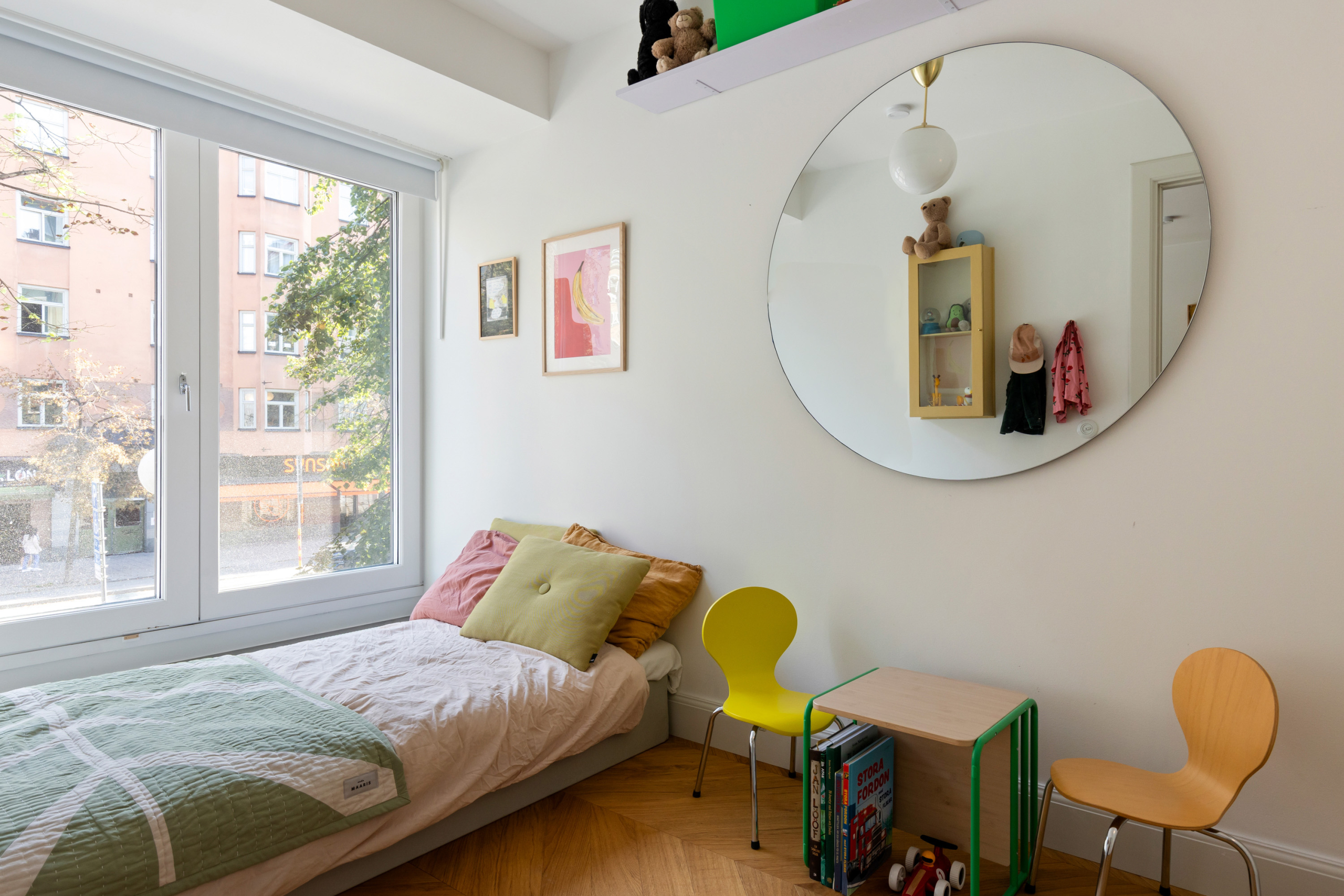 Parkettgolv och ljusa väggar. Plats för säng och övrigt önskat möblemang. Inbyggd garderob. Ljusinsläpp via fönster.