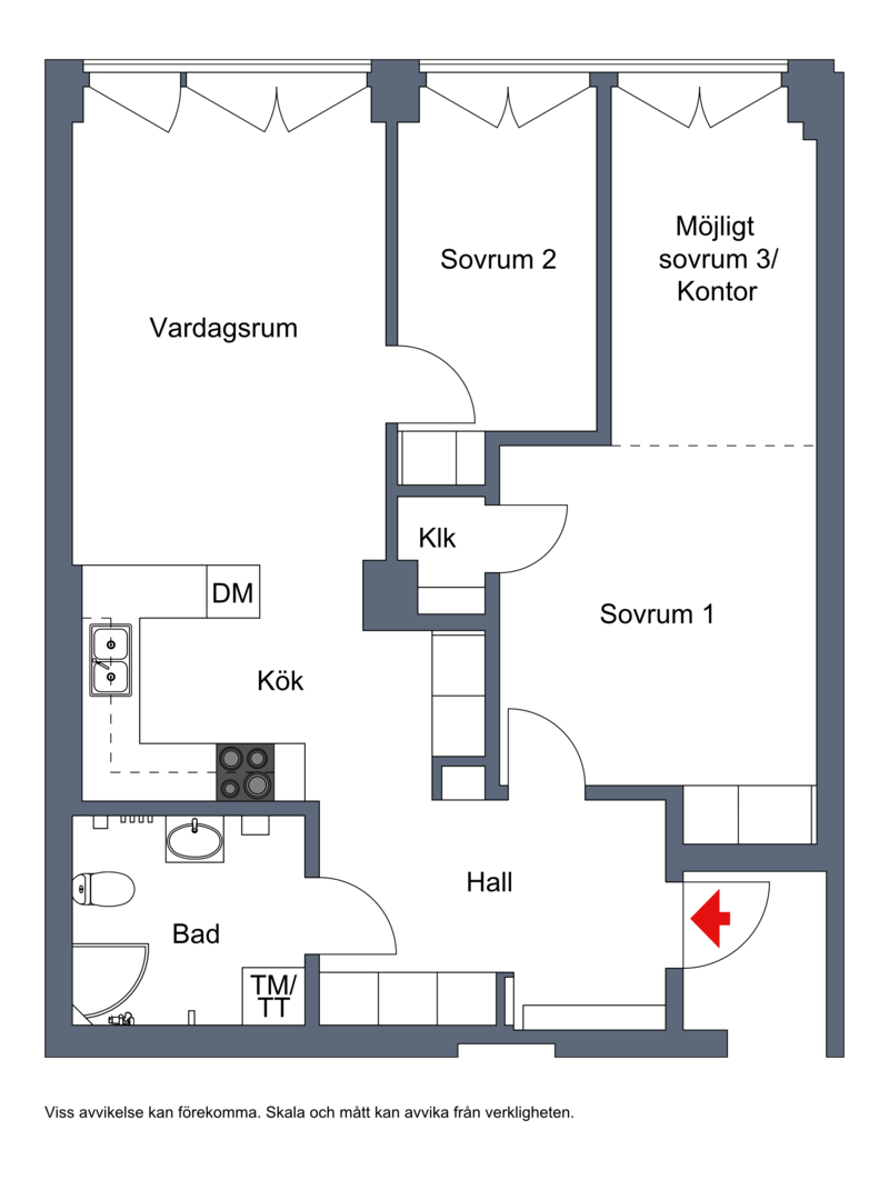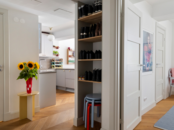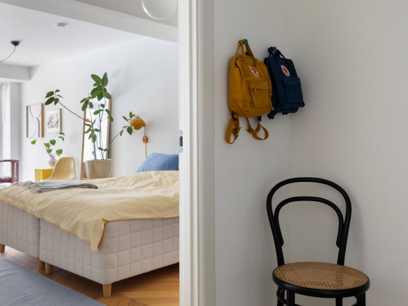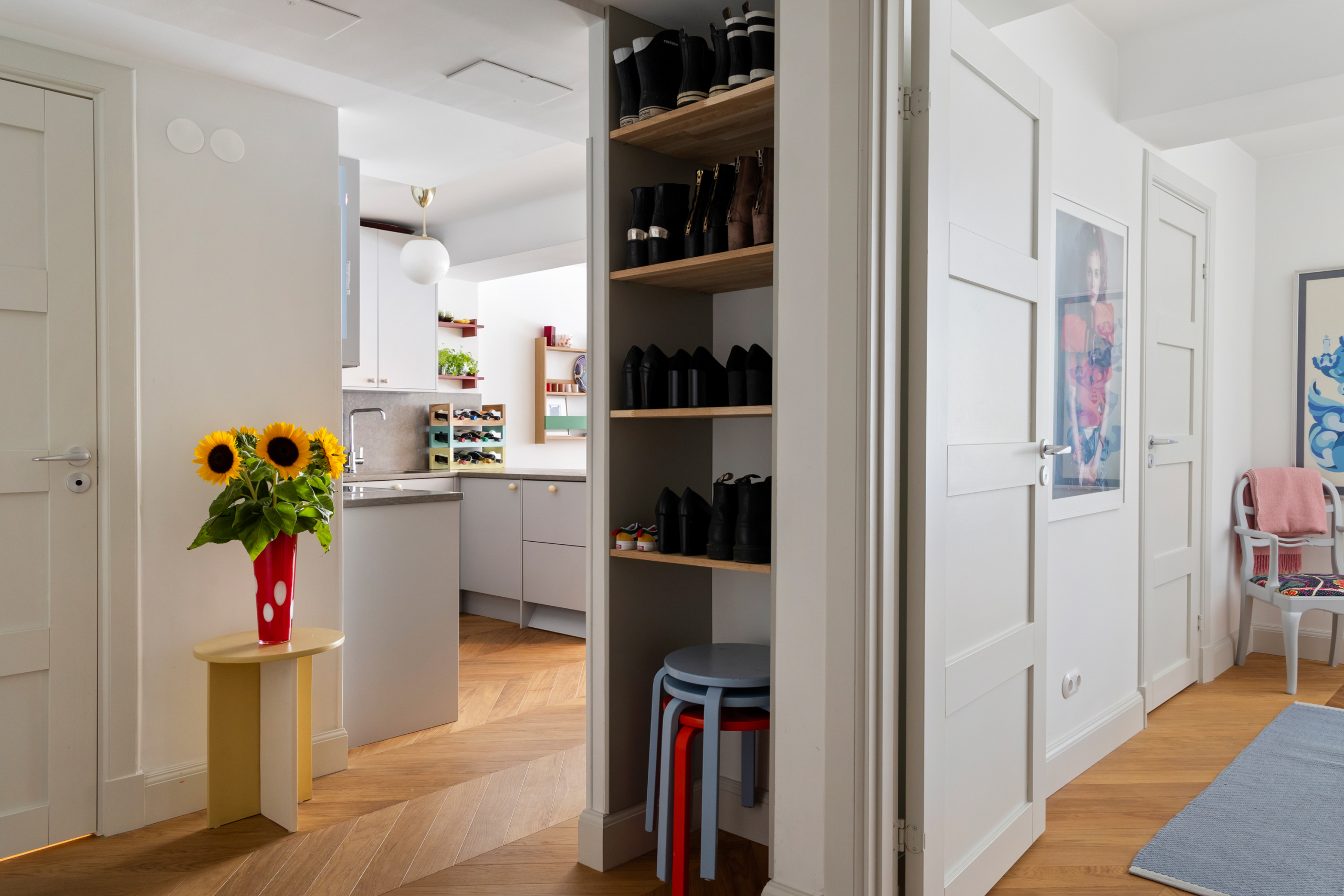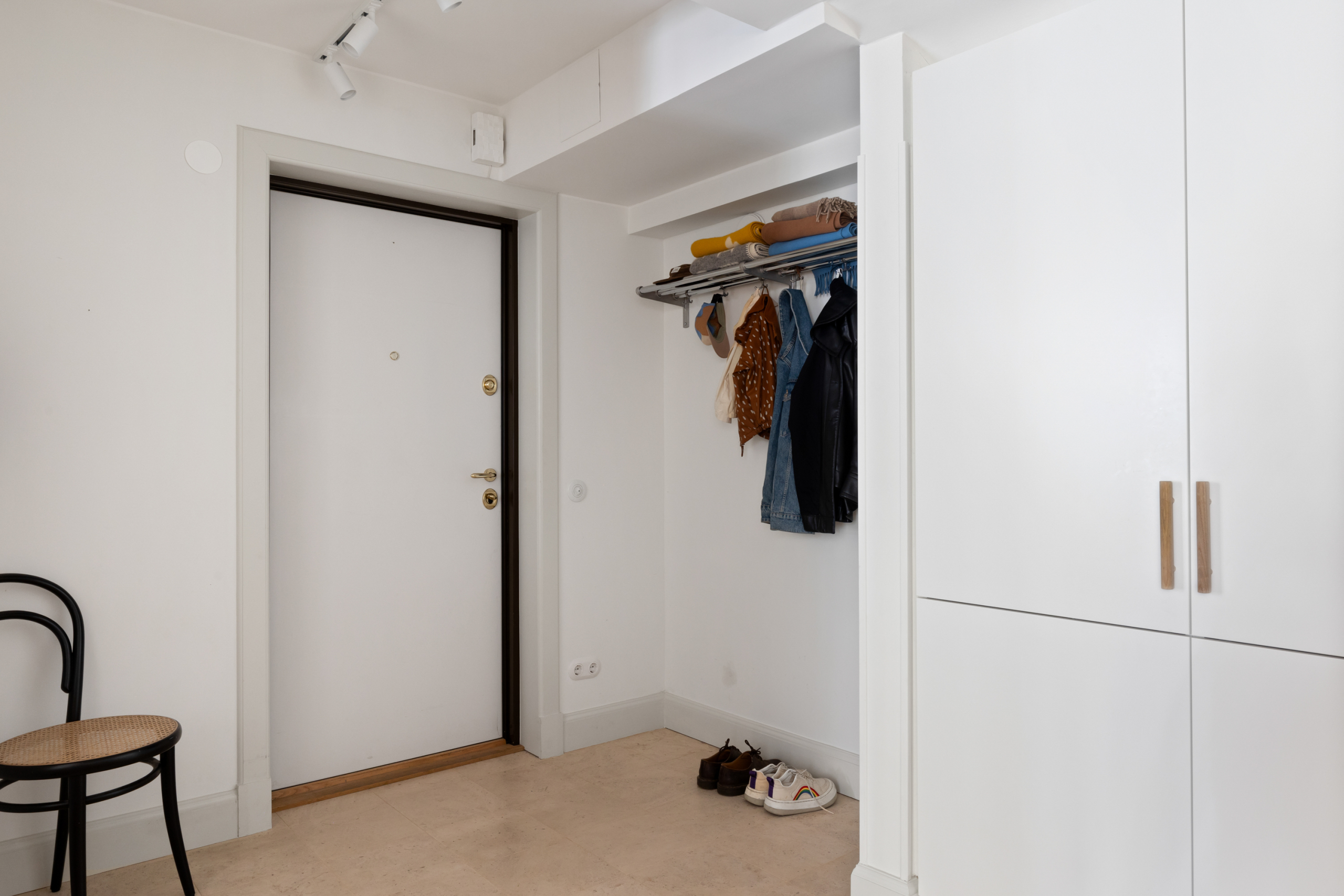 Ljust klinkergolv och ljusa väggar. Plats för avhängning samt förvaring i inbyggda garderober. Säkerhetsdörr.