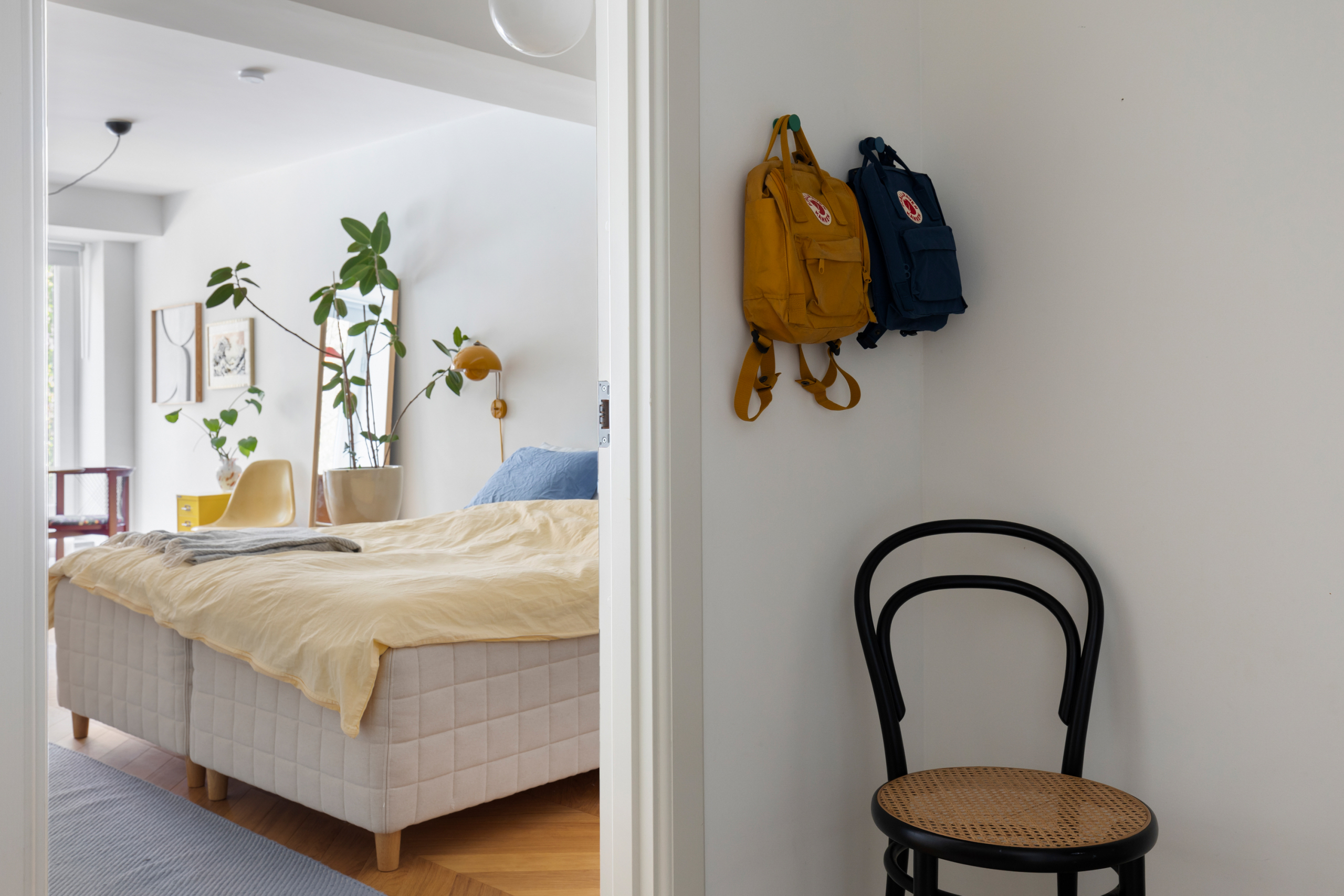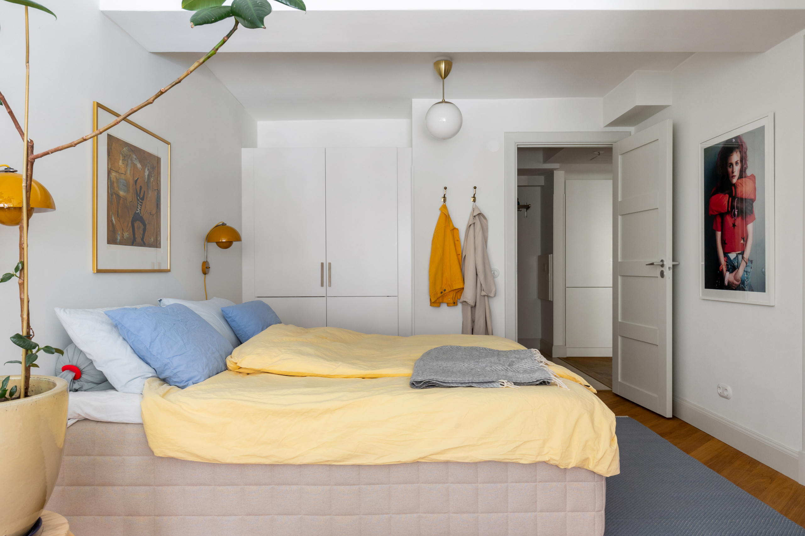 Parkettgolv och ljusa väggar. Plats för dubbelsäng och övrigt önskat möblemang. Inbyggd garderob och klädkammare för förvaring. Ljusinsläpp via fönster.