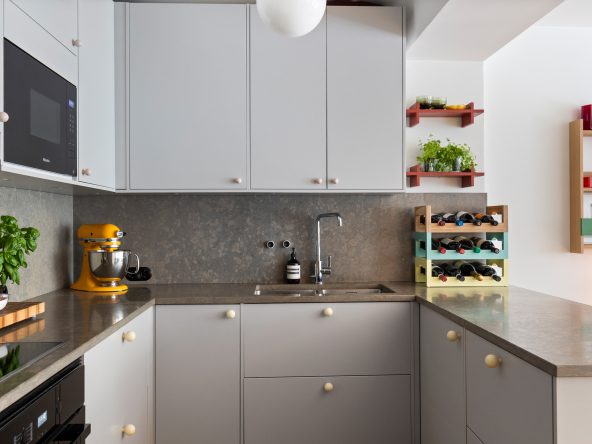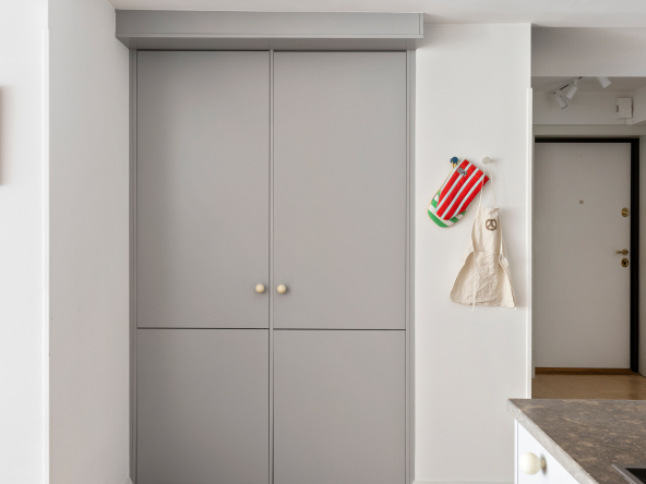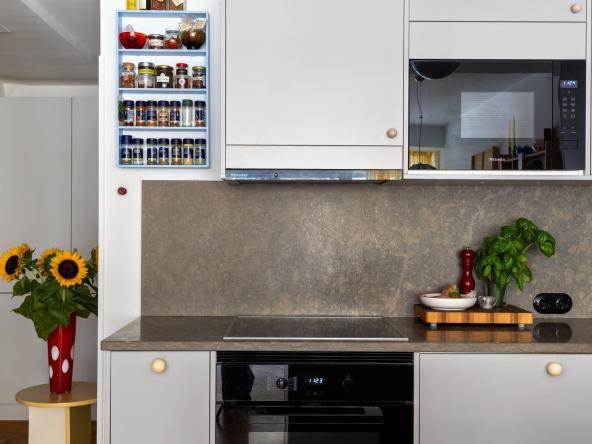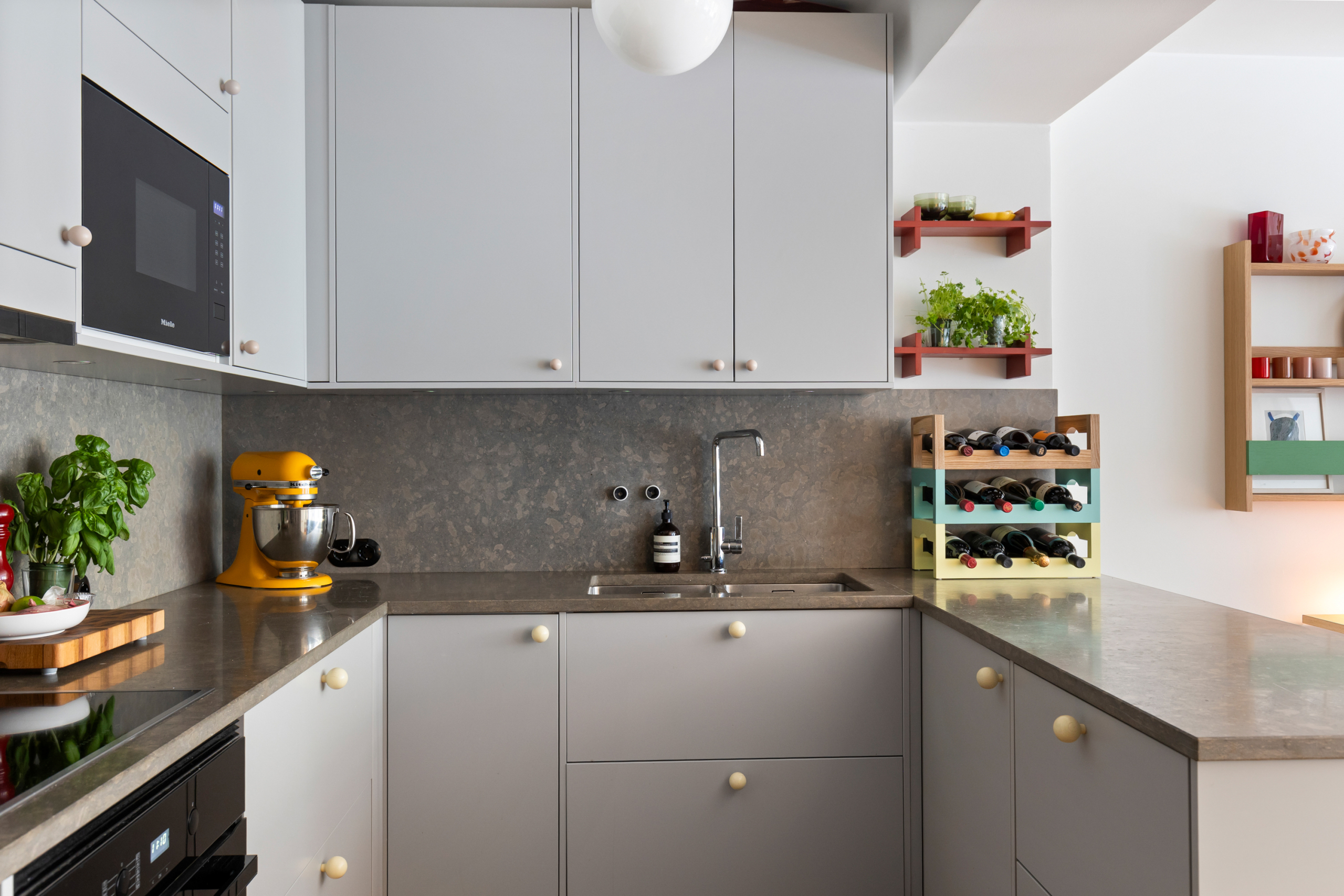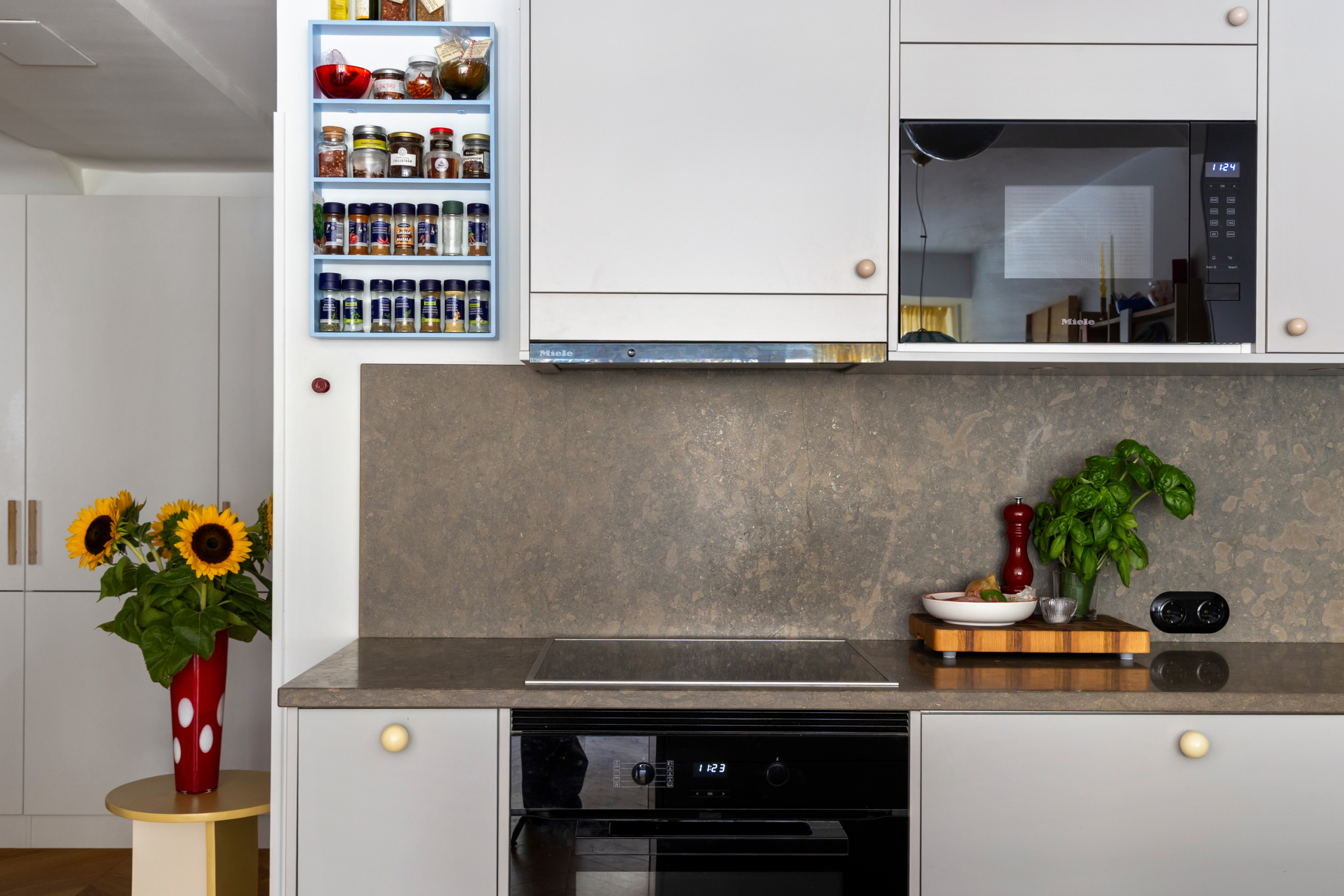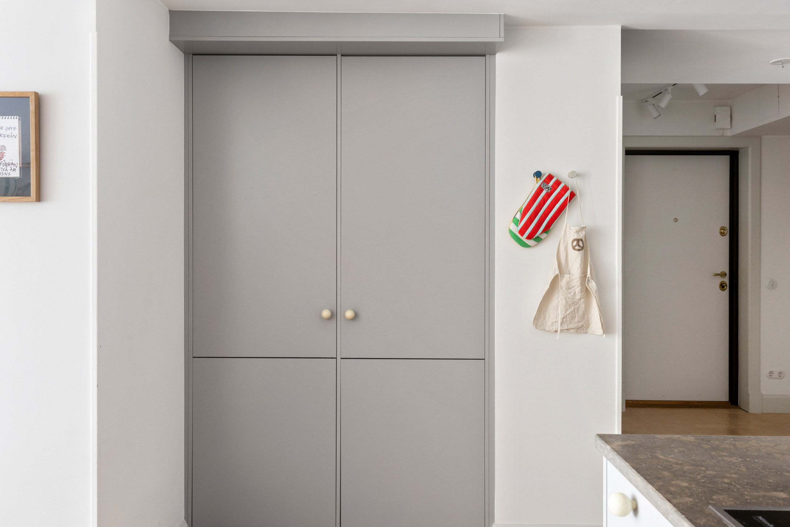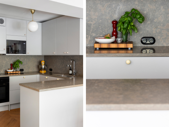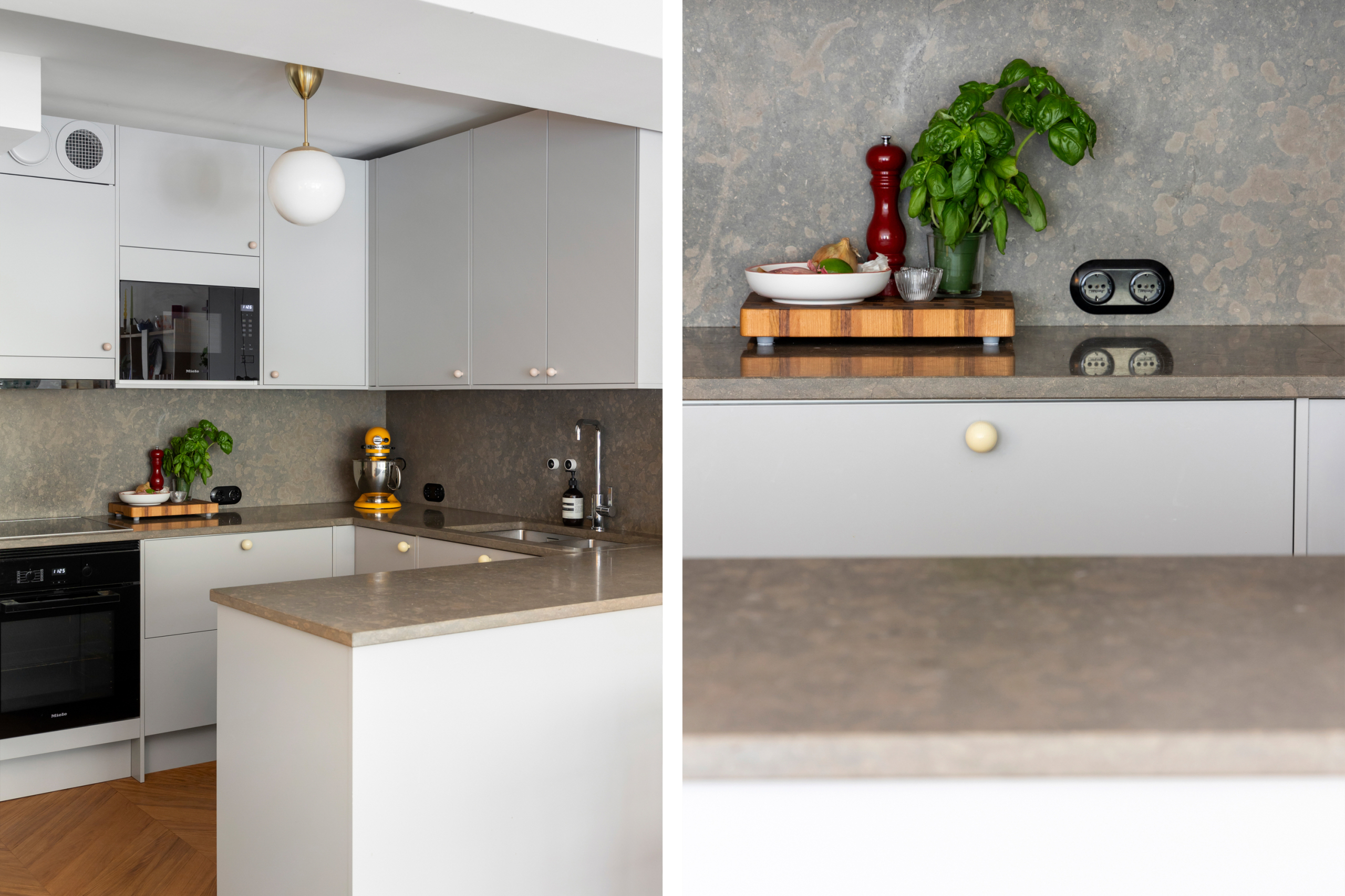 Kök med skåpsluckor i grå kulör samt bänkskiva och stänkskydd i kalksten. Utrustat med ugn, spis, fläkt, diskho, mikro, samt integrerad kyl/frys & diskmaskin.