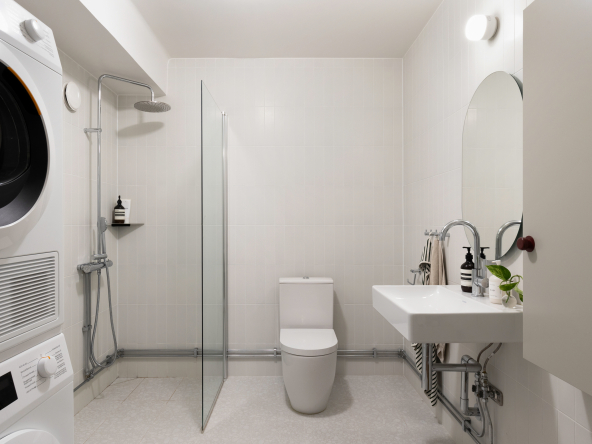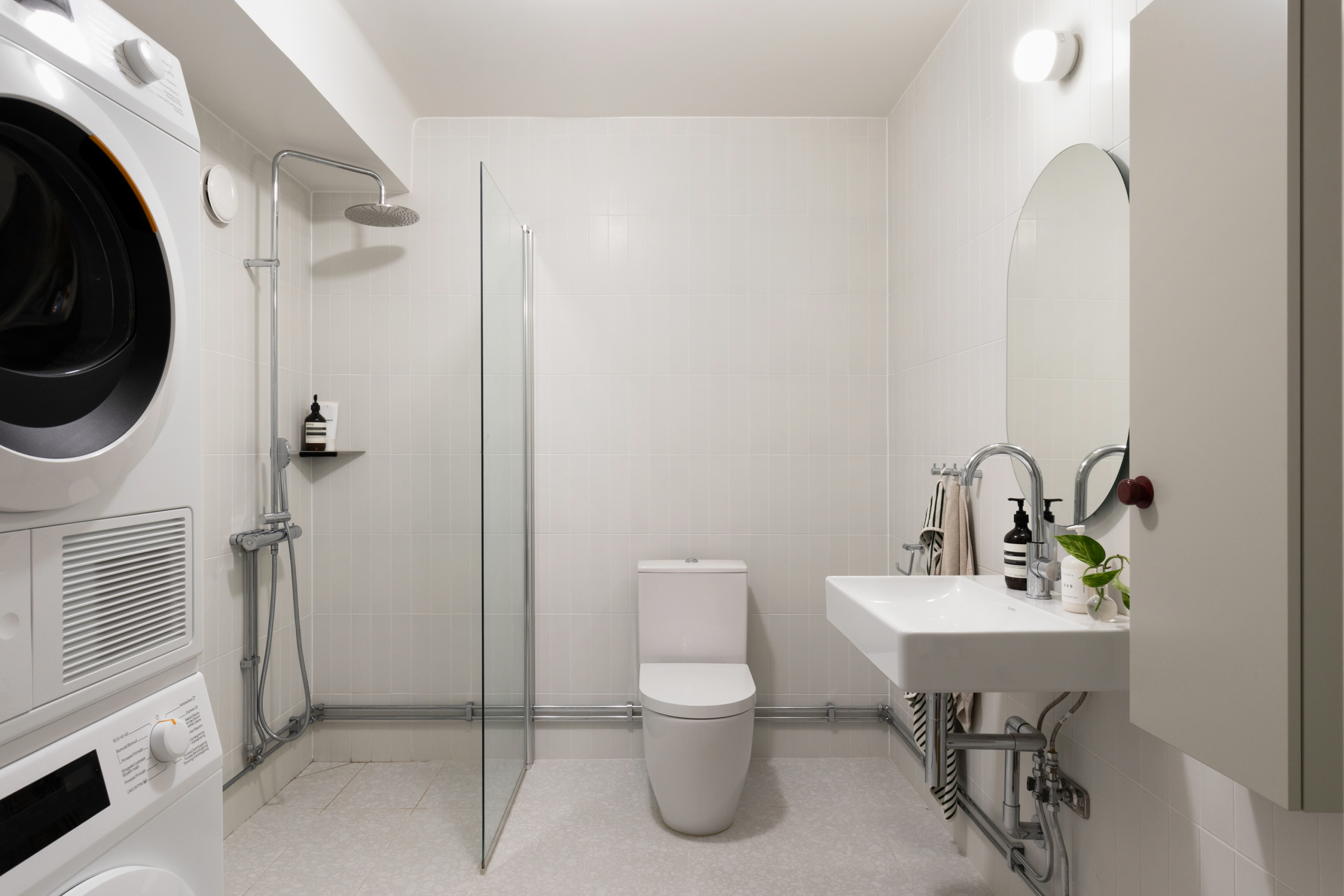 Ljust kakel samt klinkergolv. Utrustat med WC, dusch, handfat, handdukstork samt tvättmaskin & torktumlare.