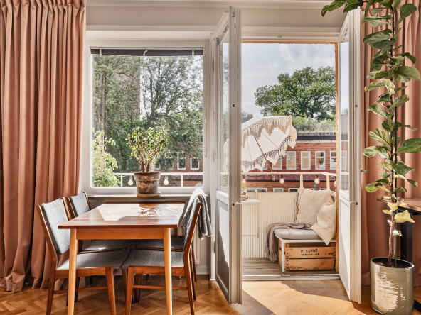 Här möts folkhemsarv, modern komfort och grönskande idyll. Husen, ritade av Backström & Reinius och uppförda 1945–46, är blåklassade och K-märkta – en kvalitetsstämpel som vittnar om områdets höga kulturhistoriska värde.