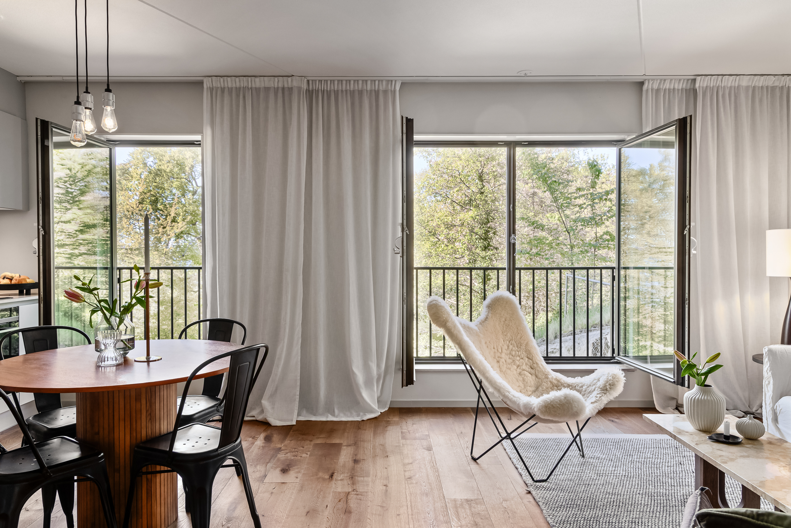 Varmt välkomna till denna helt underbara arkitektritade lägenhet med hotellinspirerad känsla! De stora fönsterpartierna med sjöglimt (sjöutsikt vinterhalvåret) och utsikt mot magisk grönska skapar en fantastisk atmosfär direkt när du kliver in. Hemmet andas lyx rakt igenom och har en luftig känsla tack vare den generösa takhöjden, ett rejält badrum, ett stort sovrum och en öppen planlösning som verkligen imponerar. Nuvarande ägare har dessutom skapat en avskild sovalkov – perfekt för gäster eller hemmakontor.