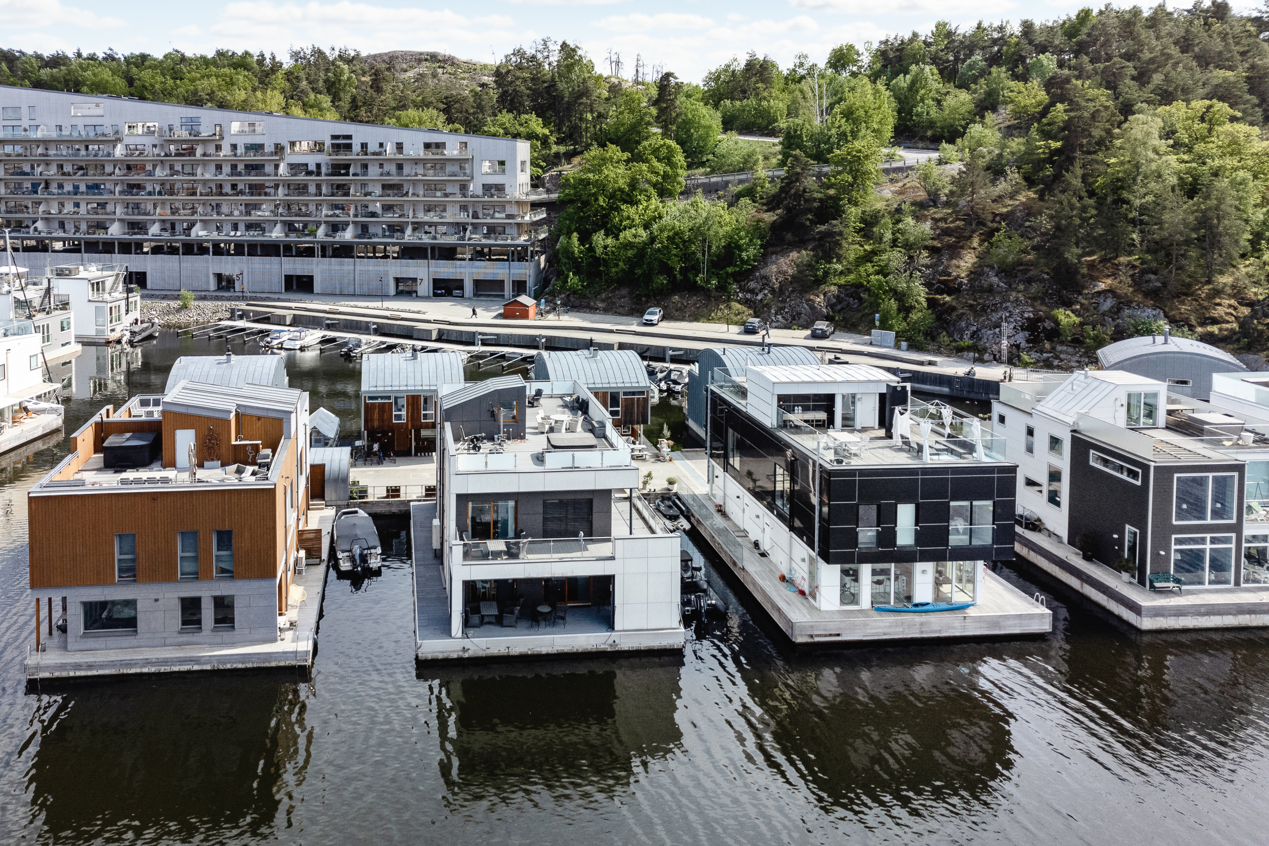 I Brf Sjöhuset får du mycket mer än bara ett extraordinärt hem. Här erbjuds en helhetsupplevelse med gemensamma utrymmen i absolut toppklass: stor takterrass, kallbadhus med bastu, badbrygga och soldäck, föreningslokal med pentry och allrum, övernattningslägenhet, kylrum för matleveranser och rymligt cykelrum. Som boende har du dessutom både egen båtplats vid bryggorna nedanför huset och garageplats.