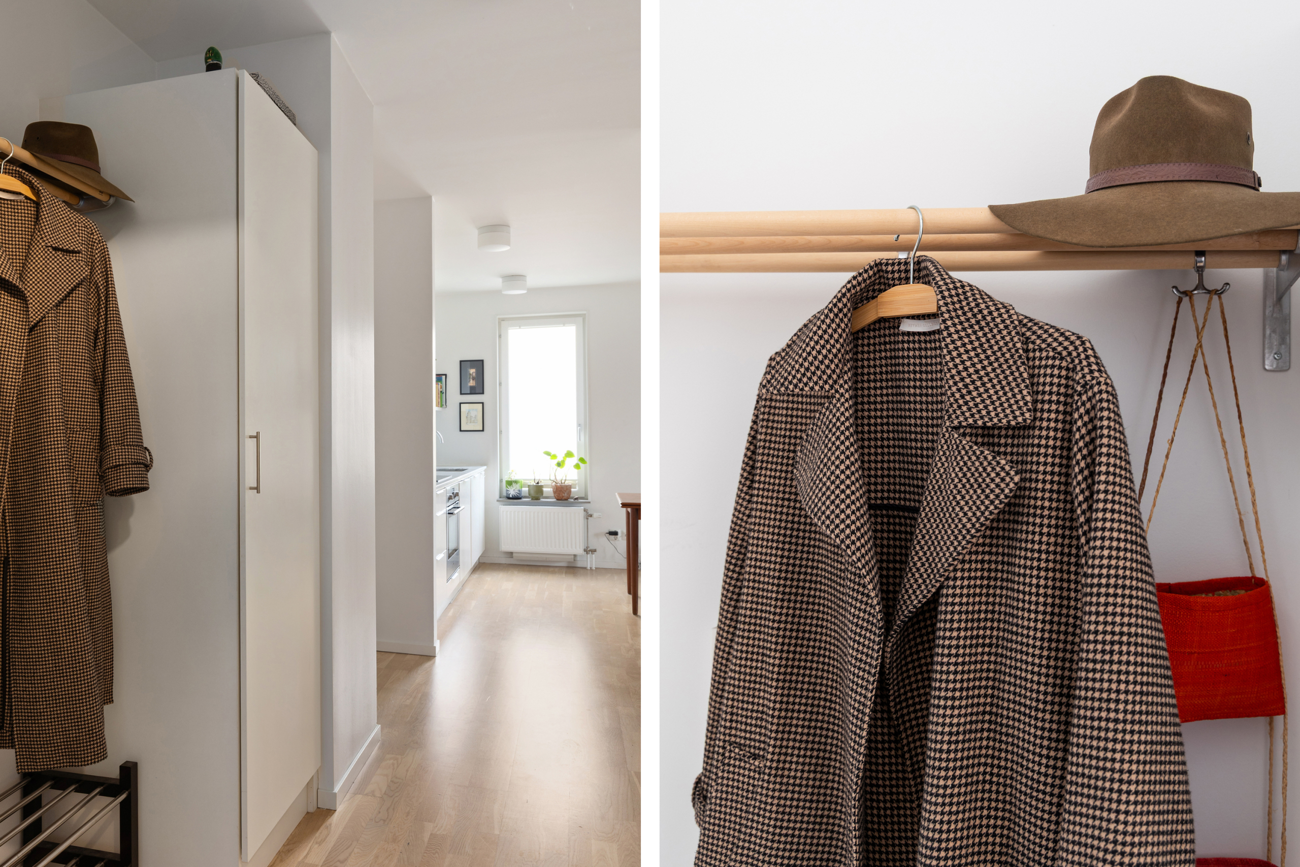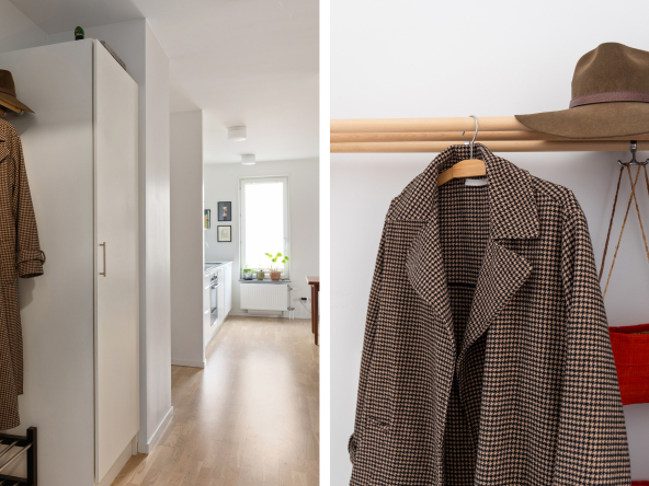 Ljusa väggar och parkettgolv. Plats för avhängning av kläder och förvaring i garderob.