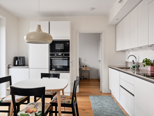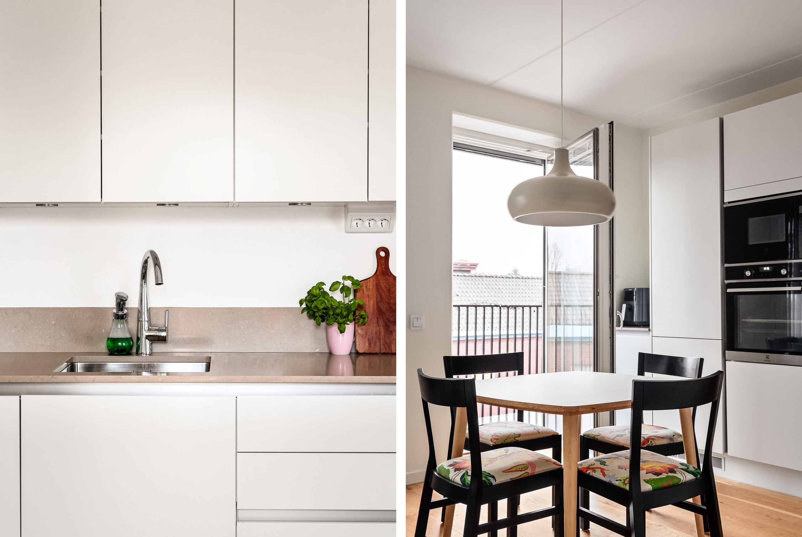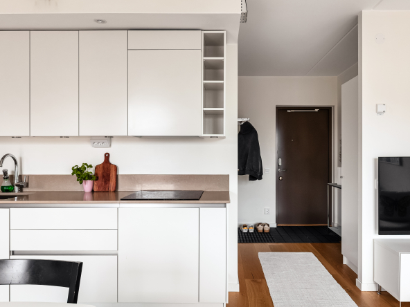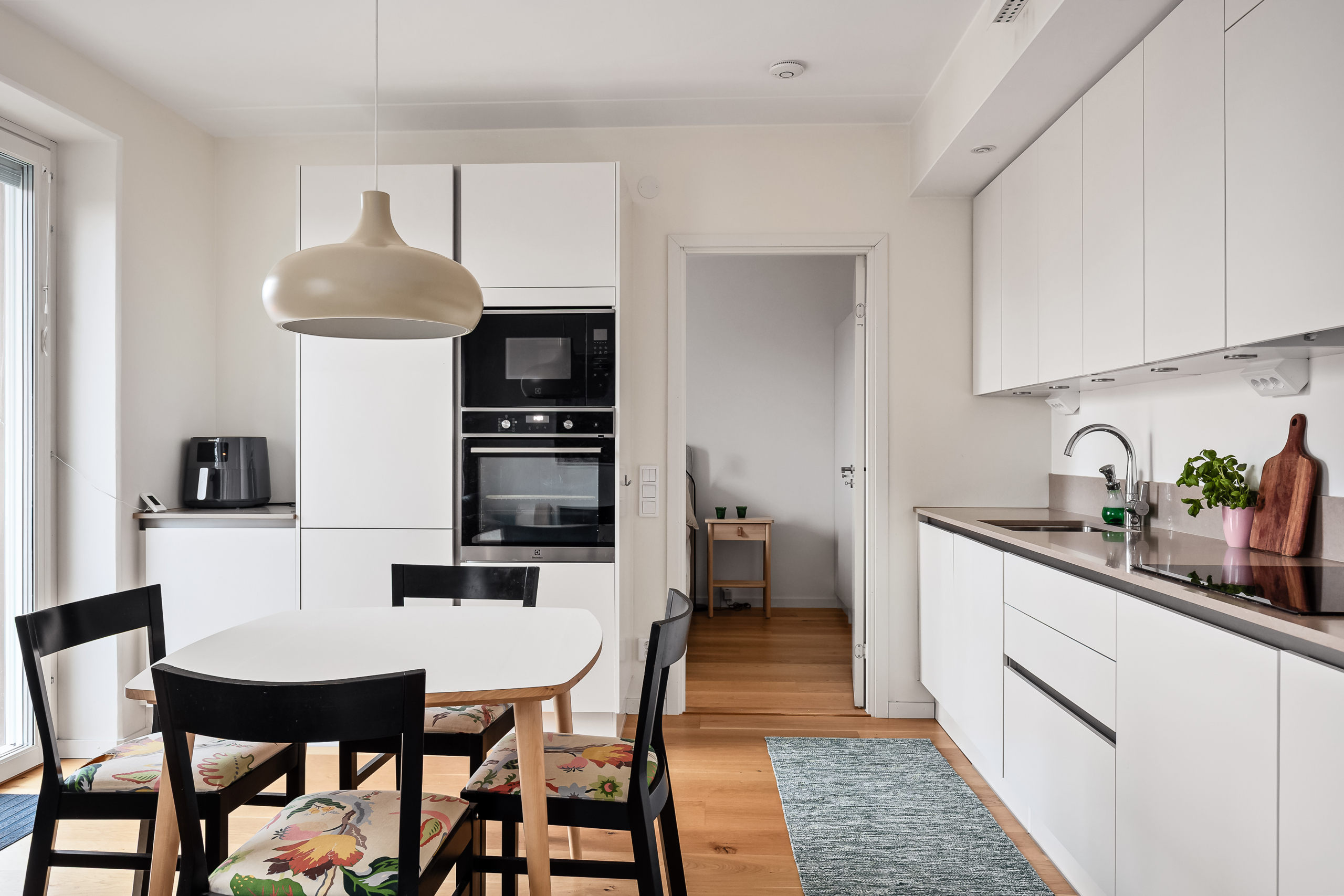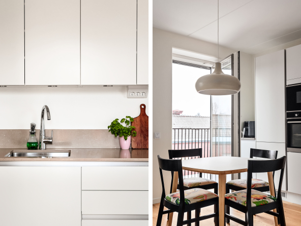 Välutrustat HTH kök med förvaring i ljusa över och underskåp. Bänksiva och stänkskydd i kvartskomposit Coral Clay. Utrustat med ugn, spis, fläkt, mikro, integrerad kyl & frys, samt diskmaskin. Plats för matbord & stolar. Ljusinsläpp via fönsterparti samt utgång till bostadens balkong. Öppen planlösning mot vardagsrum.
