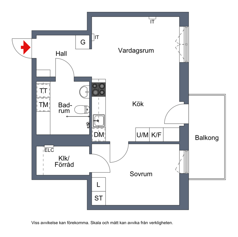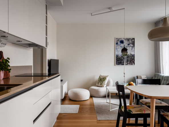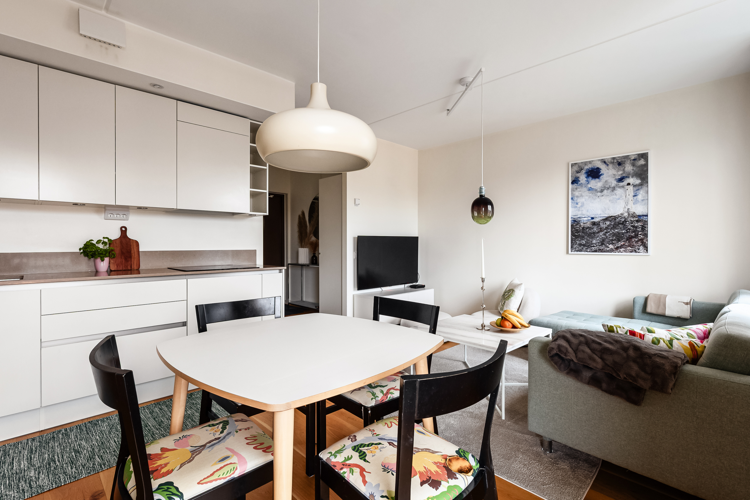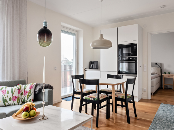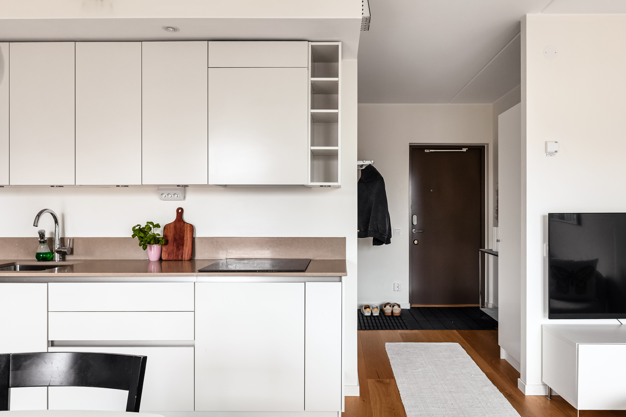 Välutrustat HTH kök med förvaring i ljusa över och underskåp. Bänksiva och stänkskydd i kvartskomposit Coral Clay. Utrustat med ugn, spis, fläkt, mikro, integrerad kyl & frys, samt diskmaskin. Plats för matbord & stolar. Ljusinsläpp via fönsterparti samt utgång till bostadens balkong. Öppen planlösning mot vardagsrum.