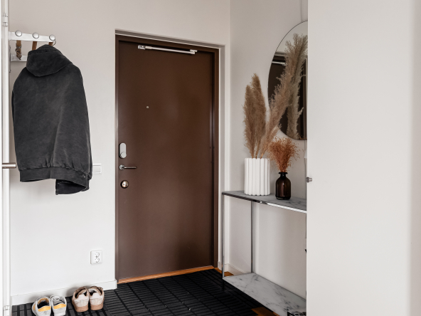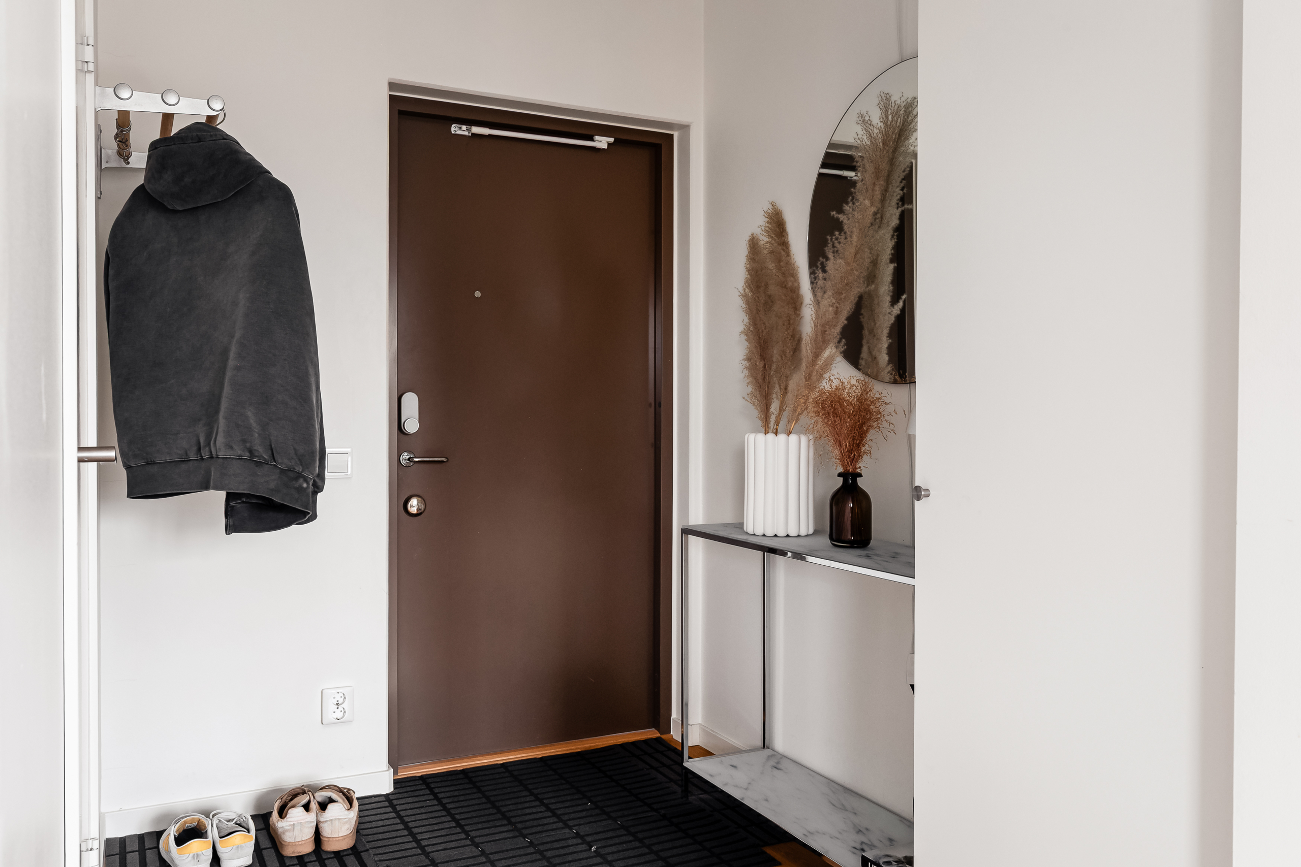 Ljusa väggar och golv i ekstavsparkett. Plats för avhängning av kläder och förvaring i garderob.