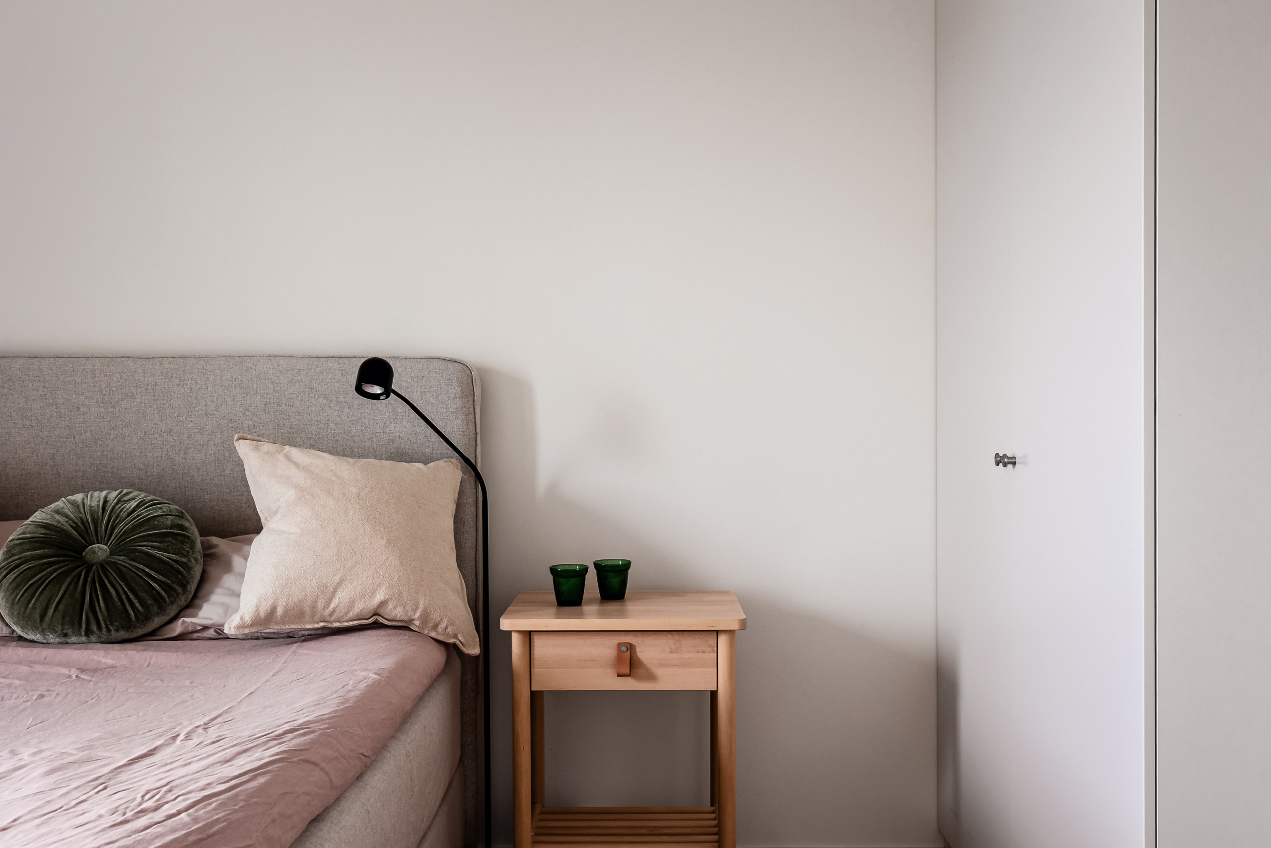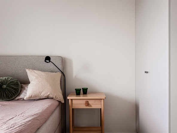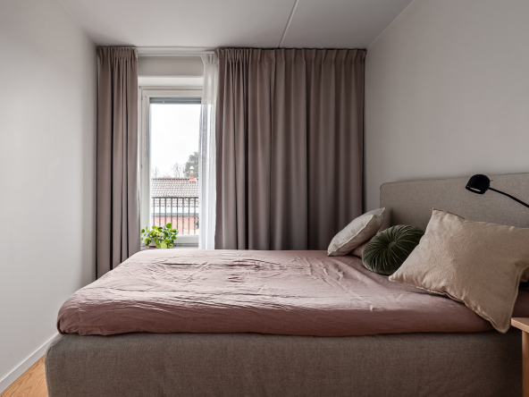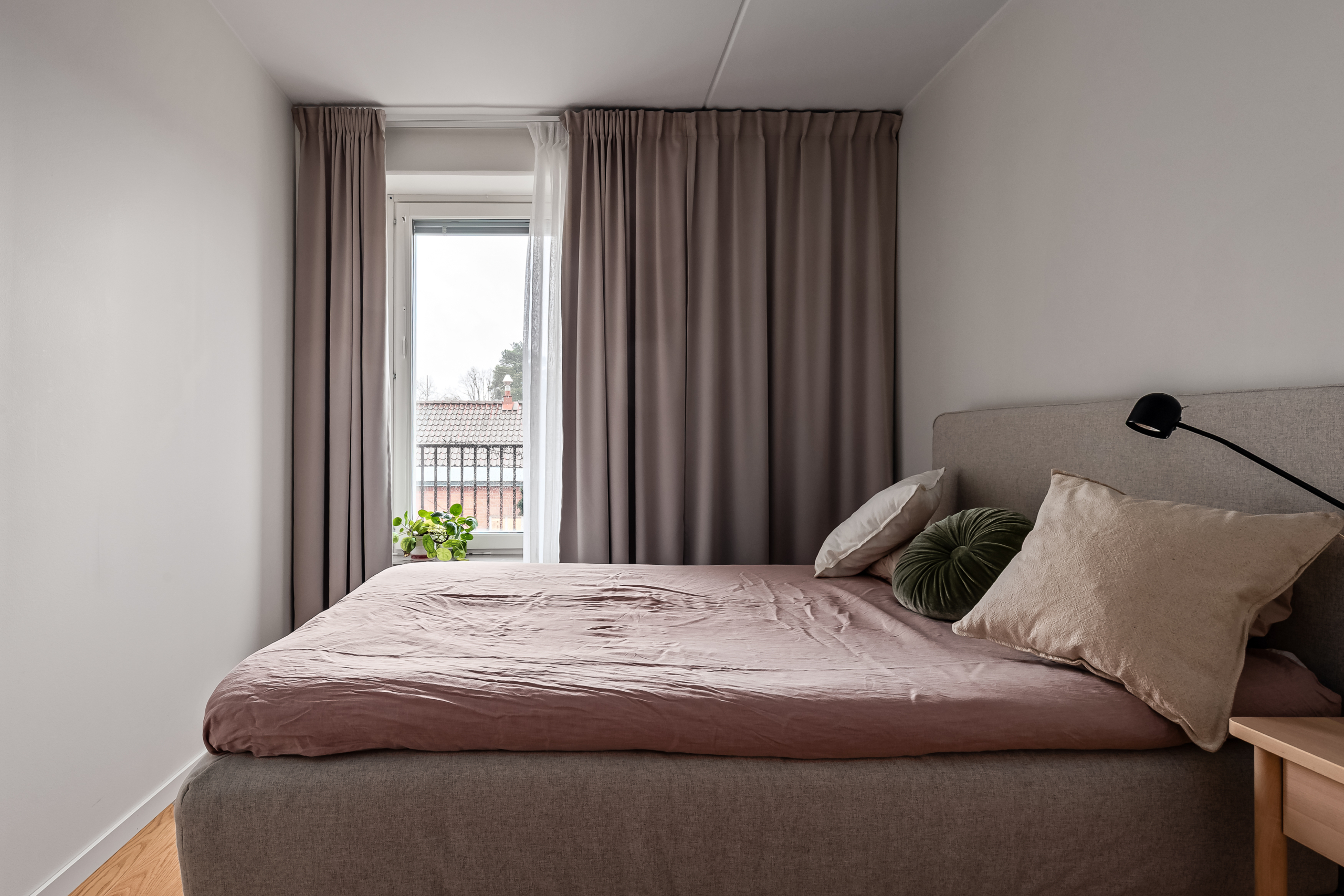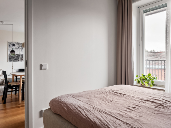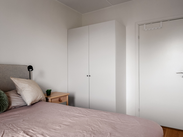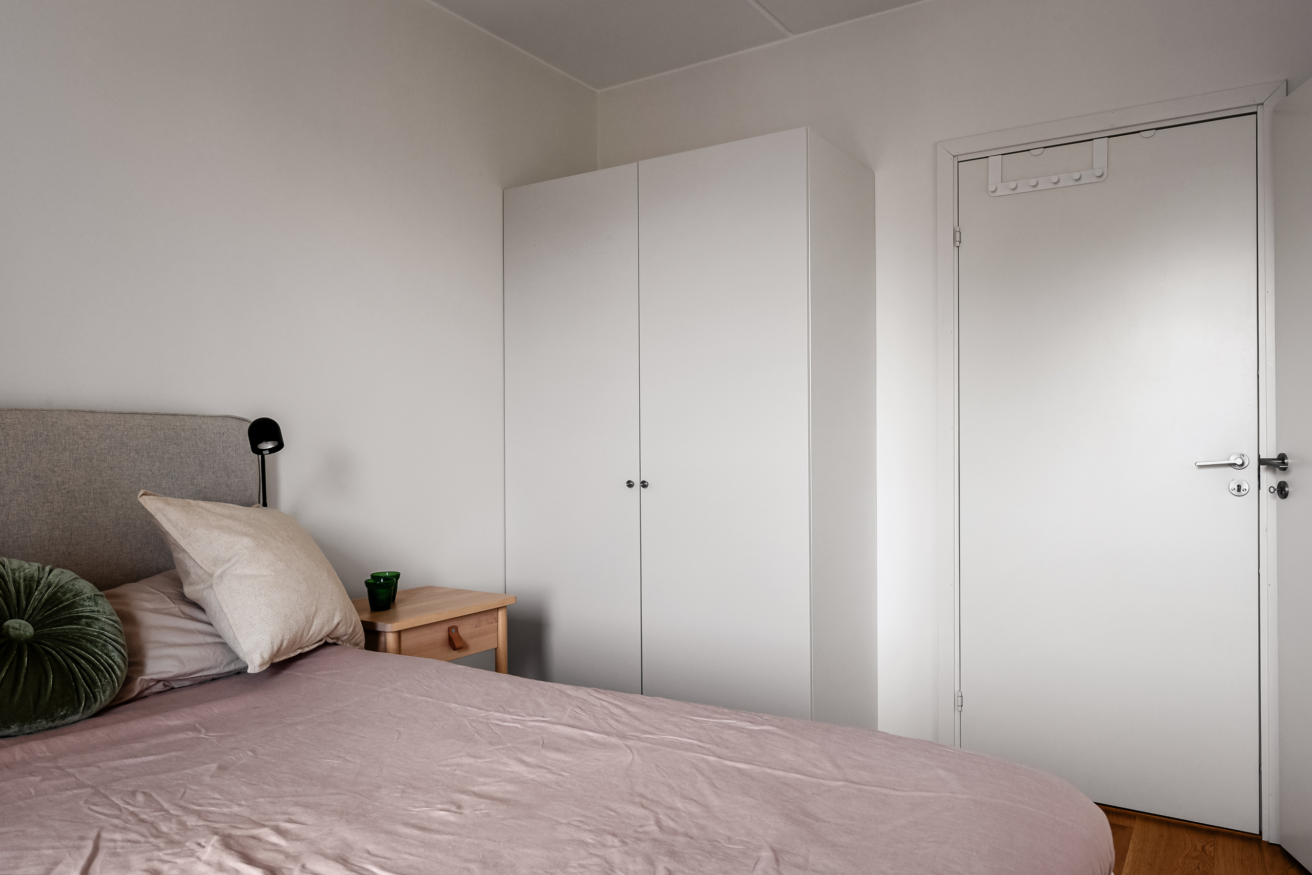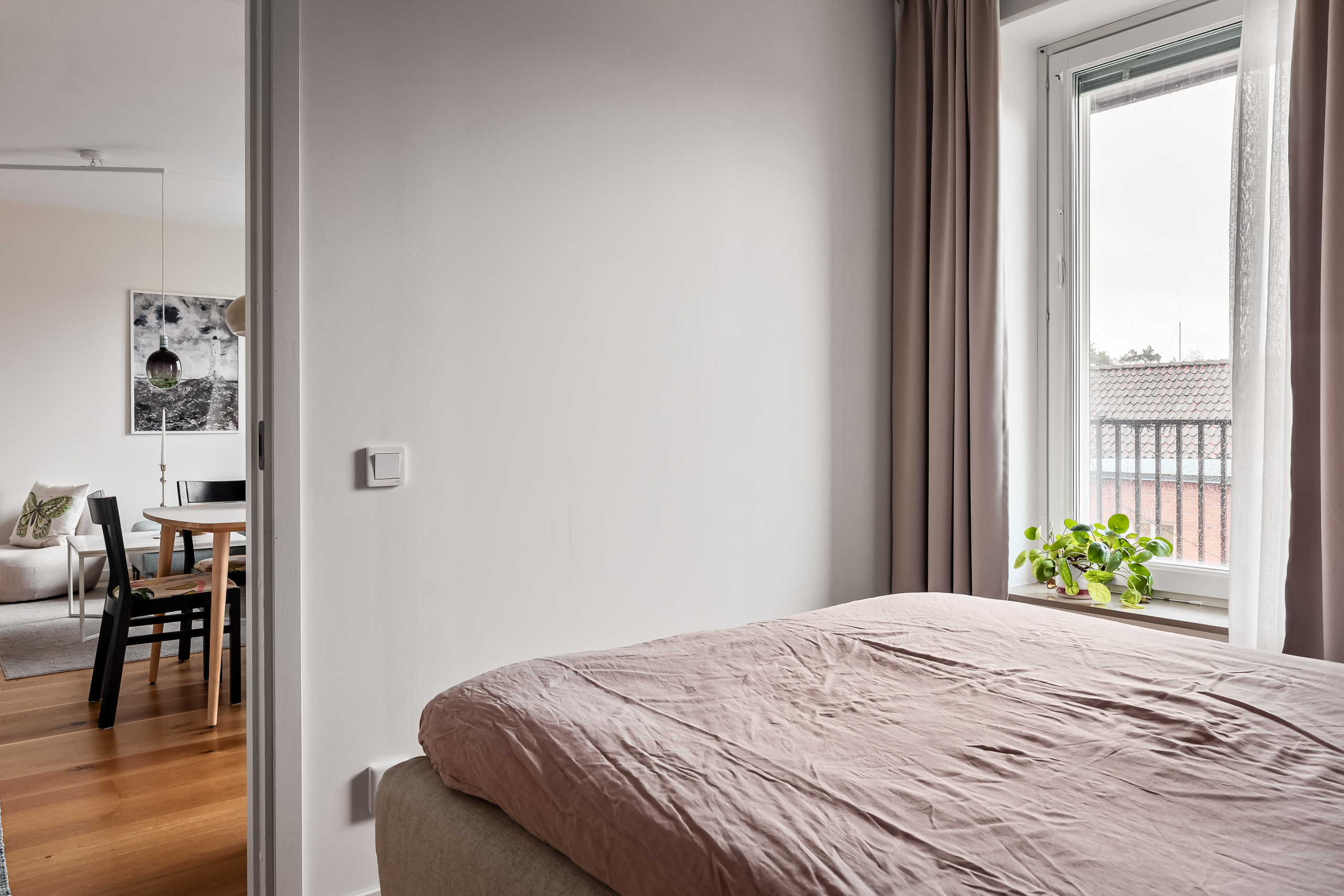 Ljusa väggar och golv i ekstavsparkett. Plats för dubbelsäng, sängbord eller annat önskat möblemang. Förvaring i garderober och klädkammare. Ljusinsläpp via fönsterparti.