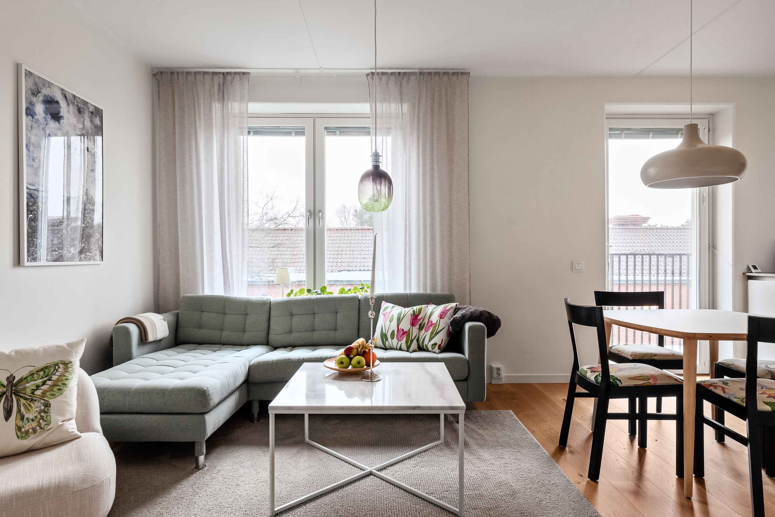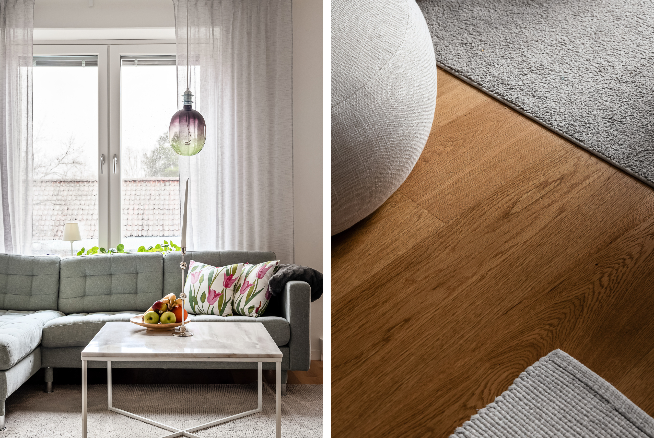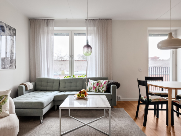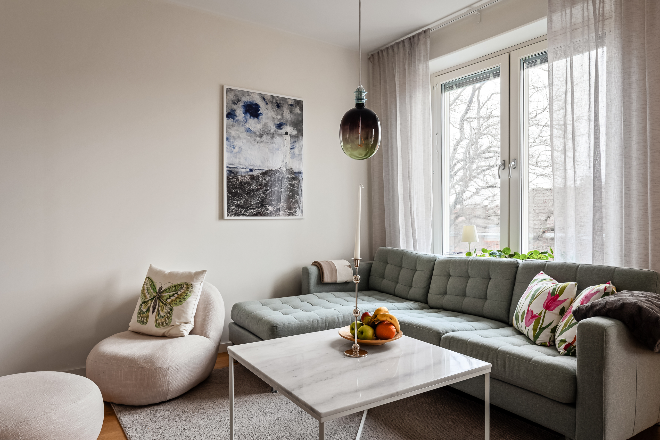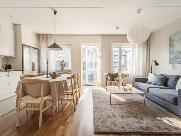 Ljusa väggar och golv i ekstavsparkett. Plats för soffa, mediamöbel, TV eller annat önskat möblemang. Ljusinsläpp via fönsterpartier. Öppen planlösning mot kök.