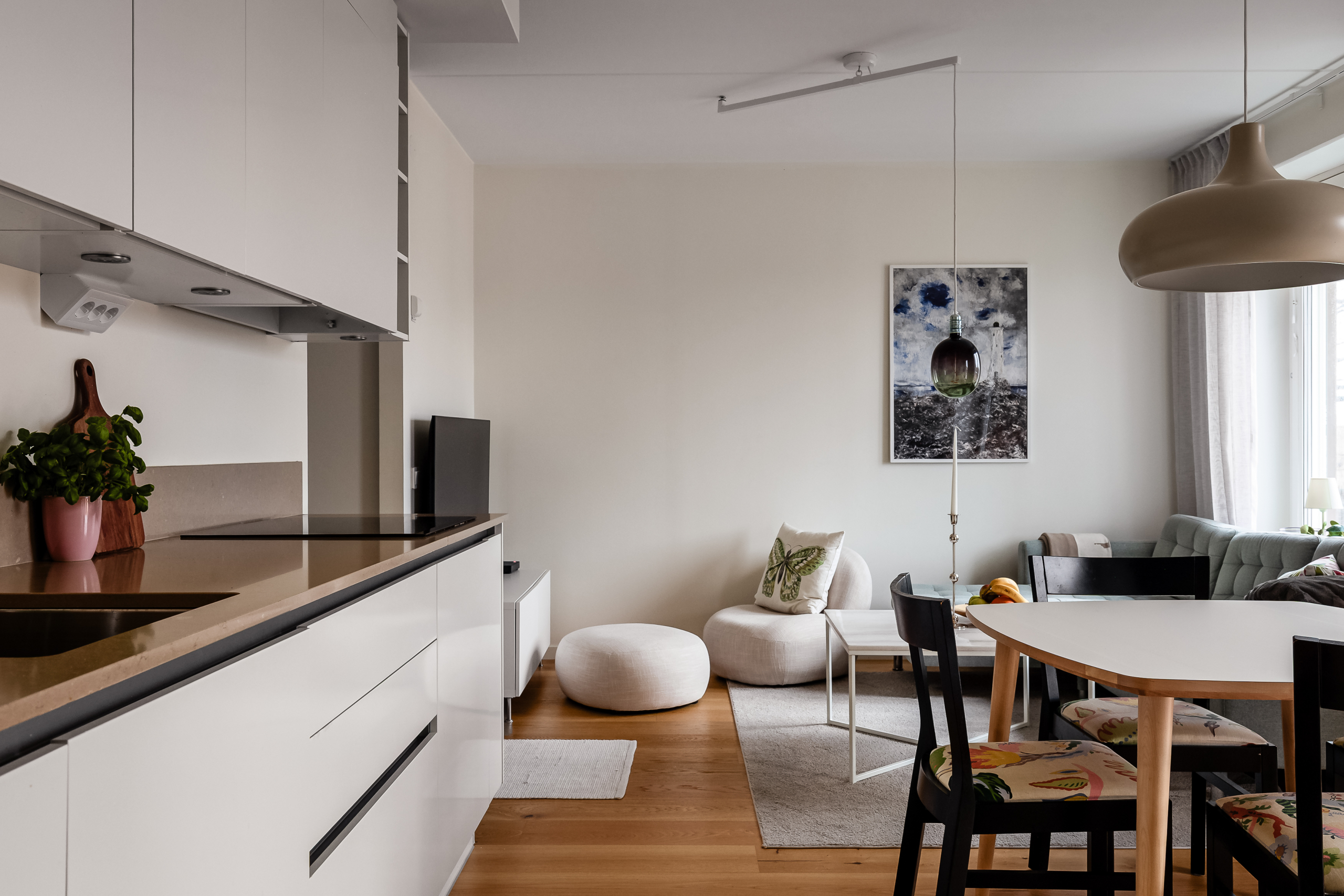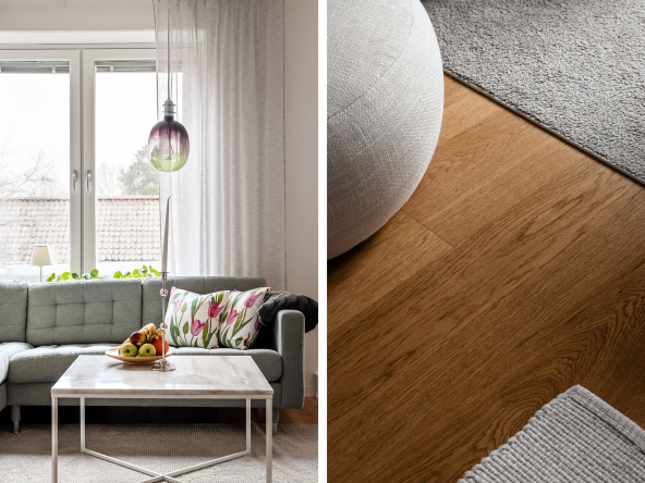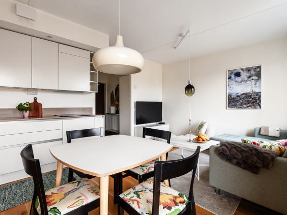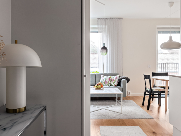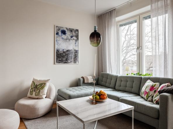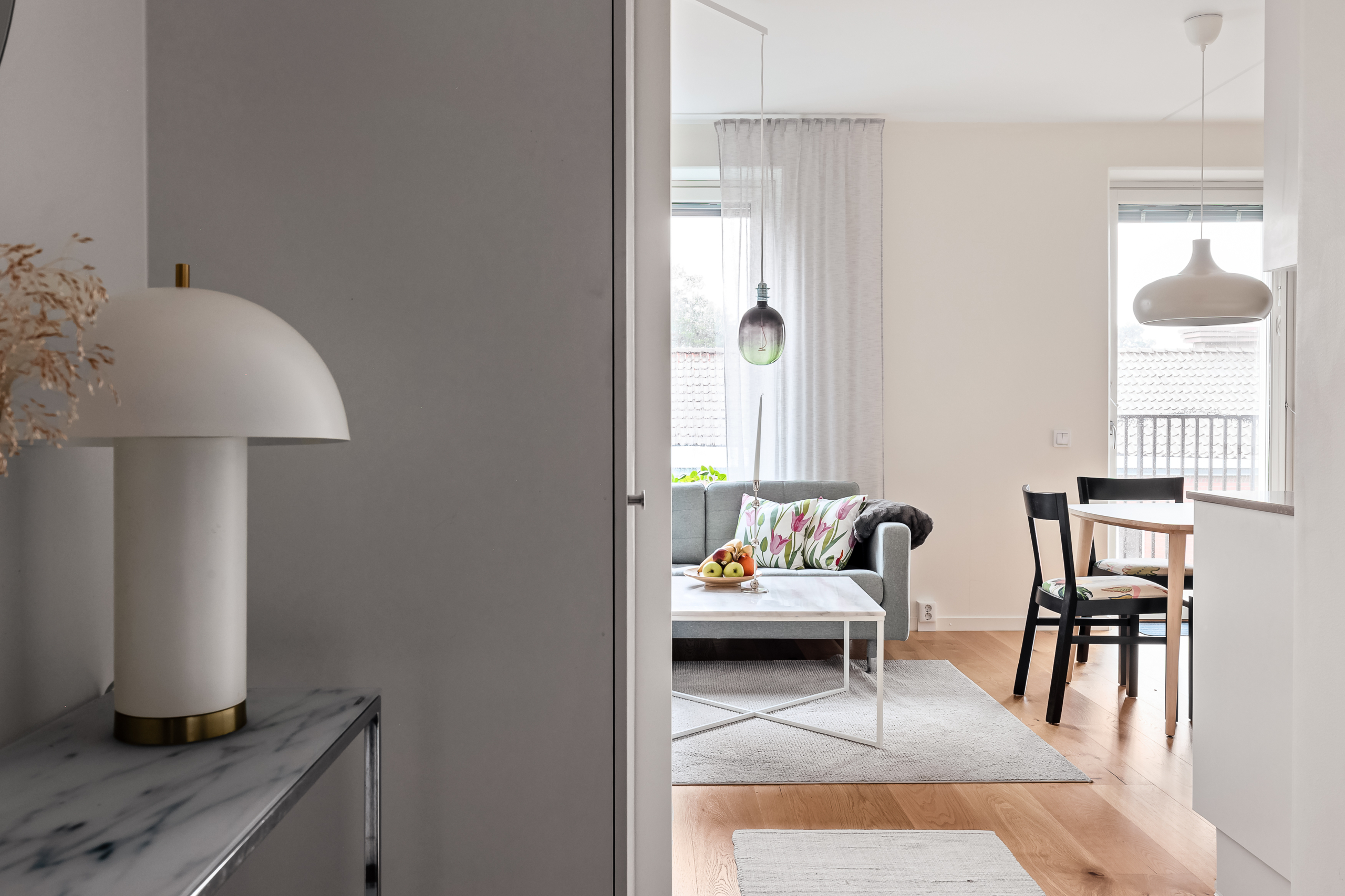 Ljusa väggar och golv i ekstavsparkett. Plats för soffa, mediamöbel, TV eller annat önskat möblemang. Ljusinsläpp via fönsterpartier. Öppen planlösning mot kök.