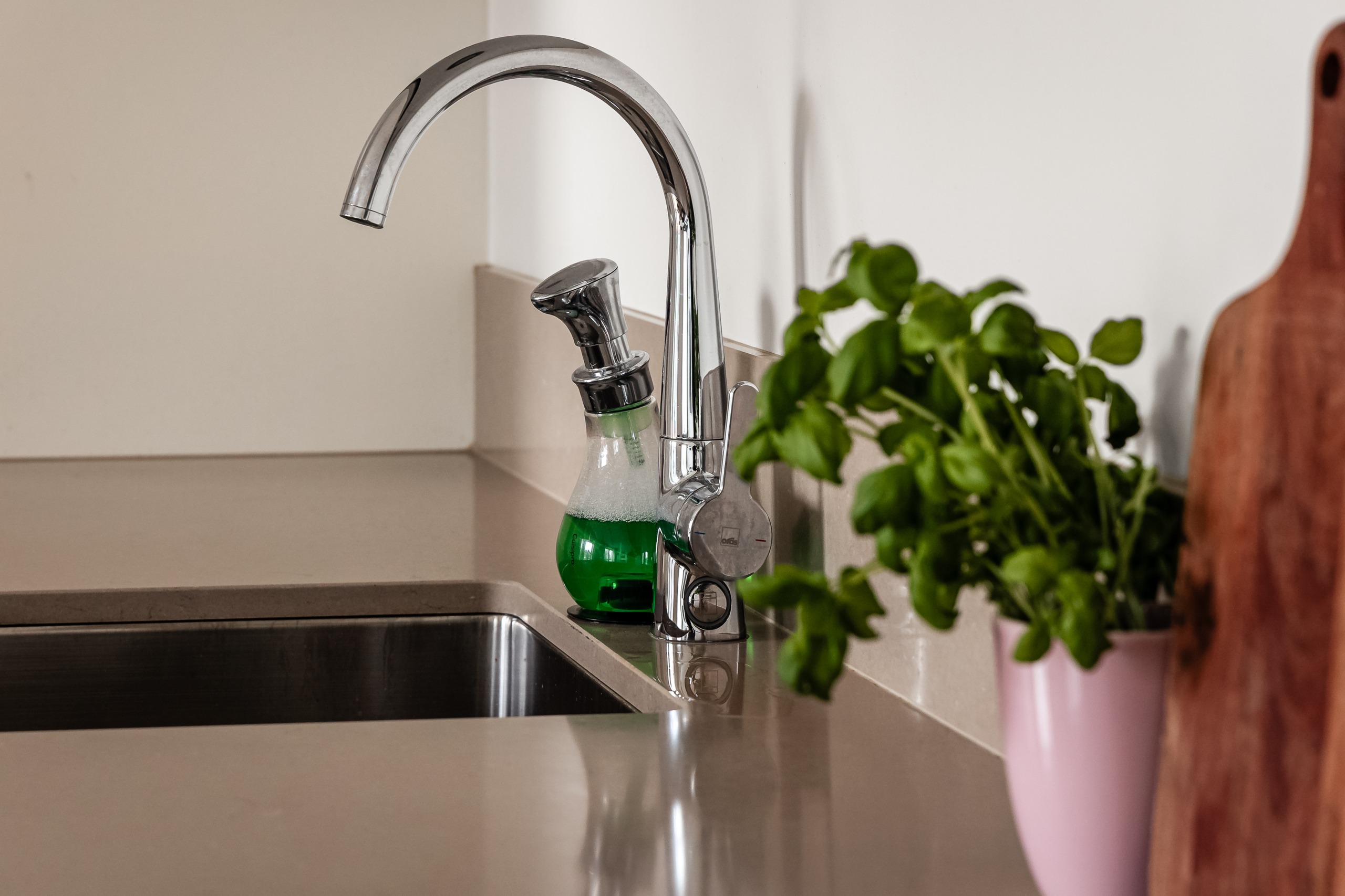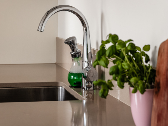 Fint HTH-kök med bänkskiva i kvartskomposit Coral Clay