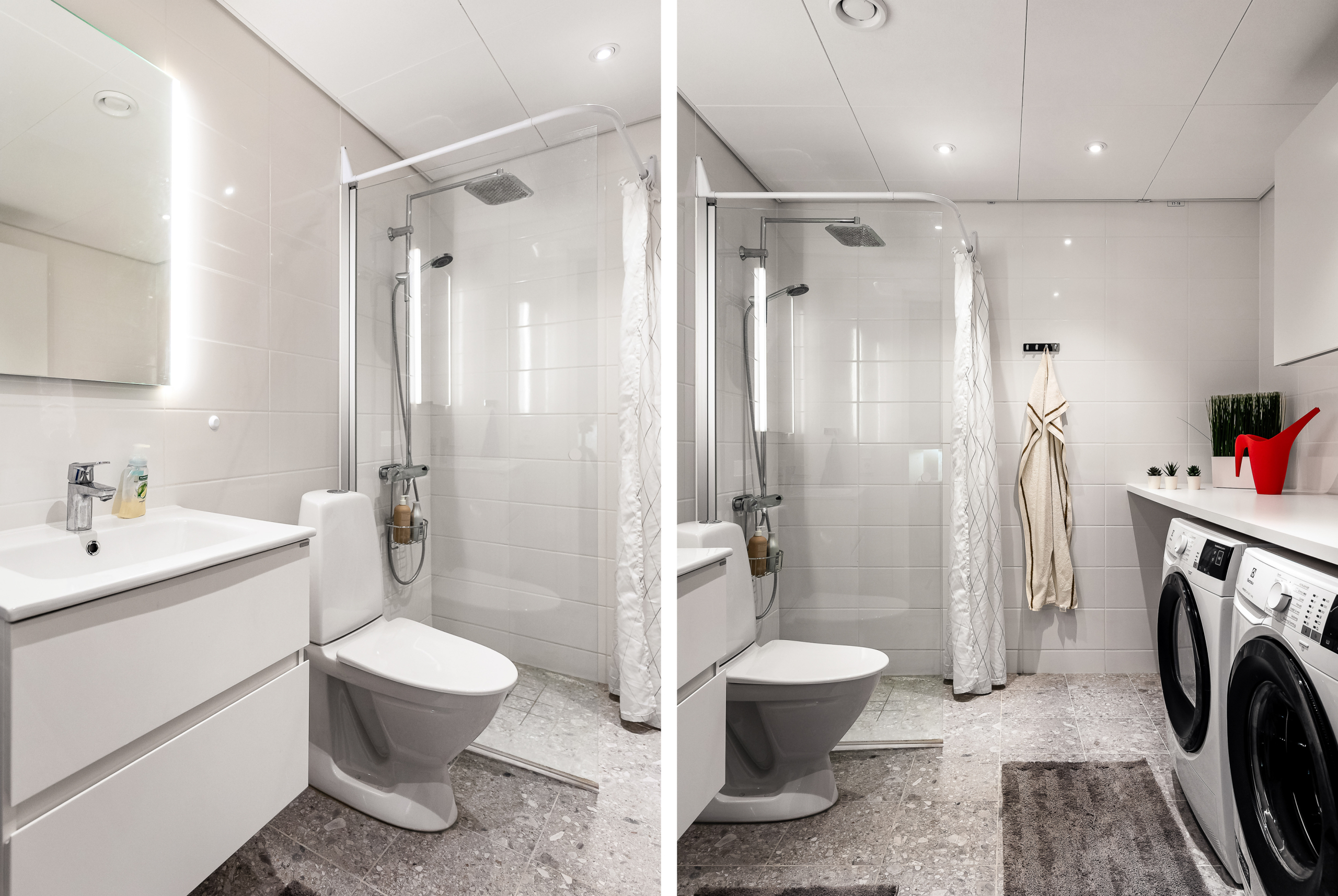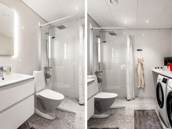 Helkalat badrum i ljusa väggar och mörkt klinkergolv. Utrustat med WC, dusch, handfat med kommod, spegel med belysning, tvättmaskin & torktumlare med arbetsbänk ovan, samt förvaring i skåp.
