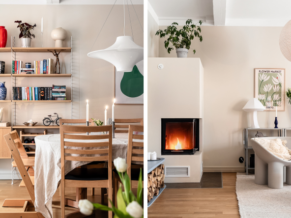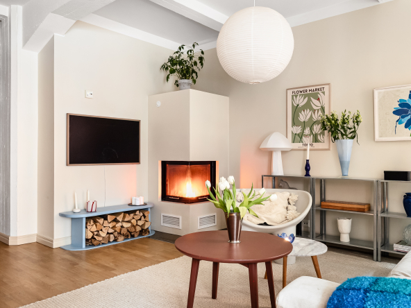 Det är en underbar känsla att kliva in i lägenheten och mötas av den öppna planlösningen, det stilrena köket och – såklart – den egna braskaminen som skapar en varm och ombonad atmosfär. Planlösningen är genomtänkt med de sociala ytorna samlade på ena sidan och sovrummen mer avskilt på den andra. Badrummet är modernt, rymligt och smakfullt, och balkongen bjuder på en härlig utsikt mot Saltsjön.