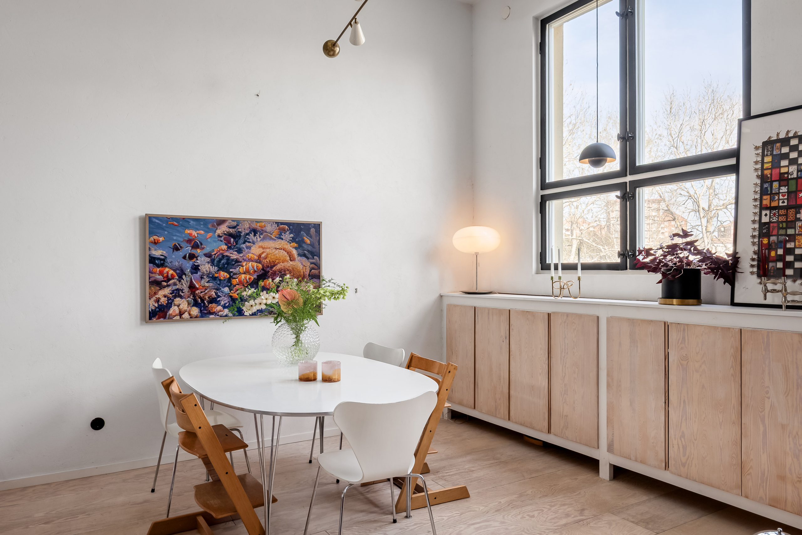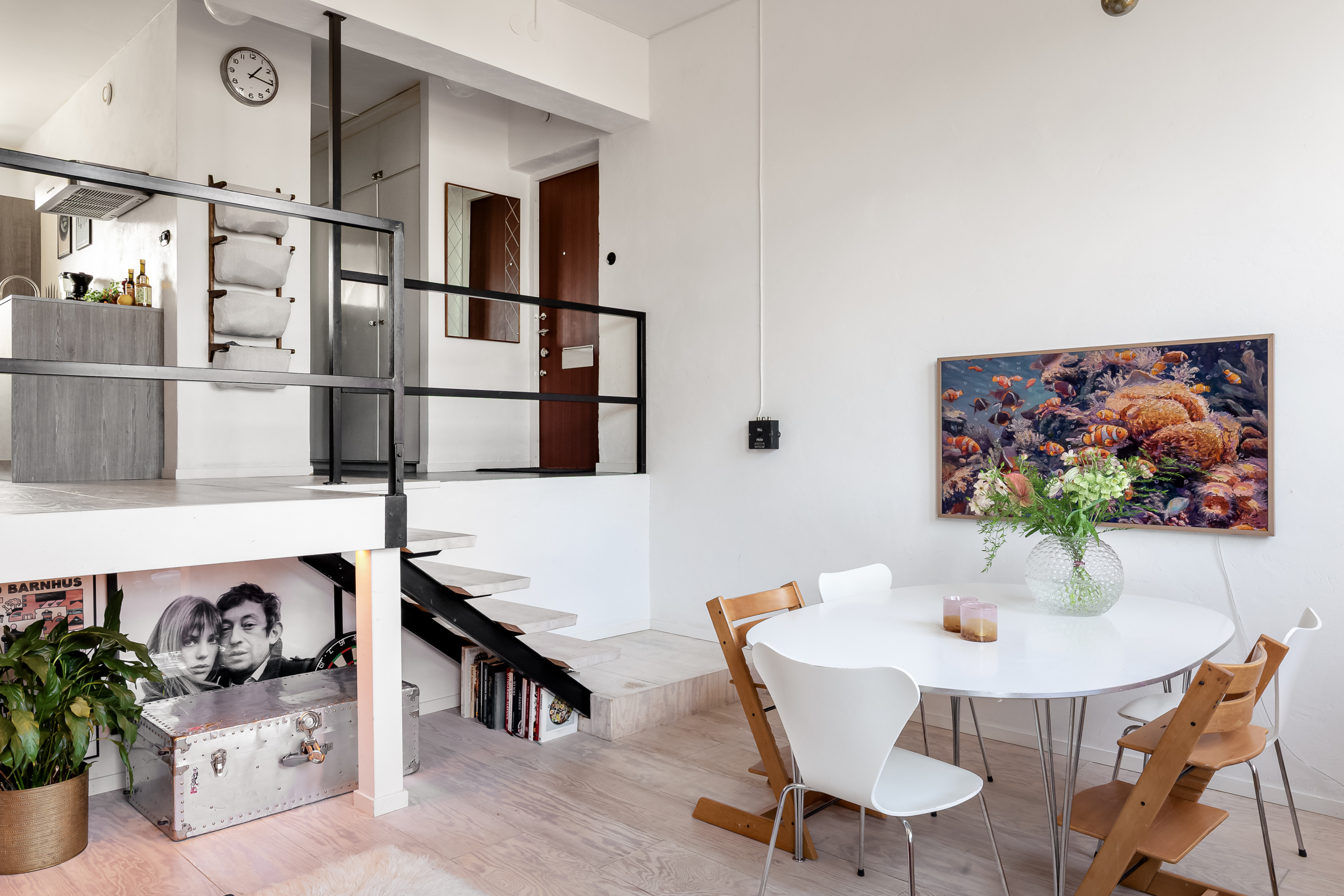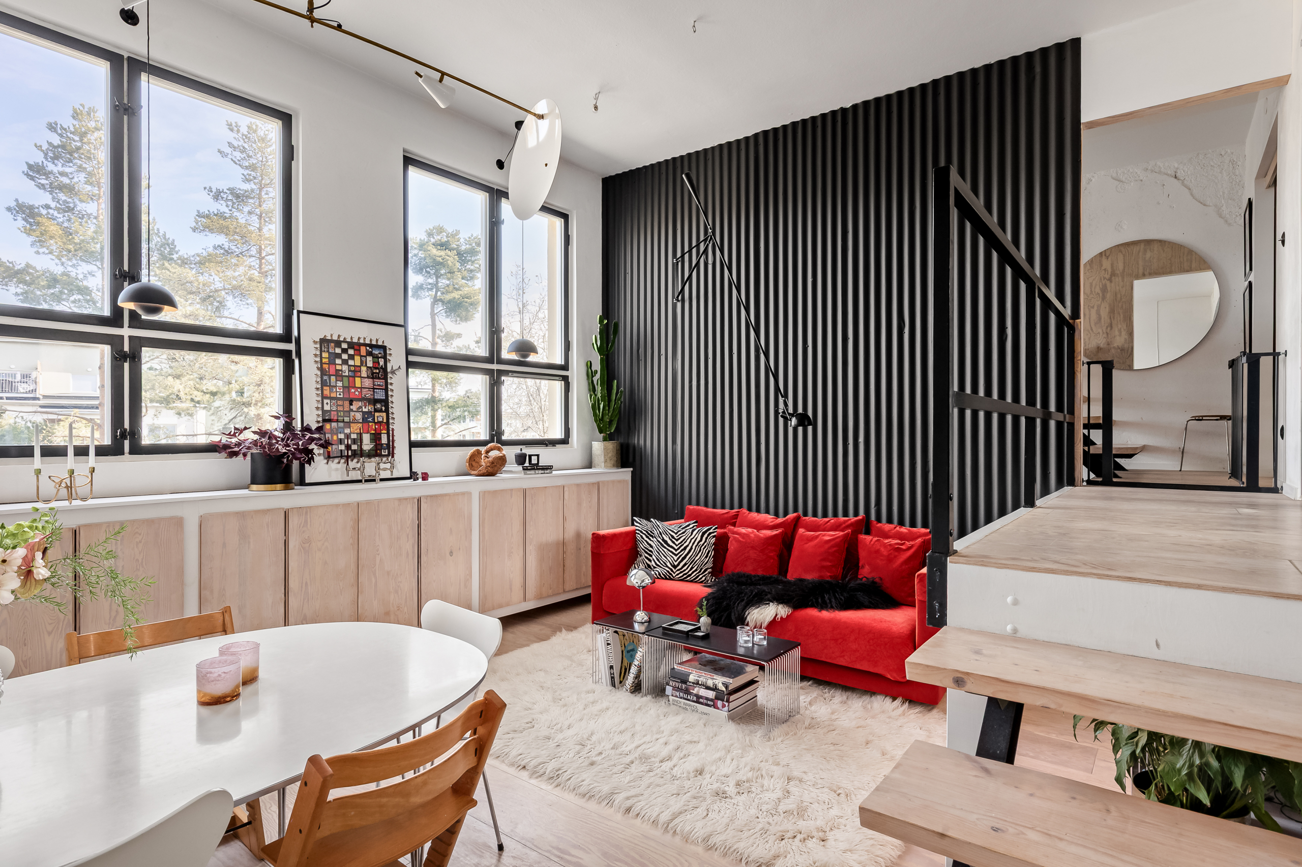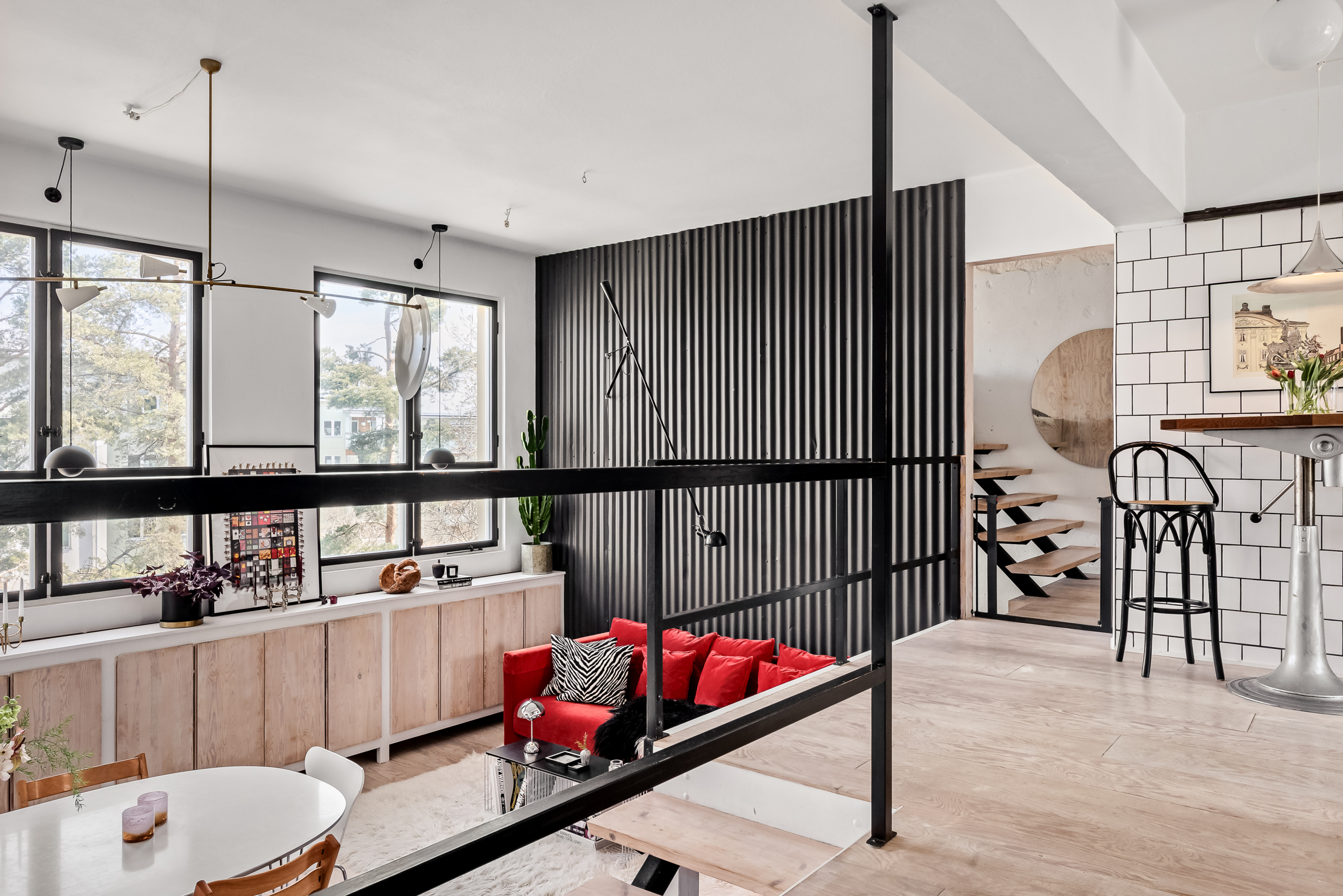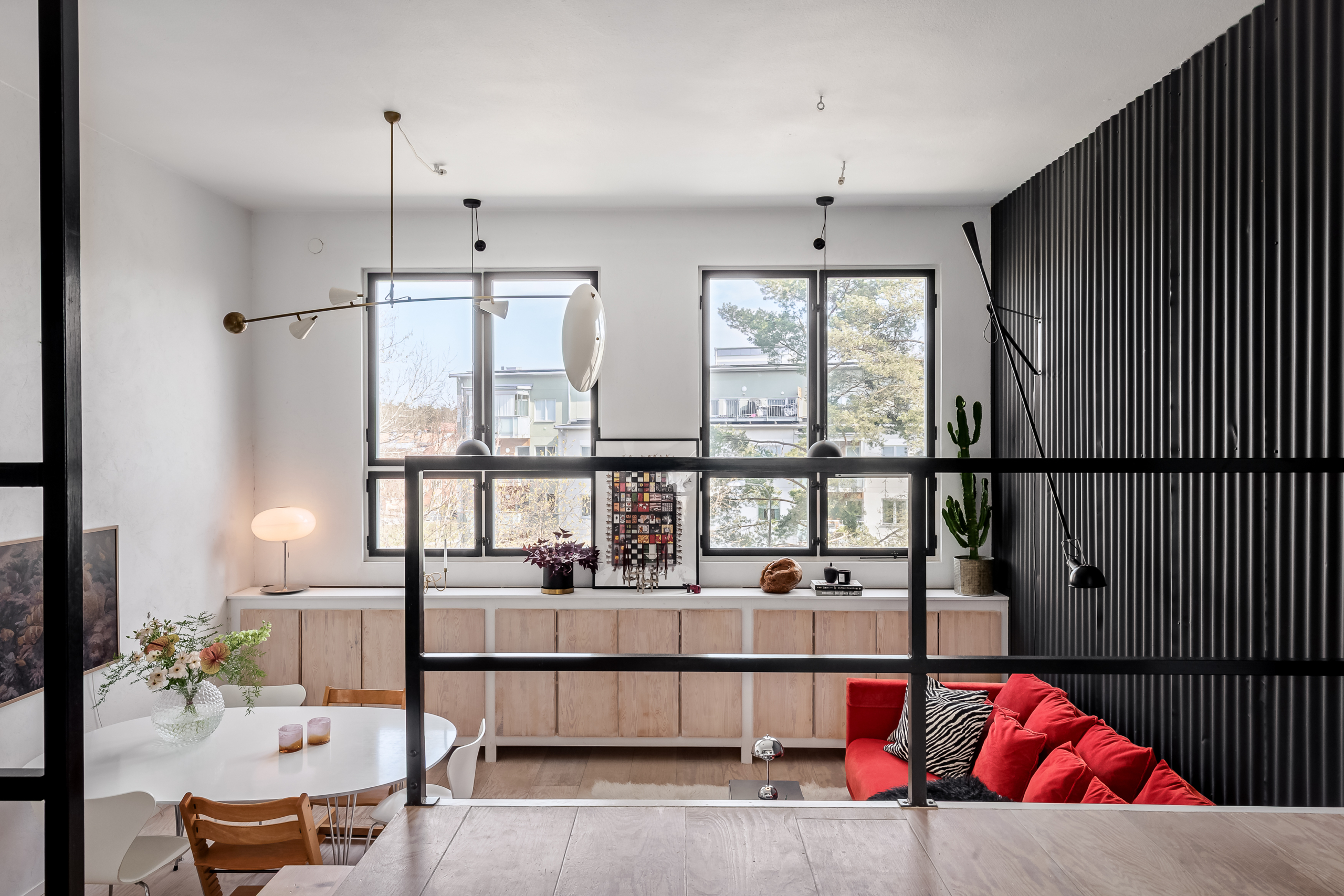 Från utsidan kan detta uppfattas som ännu en klassisk funkislägenhet, men skenet bedrar. Redan vid första steget in möts du av något utöver det vanliga – imponerande fönsterpartier, en takhöjd om över 4 meter och en dynamisk planlösning med spännande nivåskillnader som skapar liv och rymd i hela hemmet.