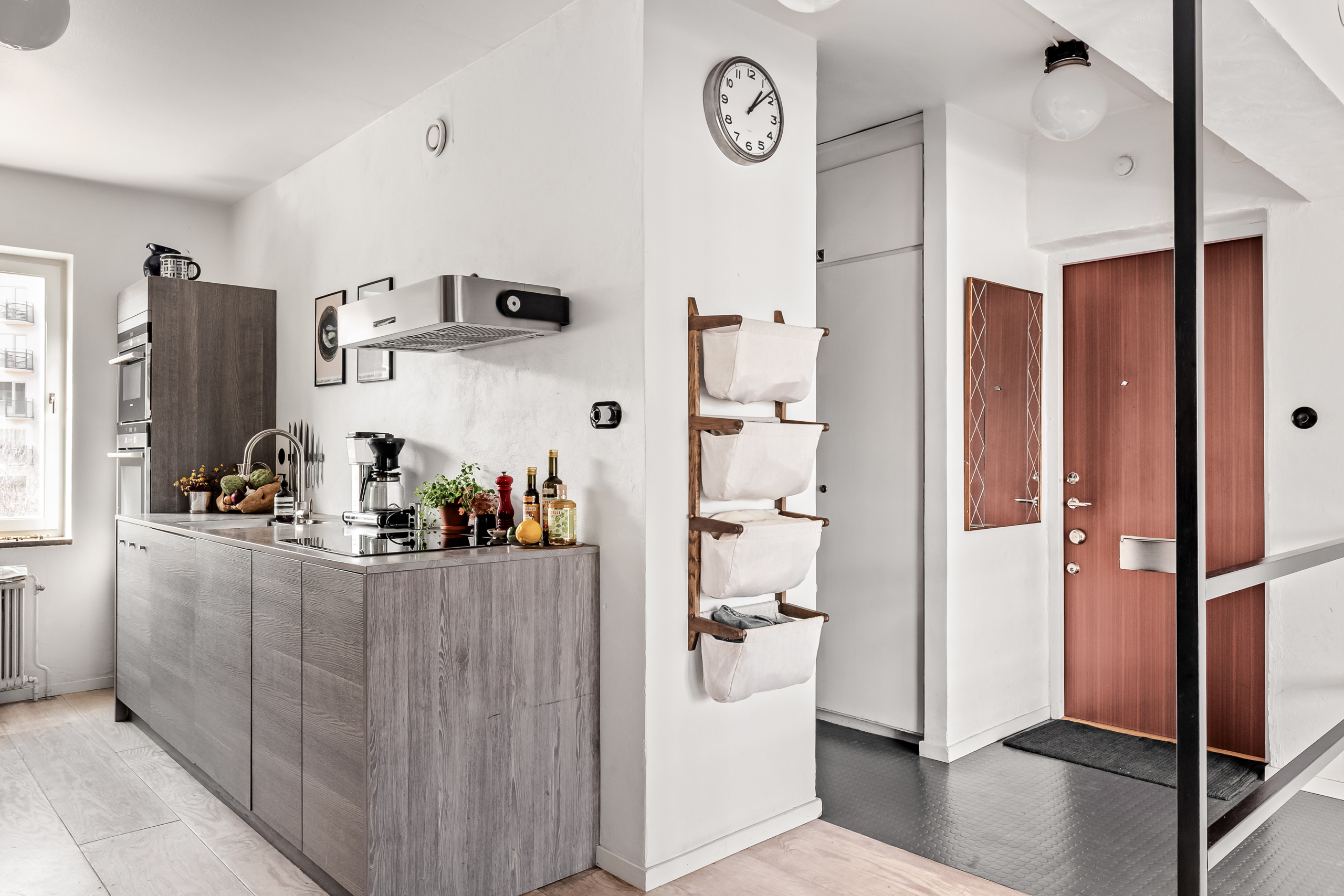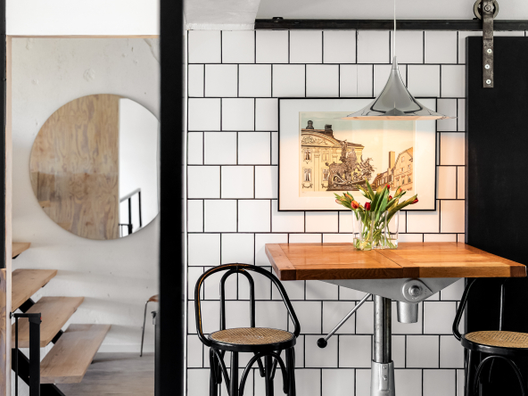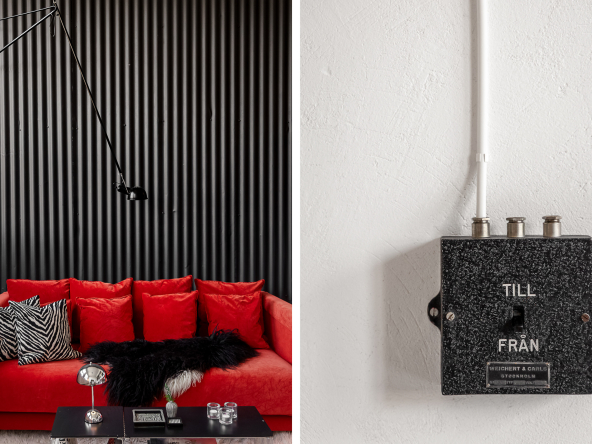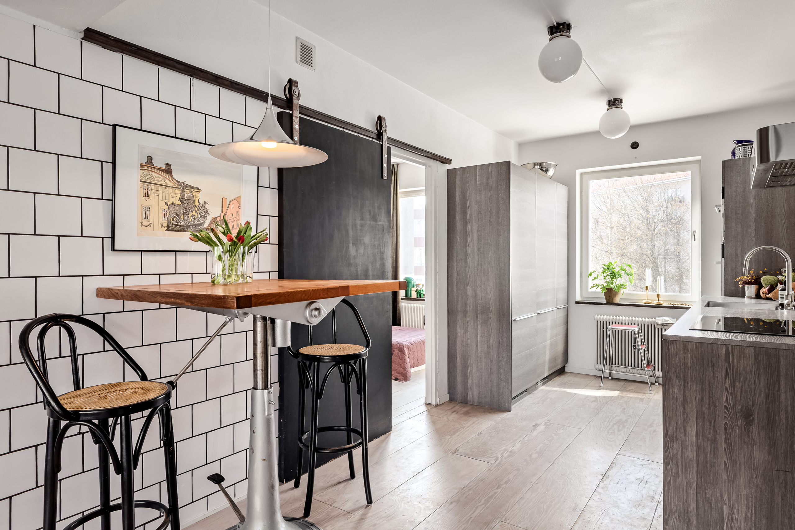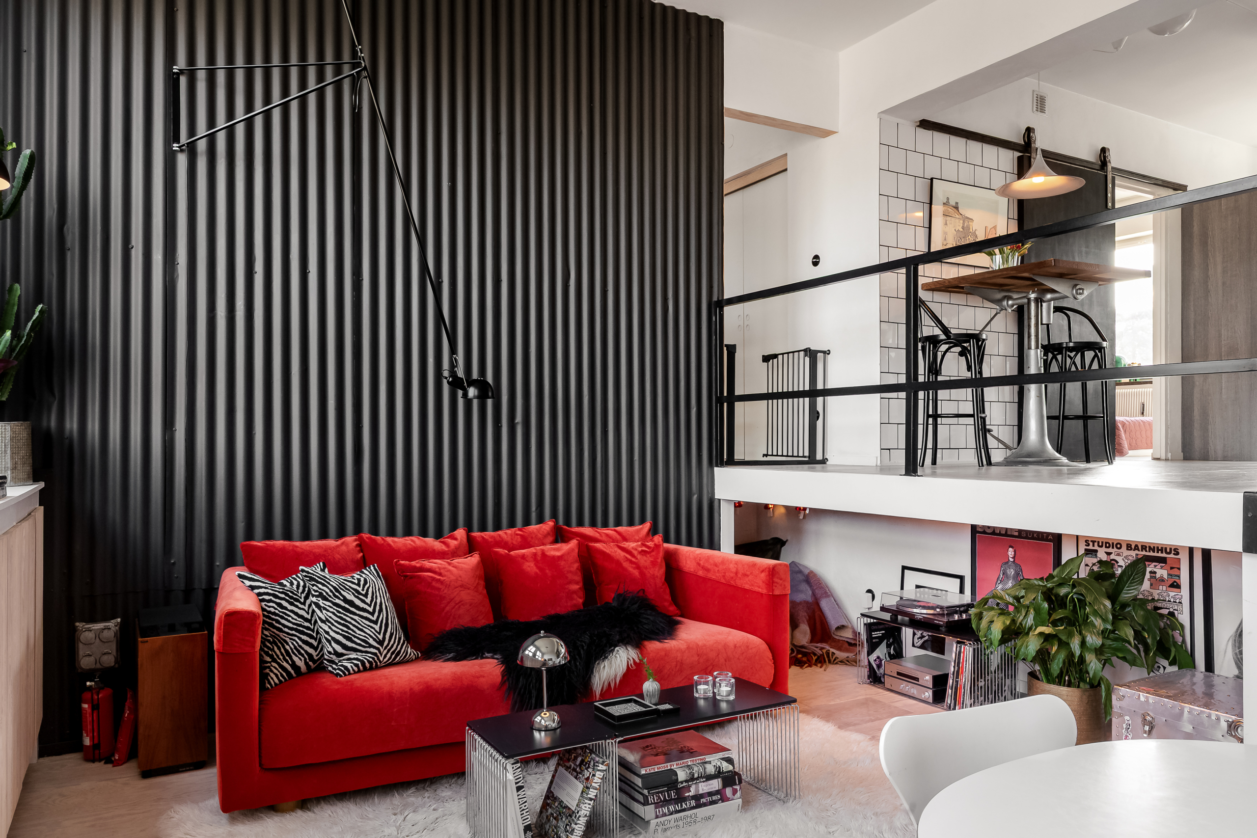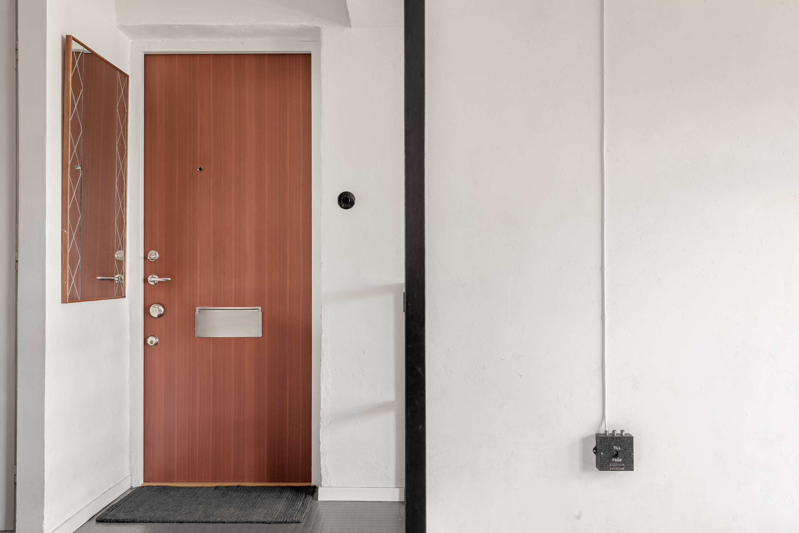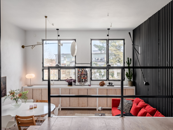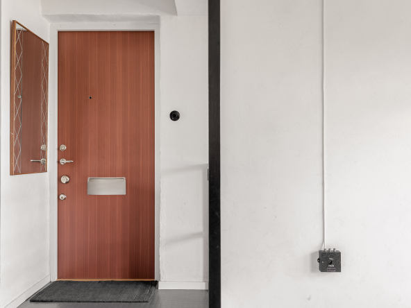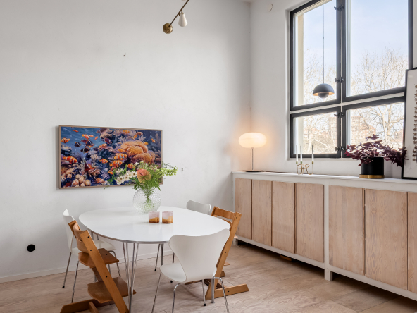 Från utsidan kan detta uppfattas som ännu en klassisk funkislägenhet, men skenet bedrar. Redan vid första steget in möts du av något utöver det vanliga – imponerande fönsterpartier, en takhöjd om över 4 meter och en dynamisk planlösning med spännande nivåskillnader som skapar liv och rymd i hela hemmet.