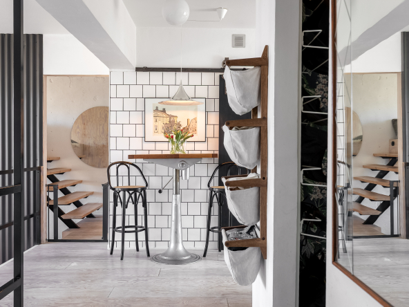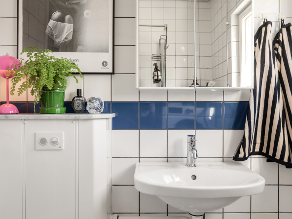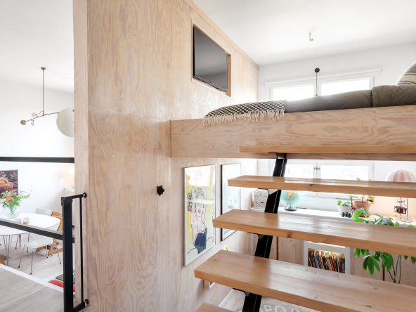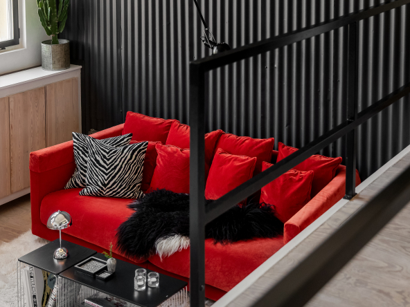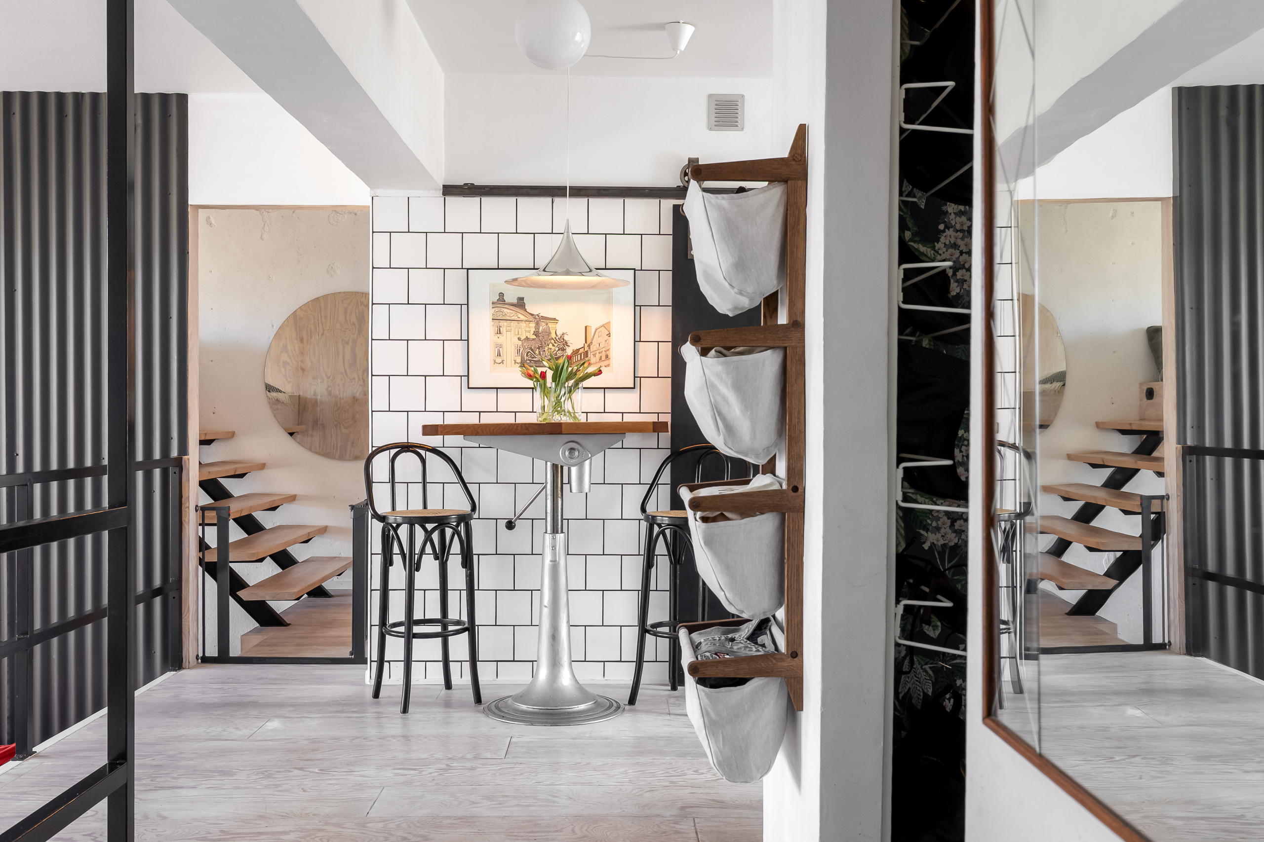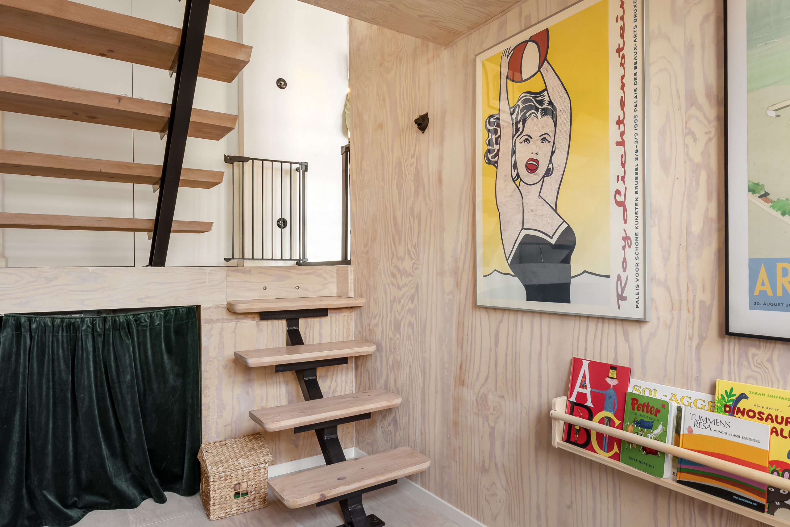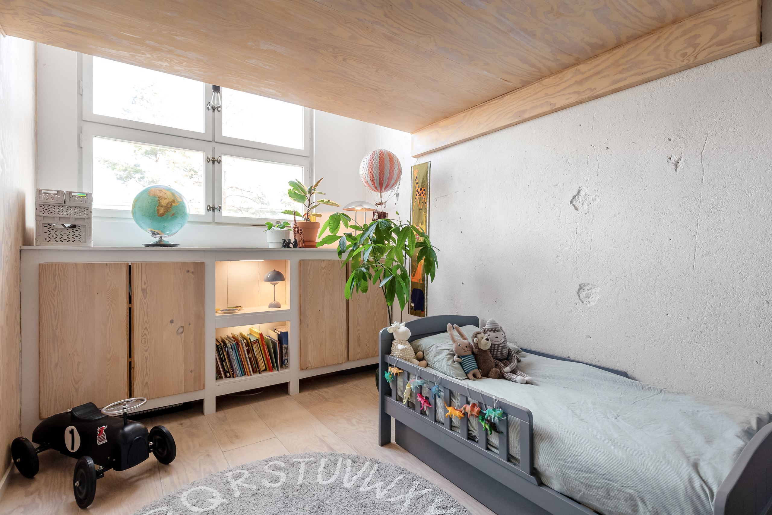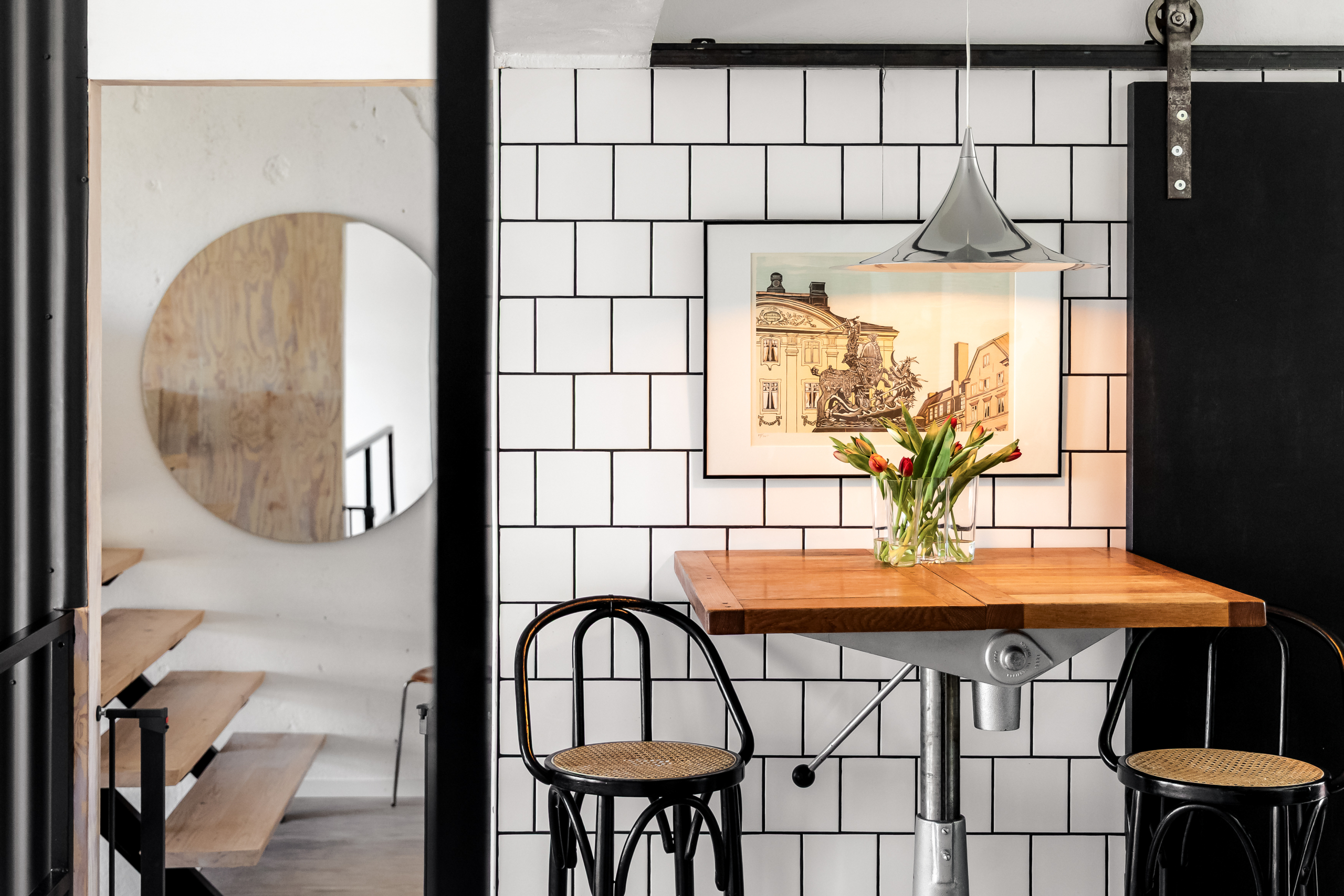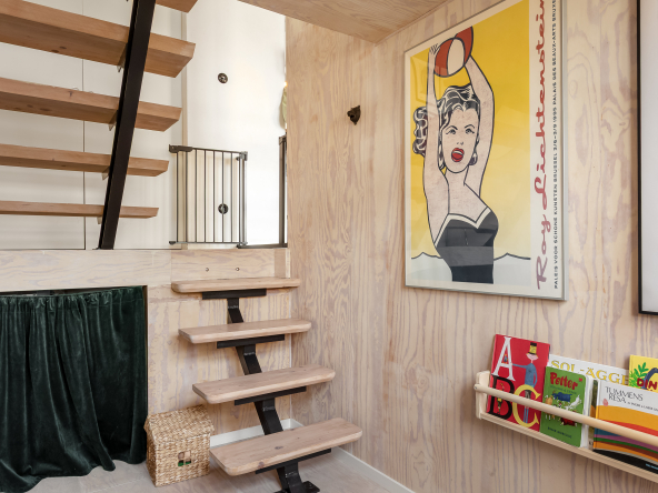 Från utsidan kan detta uppfattas som ännu en klassisk funkislägenhet, men skenet bedrar. Redan vid första steget in möts du av något utöver det vanliga – imponerande fönsterpartier, en takhöjd om över 4 meter och en dynamisk planlösning med spännande nivåskillnader som skapar liv och rymd i hela hemmet.
